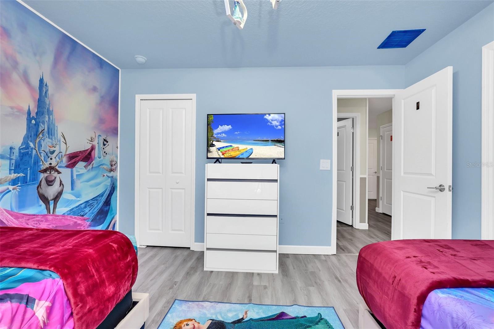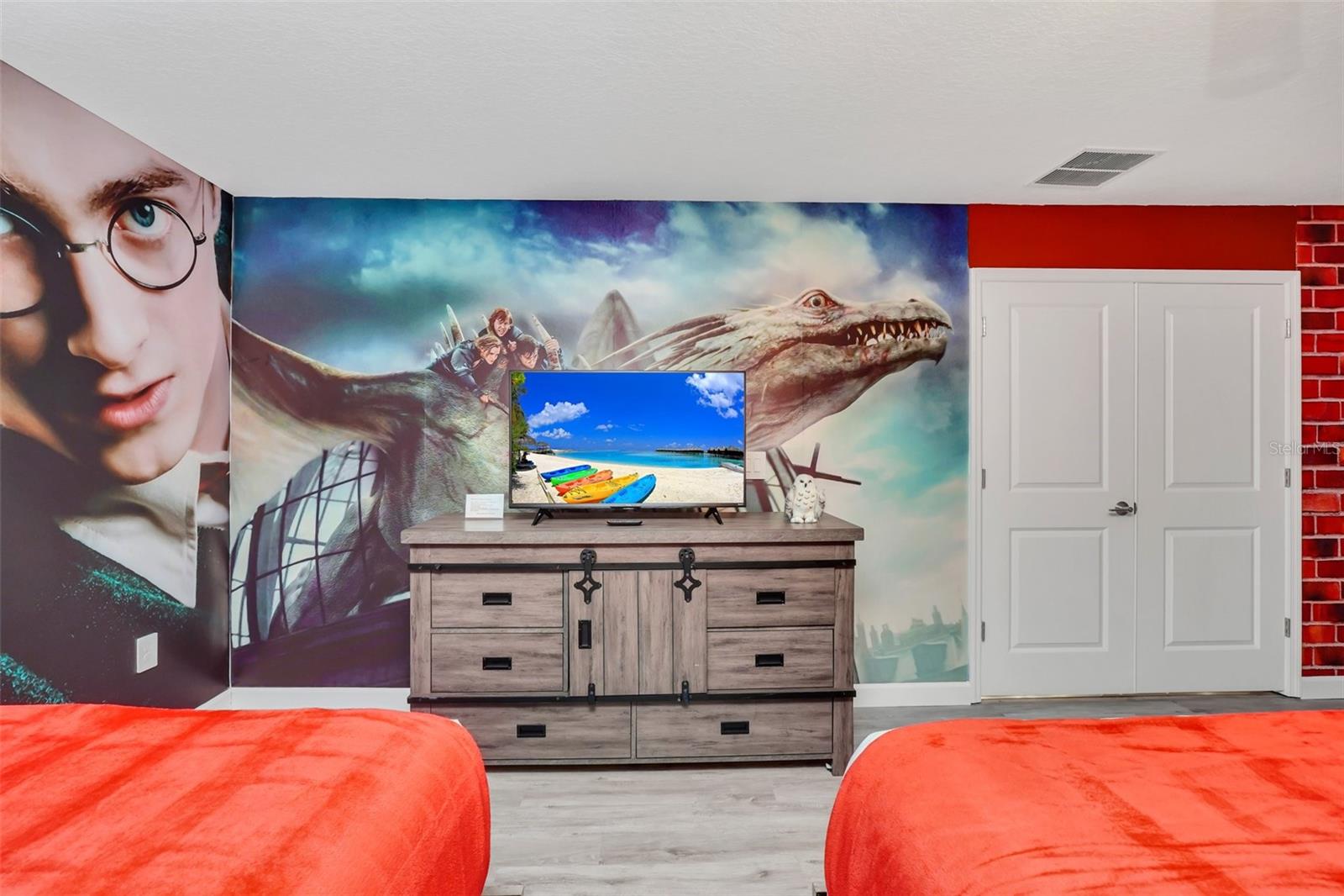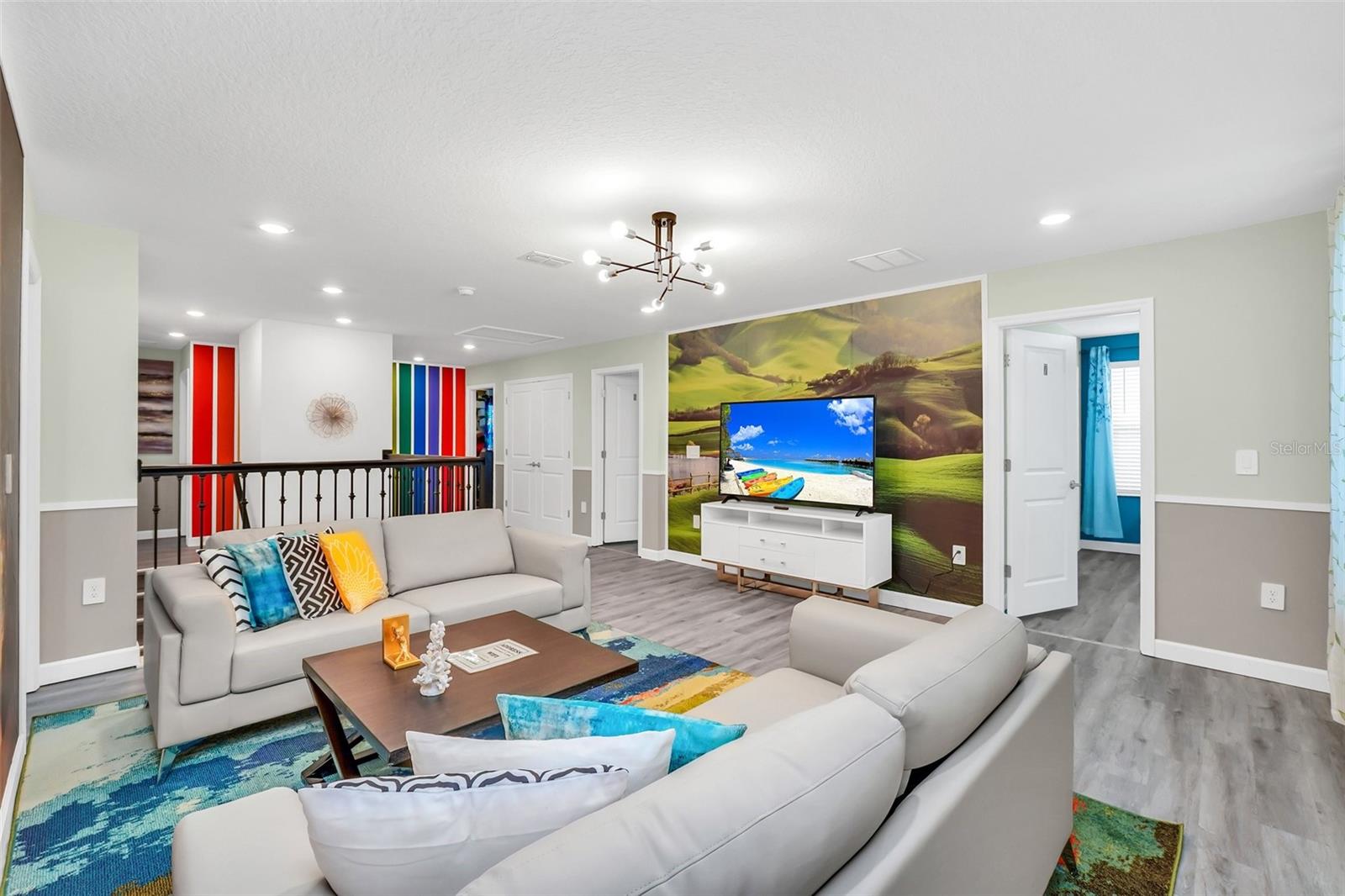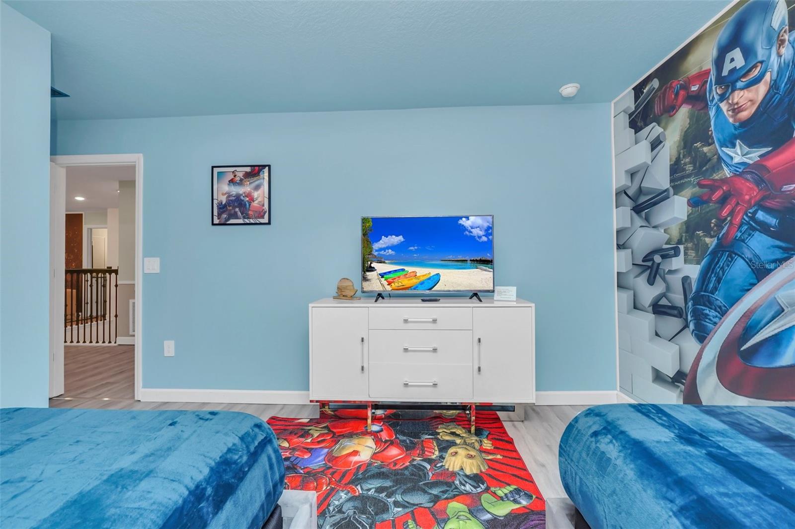 PROFESSIONAL Designed FULLY-FURNISHED SHORT-RETNAL HOUSE! LEASED ENERGY-SAVING SOLAR PANELS IN PLACE!VYNLE FLOORING IN ALL BEDROOMS AND LOFT!TURN KEY READY to start making money! Welcome to this luxurious 9-bedroom property Situated in the highly sought-after gated resort community of Champions Gate. Featuring a spacious open floor plan, this professionally decorated home boasts a stylish gourmet kitchen, complete with stainless steel appliances and an oversized island, seamlessly connects to the dining and living areas. The space naturally flows into a large screened in pool area, where you can enjoy the ultimate Florida lifestyle, ideal for relaxation and entertainment. With no rear neighbors, you’ll also enjoy added privacy. The main floor also features two beautifully decorated bedrooms, each with en-suite bathrooms, including the spacious primary suite for easy access to the pool. The game room at this home is an entertainment haven, designed to provide endless fun for guests of all ages. Whether you’re shooting hoops on the indoor basketball court, testing your skills with a game of foosball, or enjoying the nostalgia of classic arcade games, there’s something for everyone. The pool table offers the perfect setting for friendly competition, while the extra fridge ensures plenty of cold drinks and snacks are always within reach, making it ideal for longer gaming sessions. The living room and loft of this home are perfect for movie nights, sports games, or binge-watching your favorite shows, thanks to the stunning 75” TV in each space. The large screens provide a cinematic viewing experience, creating the ultimate entertainment zones for family and friends to gather. The second floor is designed with fun, themed bedrooms that bring excitement to every stay. From Disney and Star Wars to Avengers and Harry Potter, each room is professionally decorated to create a magical atmosphere that will captivate guests of all ages. This 9 bedroom has even more to offer: The solar panels on this vacation home are an outstanding feature that not only enhance sustainability but also provide significant cost savings. By harnessing the power of the sun, these leased and assumable solar panels help reduce electricity costs, saving up to $500/month during the summer and $300-$400/month during the winter. Vinyl flooring, ideal for high-traffic areas and easier to clean between guests, offers a sleek, modern aesthetic without the need for frequent deep cleaning, making it a practical choice for vacation homes. For additional enjoyment, residents and guests enjoy easy access to multiple resort-style clubhouses, fitness centers, pools, a lazy river, waterslide, tennis and volleyball courts, a tiki bar, and so much more. The strong rental potential and consistent popularity with vacationers offer great opportunities for consistent income and long-term investment appreciation. Whether you’re seeking a vacation retreat or an income-generating property, this property is a must-see. Schedule your showing today and make this dream home yours!