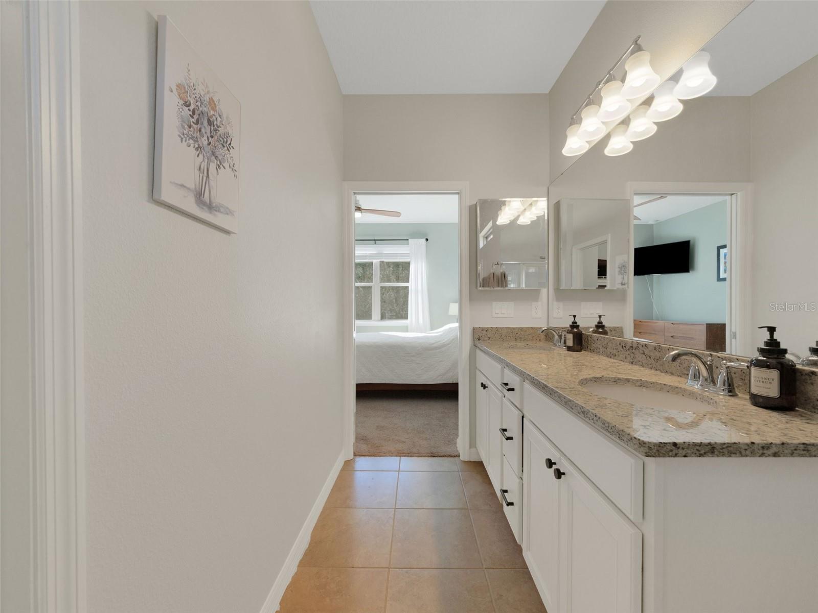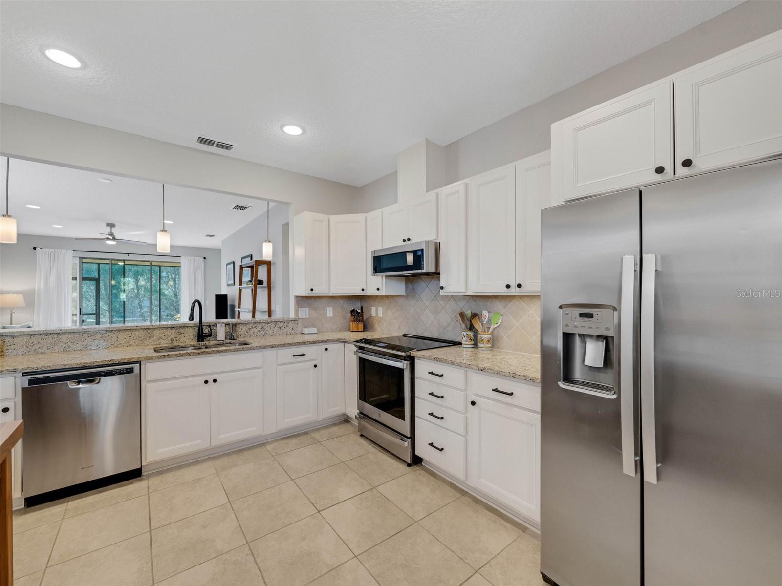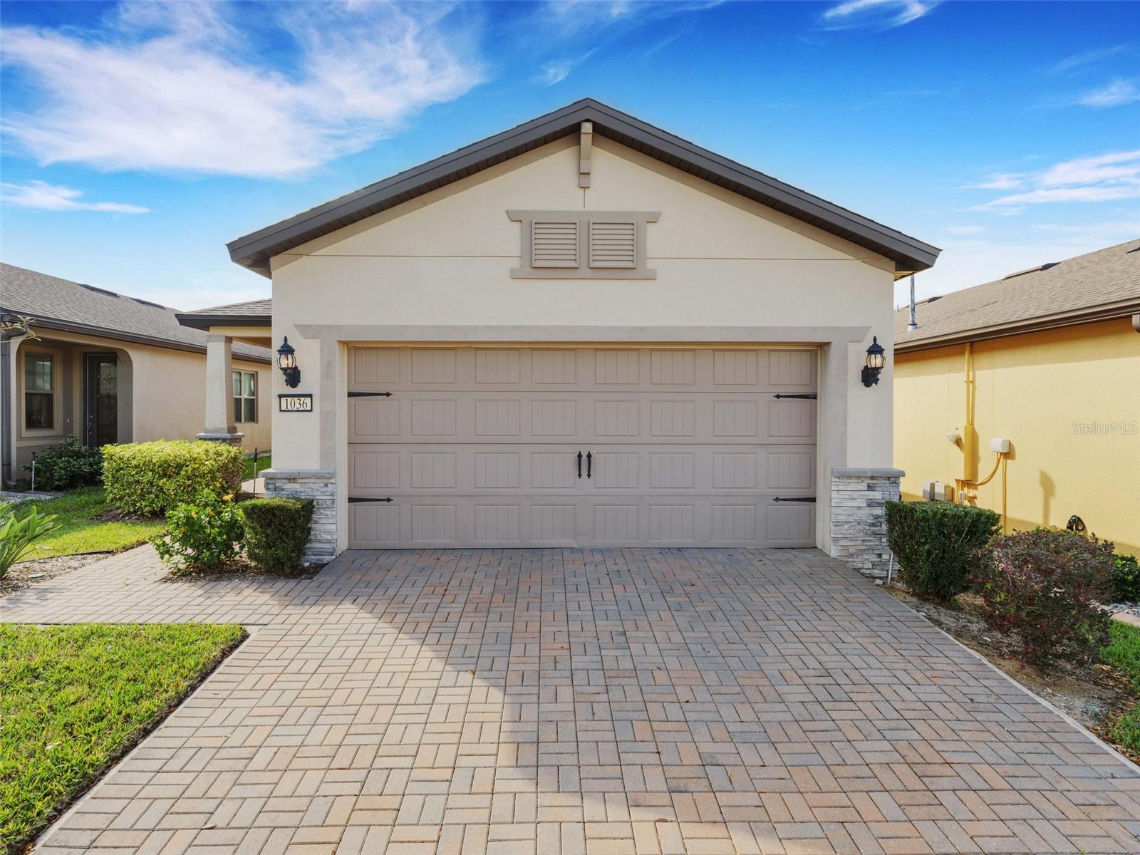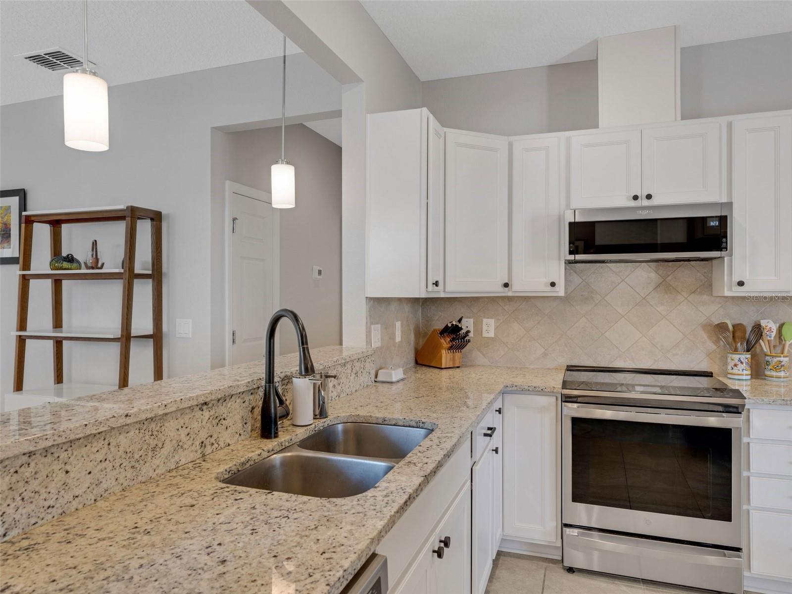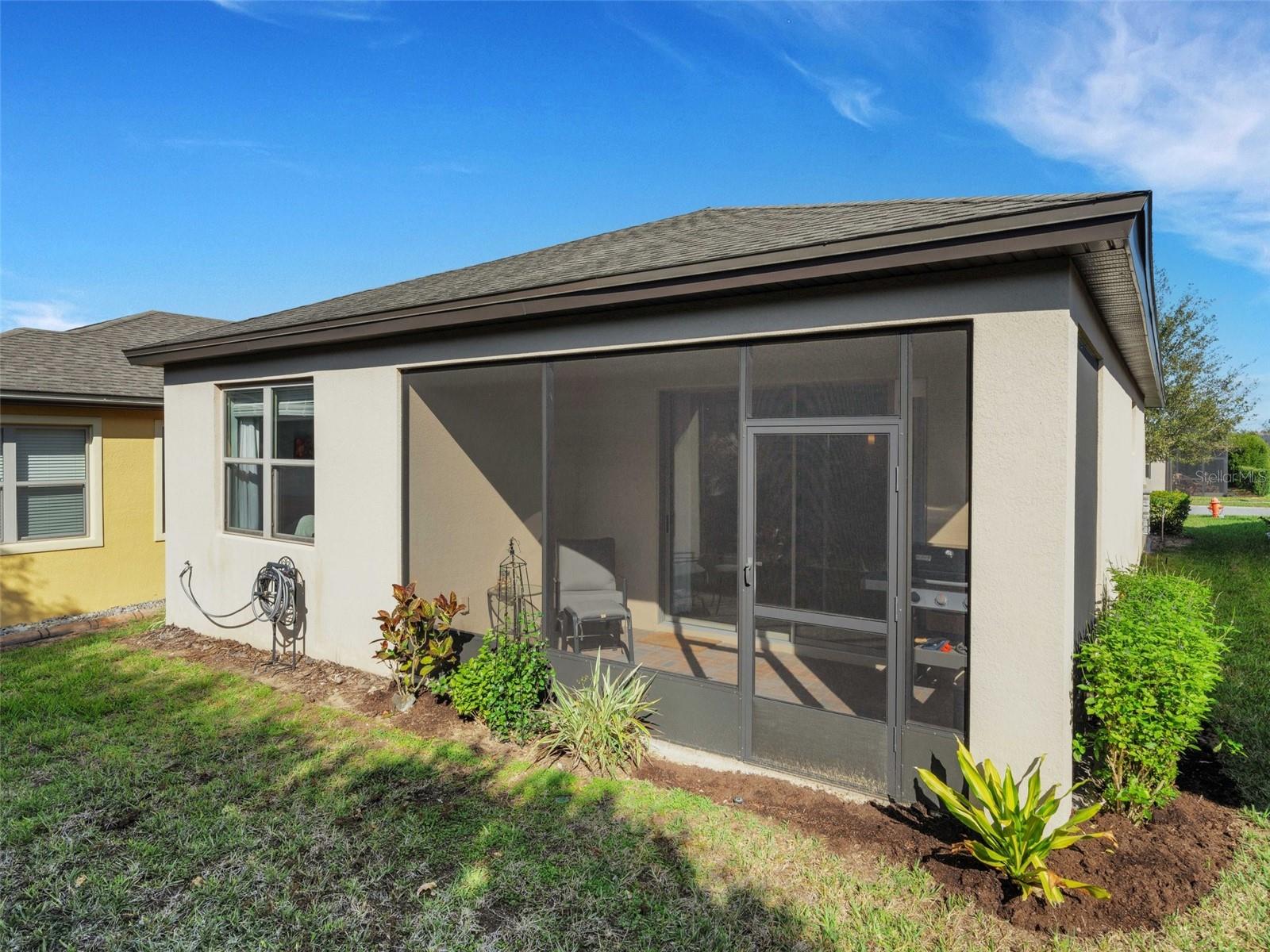 Located in the desired 55+ community of Del Webb Orlando, this immaculate Noir Coast model features 2 bedrooms and 2 bathrooms. The large kitchen has upgraded white cabinets, granite countertops and stainless steel appliances, and recent upgrades including additional cabinetry, a moveable island, new low-profile microwave, and a GE induction range. The living area has porcelain tile floors and large sliding glass doors that open up to a covered and screened lanai with a natural-gas grill. The master suite is in the rear of the home and includes an oversized walk-in closet and master bath featuring double sinks, a large walk-in shower with glass doors, a new medicine cabinet and upgraded fixtures. The laundry room complete with additional cabinetry is conveniently located near the master bedroom. The guest suite is located separately in the front of the home for privacy. Additional upgrades include a smart lock on the front door, updated lighting including ceiling fans, whole-house surge protection, and an epoxy floor in the garage. A termite warranty bond has been paid through 2025. The interior of the home has also been newly painted. The $425 semi-annual HOA fee provides 24x7 staffed security gate and master association-owned private road maintenance. Adjacent to recently renovated 18-hole White Heron Golf Club. The $277 monthly Del Webb HOA fee includes exclusive access to resident-owned 30,000+ SF Montecito clubhouse and amenities. DEL WEBB ORLANDO is a 55+ community with a tavern, indoor walking track, fitness center, indoor and outdoor pools and spas with locker rooms and showers, billiards, ping pong, craft room, and a ballroom for special events. Outdoor activities include pickleball, tennis, bocce, basketball, shuffleboard, community gardening center, an outdoor amphitheater, large brick fire pit and large screened-in gazebo over the water. Miles of biking and walking trails within Ridgewood Lakes gated community. Located conveniently to shopping at Posner Park (4 miles), Disney World, Universal Studios, Orlando & Central FL entertainment nearby. Easy access to I-4, medical facilities, airports & Sunrail Station. Advent Health hospital is 3 miles away.