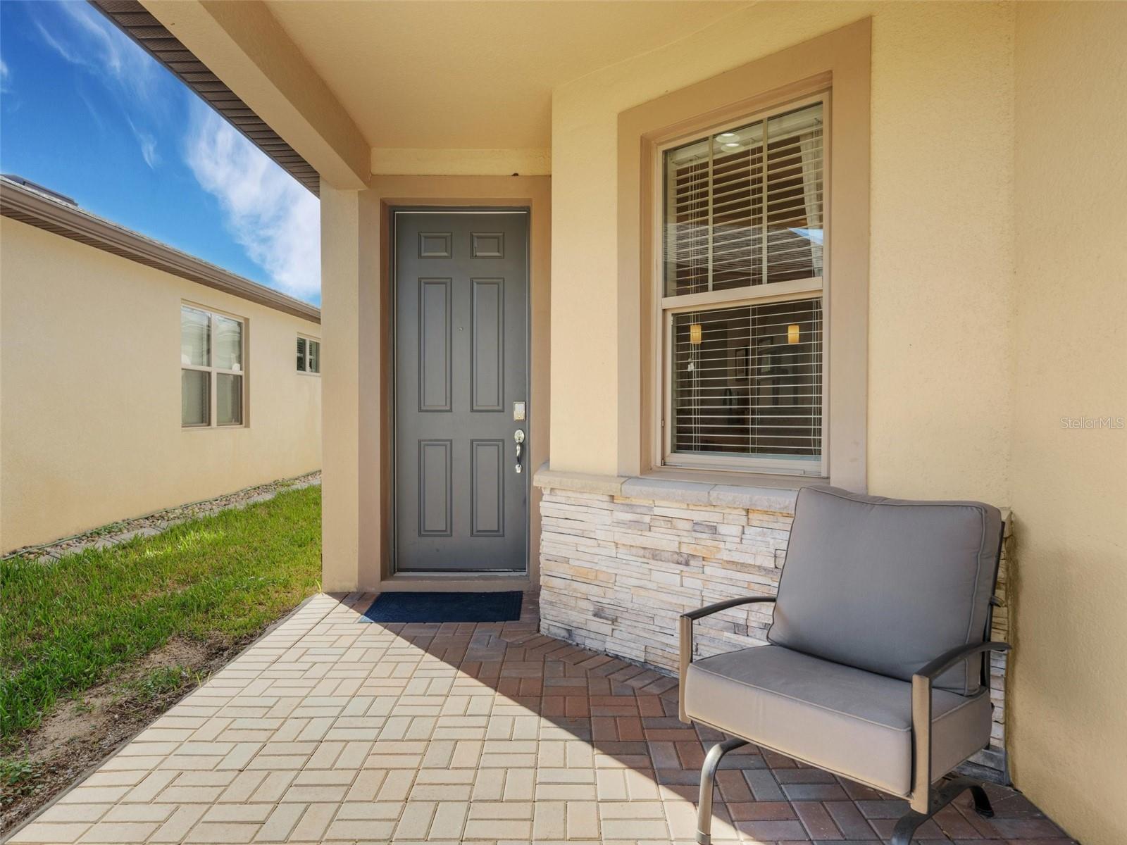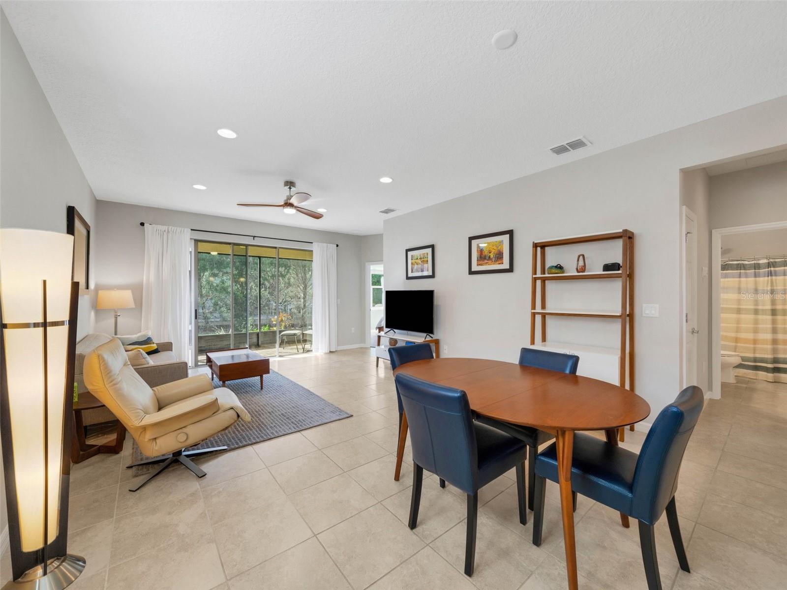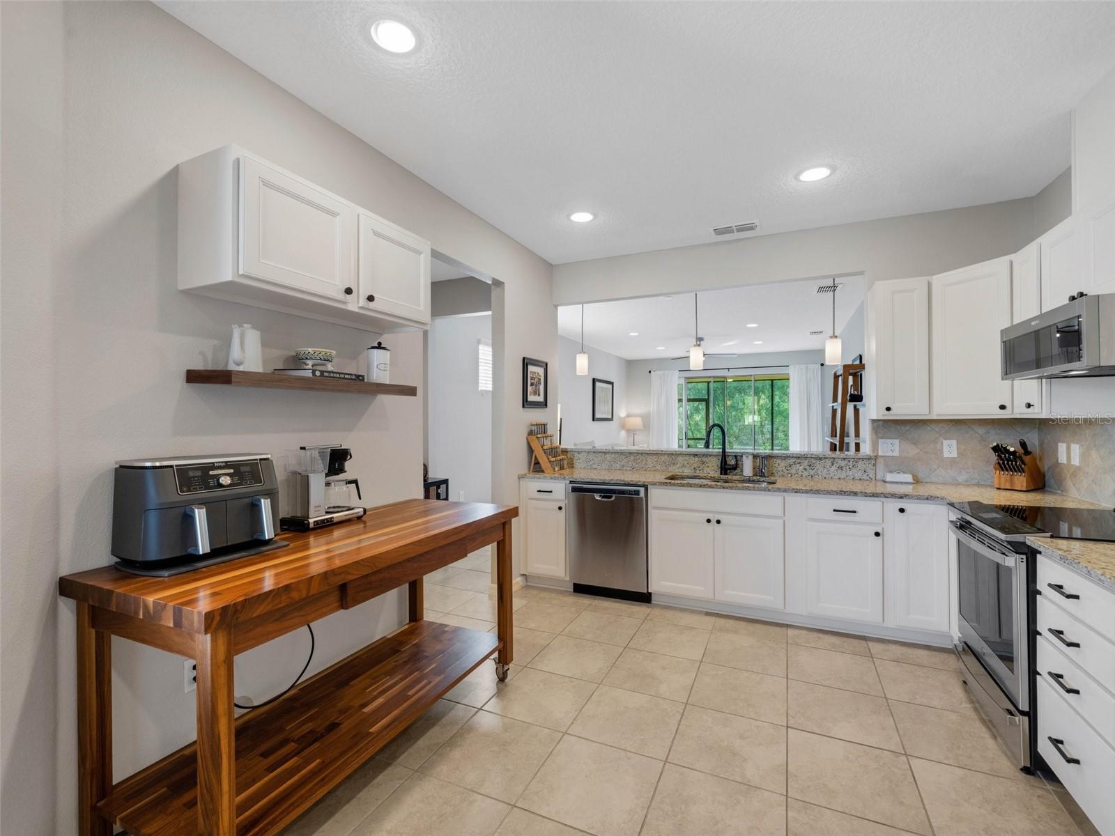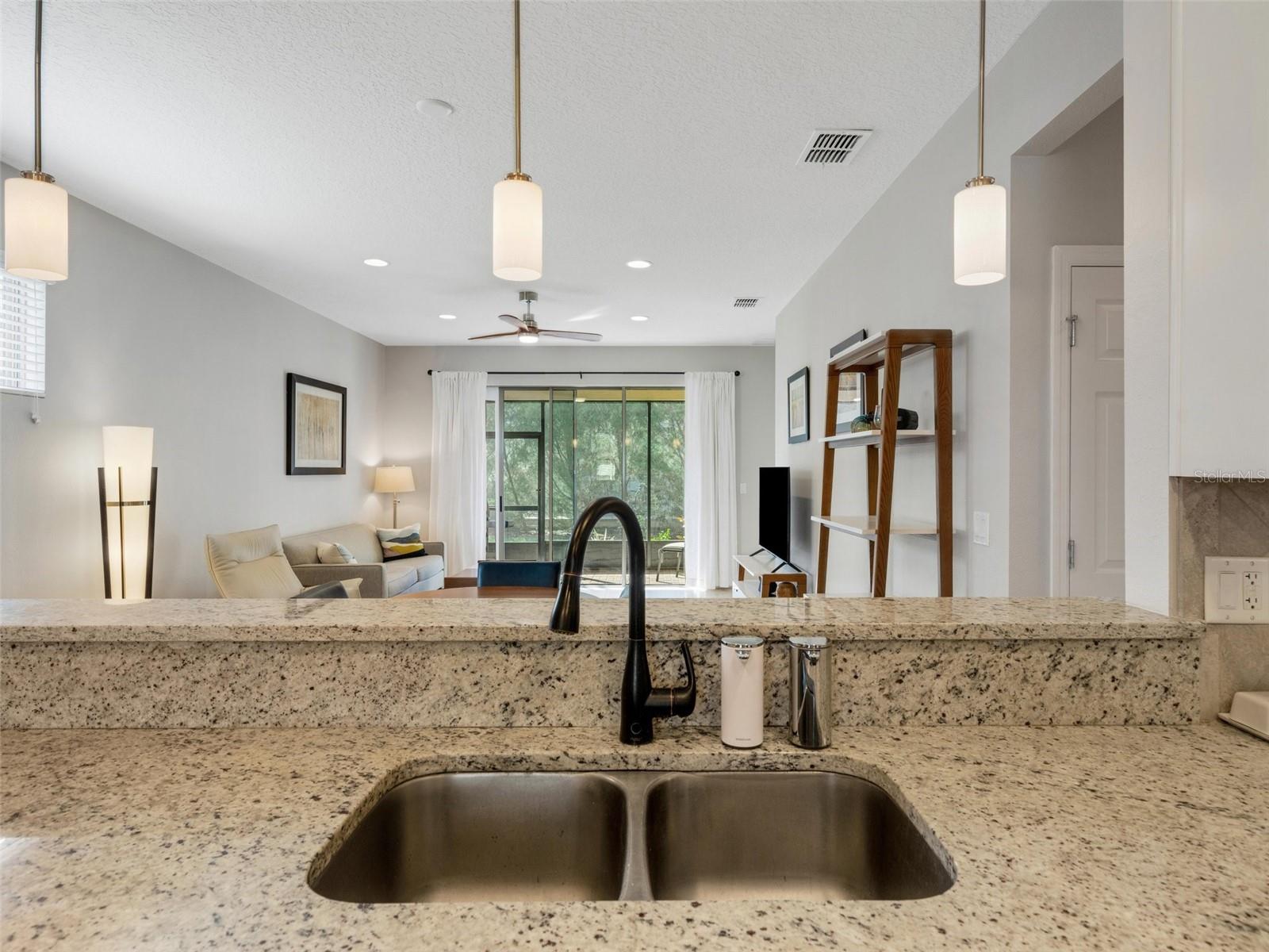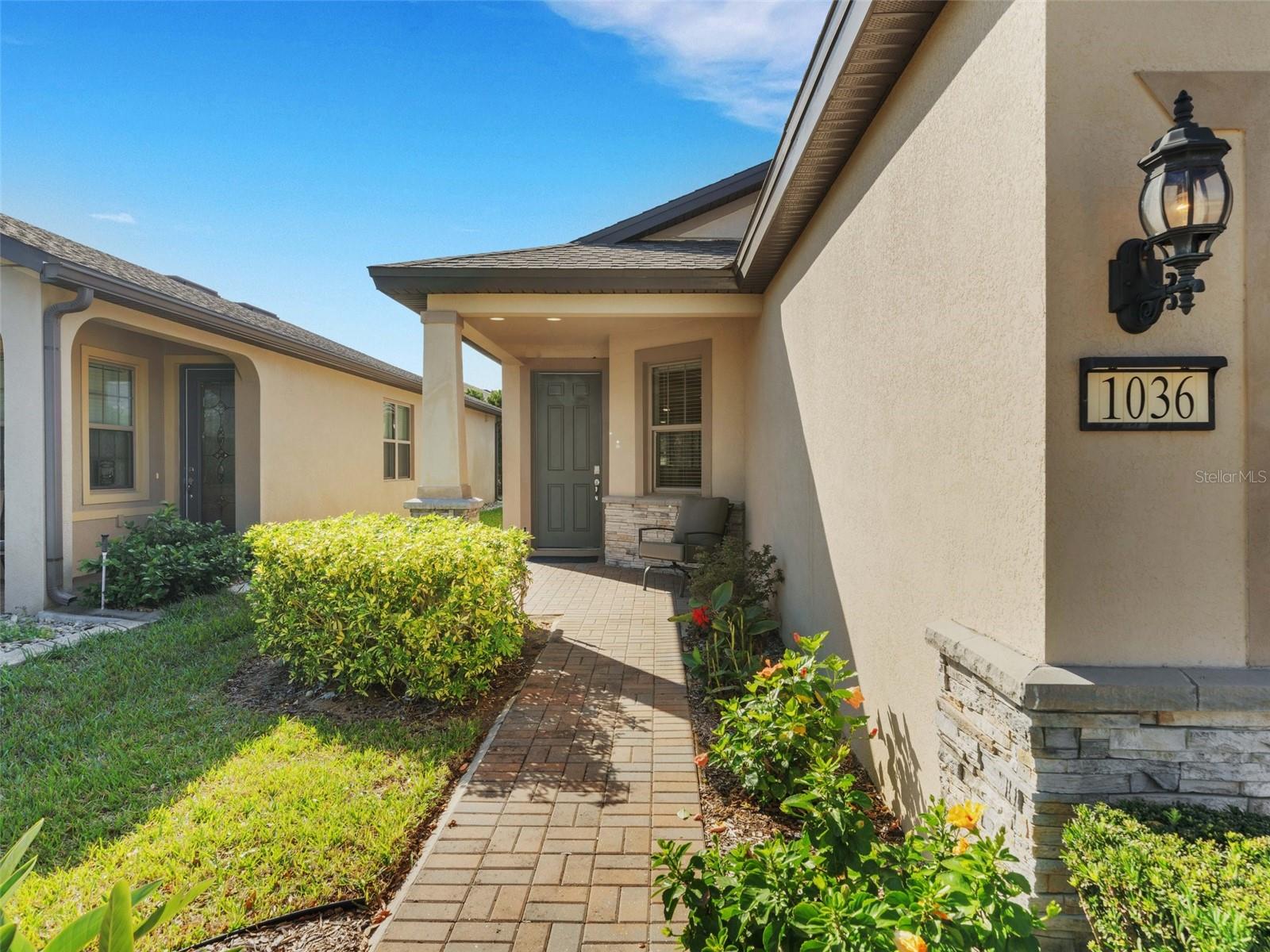 Located in the desired 55+ community of Del Webb Orlando, this immaculate Noir Coast model features 2 bedrooms and 2 bathrooms. The large kitchen has upgraded white cabinets, granite countertops and stainless steel appliances, and recent upgrades including additional cabinetry, a moveable island, new low-profile microwave, and a GE induction range. The living area has porcelain tile floors and large sliding glass doors that open up to a covered and screened lanai with a natural-gas grill. The master suite is in the rear of the home and includes an oversized walk-in closet and master bath featuring double sinks, a large walk-in shower with glass doors, a new medicine cabinet and upgraded fixtures. The laundry room complete with additional cabinetry is conveniently located near the master bedroom. The guest suite is located separately in the front of the home for privacy. Additional upgrades include a smart lock on the front door, updated lighting including ceiling fans, whole-house surge protection, and an epoxy floor in the garage. A termite warranty bond has been paid through 2025. The interior of the home has also been newly painted. The $425 semi-annual HOA fee provides 24x7 staffed security gate and master association-owned private road maintenance. Adjacent to recently renovated 18-hole White Heron Golf Club. The $277 monthly Del Webb HOA fee includes exclusive access to resident-owned 30,000+ SF Montecito clubhouse and amenities. DEL WEBB ORLANDO is a 55+ community with a tavern, indoor walking track, fitness center, indoor and outdoor pools and spas with locker rooms and showers, billiards, ping pong, craft room, and a ballroom for special events. Outdoor activities include pickleball, tennis, bocce, basketball, shuffleboard, community gardening center, an outdoor amphitheater, large brick fire pit and large screened-in gazebo over the water. Miles of biking and walking trails within Ridgewood Lakes gated community. Located conveniently to shopping at Posner Park (4 miles), Disney World, Universal Studios, Orlando & Central FL entertainment nearby. Easy access to I-4, medical facilities, airports & Sunrail Station. Advent Health hospital is 3 miles away.