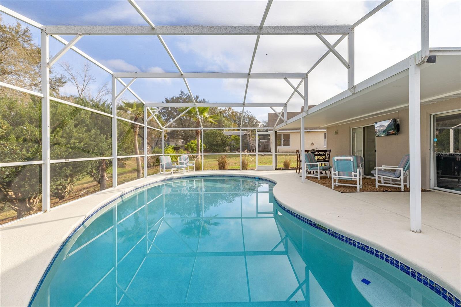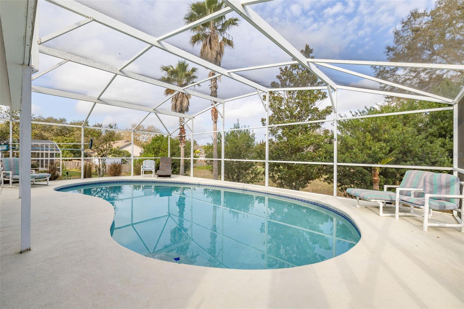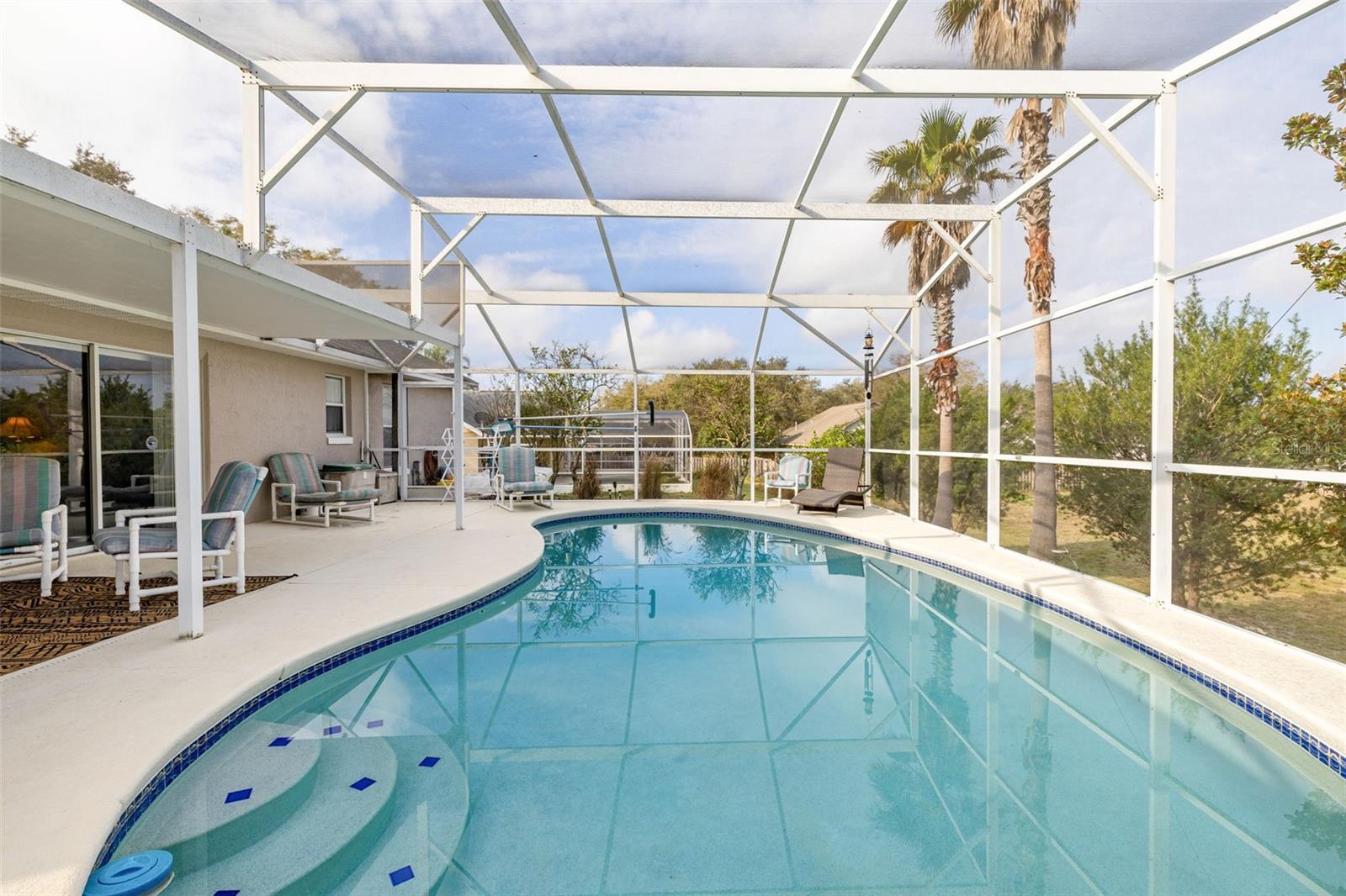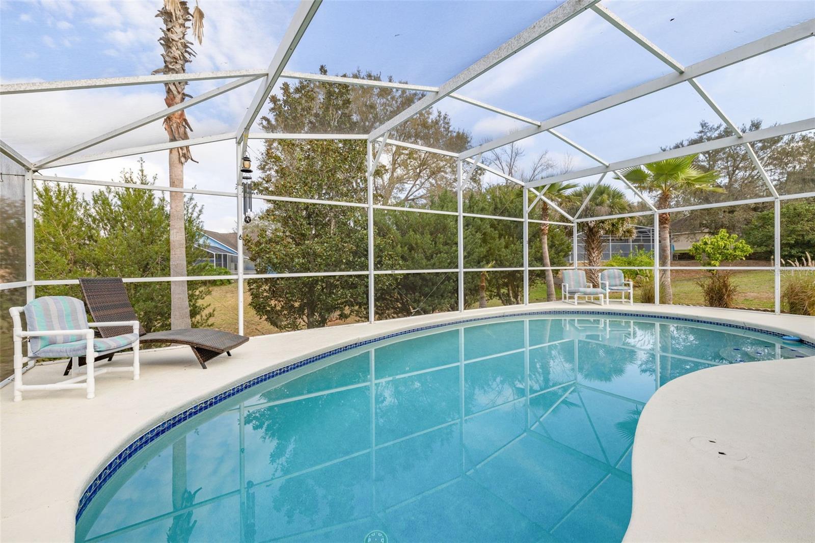 Nestled in the highly desirable Westridge community of Davenport, Florida, this beautifully maintained 3-bedroom, 2-bathroom pool home offers a thoughtful blend of style, comfort, and functionality. The open floor plan is highlighted by vaulted ceilings, luxury vinyl plank flooring throughout the common living areas, and recessed lighting that creates a bright, airy ambiance. A bonus flex room provides endless possibilities, whether used as an office, guest room, craft room, or play area. Recent updates include a new AC unit installed in 2023, a new roof in 2019 and water heater in 2020, and an insulated garage door for enhanced energy efficiency. The addition of attic insulation foil further helps reduce energy costs, and the bedrooms feature thicker carpet padding for added comfort. The secondary bathroom has been refreshed with a new vanity and updated fixtures for a modern touch. Step outside and enjoy a serene outdoor oasis with a covered, screened-in pool deck and porch, perfect for relaxation or entertaining. The 2020 rescreened lanai overlooks a peaceful, mostly dry retention area, providing both privacy and scenic views. Thoughtful details such as updated ceiling fans throughout enhance the home’s comfort and convenience. Many homeowners reside here fulltime, but the community also allows long term or short term rentals. Move-in ready and packed with modern amenities, this home is waiting to welcome its next owners to the vibrant and convenient lifestyle Westridge has to offer!