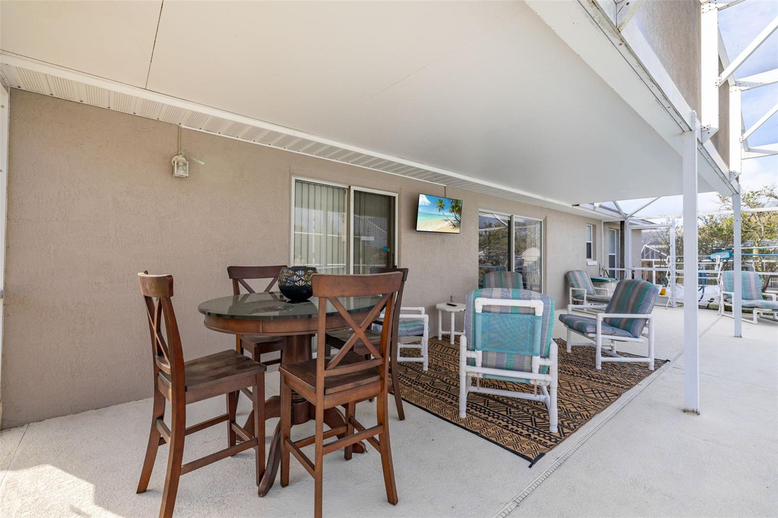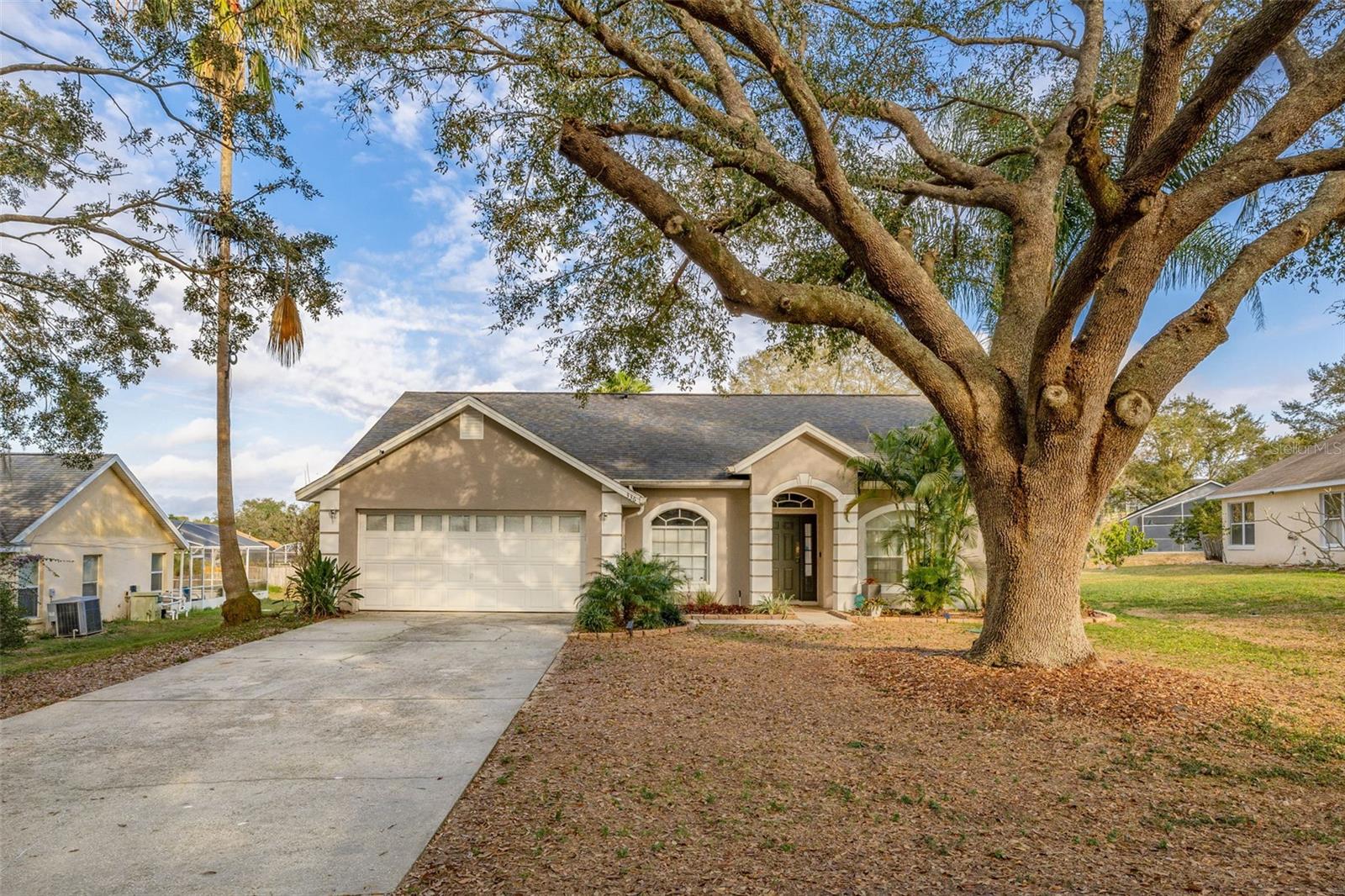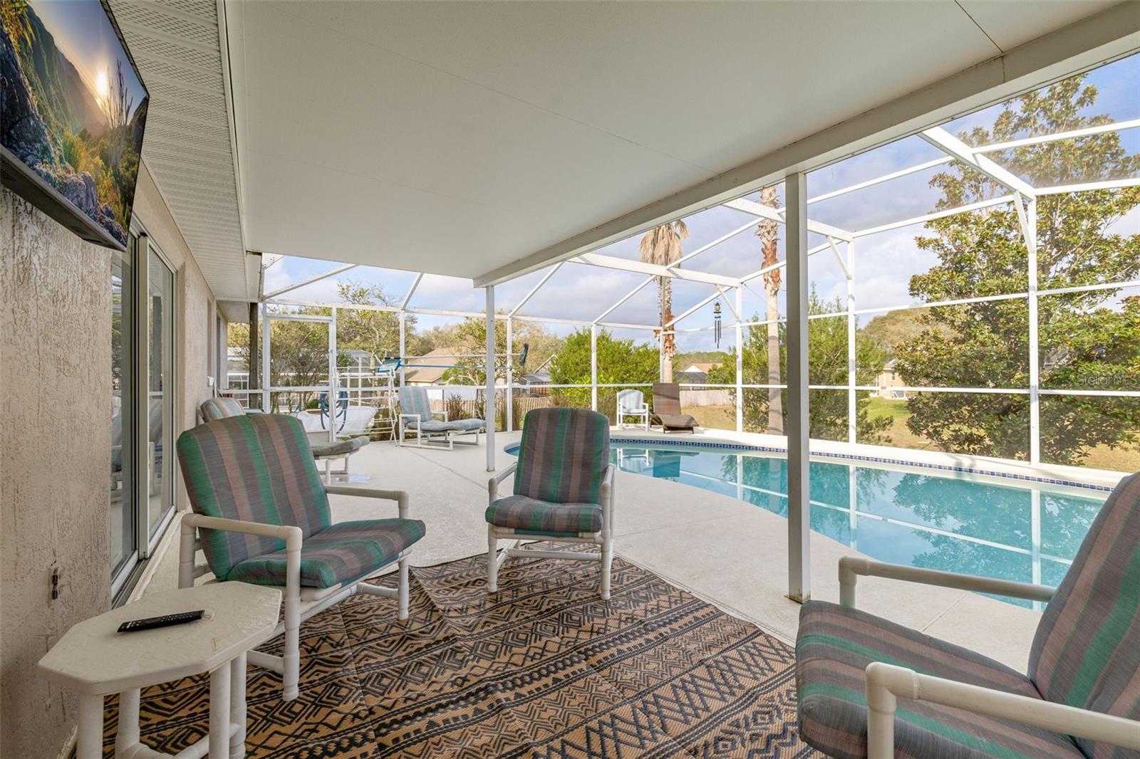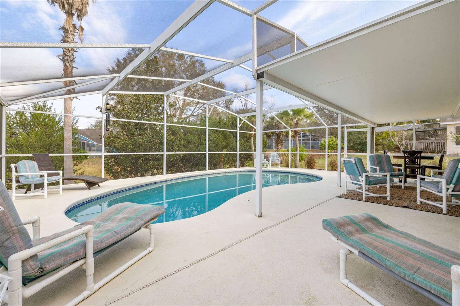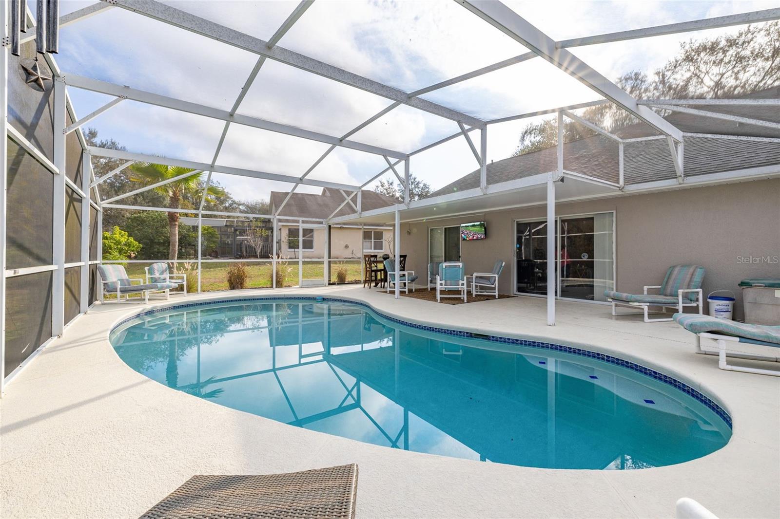Nestled in the highly desirable Westridge community of Davenport, Florida, this beautifully maintained 3-bedroom, 2-bathroom pool home offers a thoughtful blend of style, comfort, and functionality. The open floor plan is highlighted by vaulted ceilings, luxury vinyl plank flooring throughout the common living areas, and recessed lighting that creates a bright, airy ambiance. A bonus flex room provides endless possibilities, whether used as an office, guest room, craft room, or play area. Recent updates include a new AC unit installed in 2023, a new roof in 2019 and water heater in 2020, and an insulated garage door for enhanced energy efficiency. The addition of attic insulation foil further helps reduce energy costs, and the bedrooms feature thicker carpet padding for added comfort. The secondary bathroom has been refreshed with a new vanity and updated fixtures for a modern touch. Step outside and enjoy a serene outdoor oasis with a covered, screened-in pool deck and porch, perfect for relaxation or entertaining. The 2020 rescreened lanai overlooks a peaceful, mostly dry retention area, providing both privacy and scenic views. Thoughtful details such as updated ceiling fans throughout enhance the home’s comfort and convenience. Many homeowners reside here fulltime, but the community also allows long term or short term rentals. Move-in ready and packed with modern amenities, this home is waiting to welcome its next owners to the vibrant and convenient lifestyle Westridge has to offer!