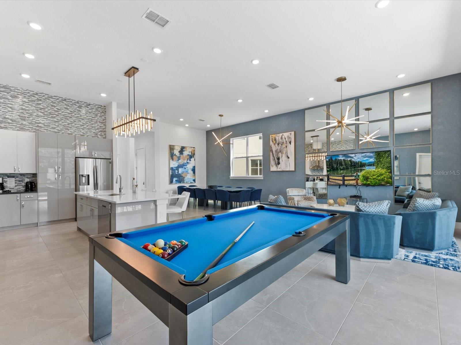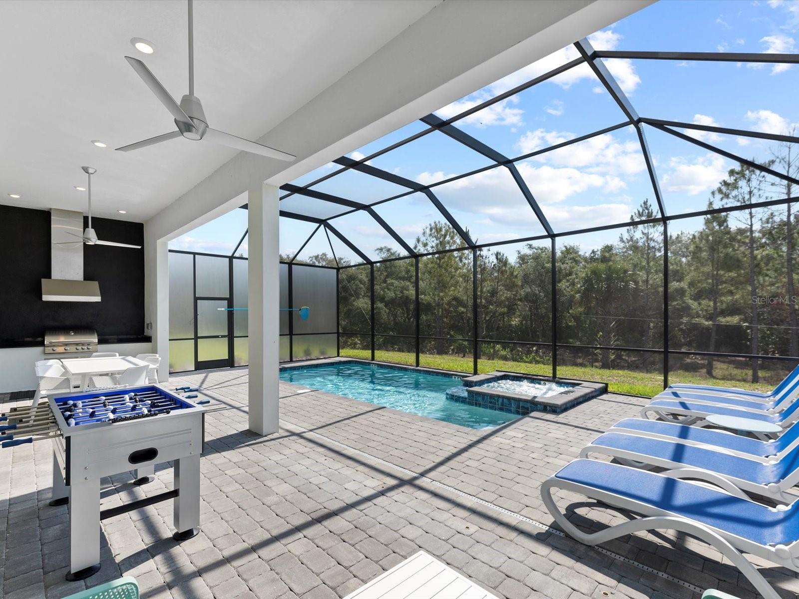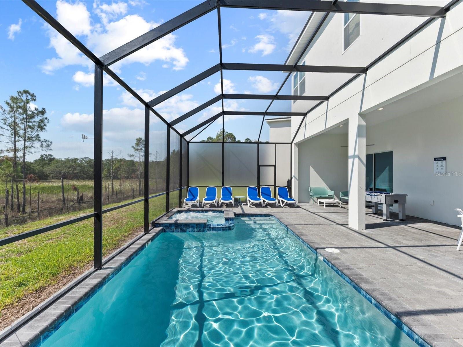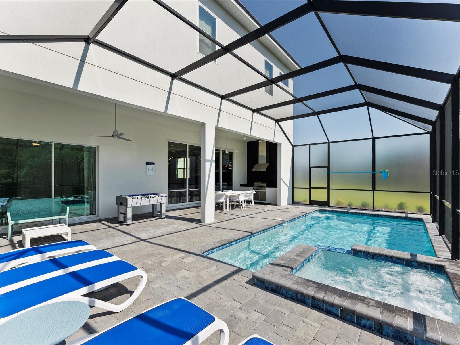 Introducing a luxurious contemporary retreat close to Disney, boasting 6 bedrooms and 6.5 bathrooms, expertly designed with your ultimate comfort in mind. Villatel Village, is an exclusive community nestled within the prestigious Solterra resort just 12 miles away from the world-renowned Disney theme park. As you enter the home, you'll be greeted by soaring extra high ceilings that create a grandiose and spacious atmosphere throughout. Entertaining is a breeze with your own private pool and spa, complete with a screen for added privacy. Enjoy endless days of relaxation and fun in the sun in complete seclusion. The summer kitchen is the perfect way to take your outdoor living space to the next level, so you can cook, entertain, and enjoy the Florida sunshine all year. The upgraded, extra height kitchen cabinetry and granite countertops exude a sleek and modern aesthetic, making meal preparation a true joy. Luxury abounds in the bedrooms with custom blackout drapes, ensuring a restful and rejuvenating night's sleep. The themed children's bunk room is a dream come true for the little ones, while the games room and cinema provide hours of entertainment for all ages. The loft space is perfect for those looking for a little friendly competition, featuring games to keep everyone entertained for hours. And upgraded lighting throughout the home adds an extra touch of elegance. This stunning property offers a truly unique and unforgettable experience for those seeking the ultimate in luxury living. Don't miss out on the opportunity to make this extraordinary home your own. Designed for short-term rental use, this community offers a unique investment opportunity for those looking to maximize their rental income potential. One of the standout features of Villatel Village is the soon-to-be-completed conference center. This state-of-the-art facility will be the perfect venue for hosting events and celebrations of all kinds, adding an extra layer of convenience and versatility for guests. Whether you're looking to host a corporate retreat, family reunion, or other special occasion, Villatel Village's conference center is sure to impress. Located just a short distance from all of the attractions that Orlando has to offer, Villatel Village provides the perfect blend of convenience and luxury for both homeowners and renters alike. Don't miss out on the opportunity to be a part of this extraordinary community.
