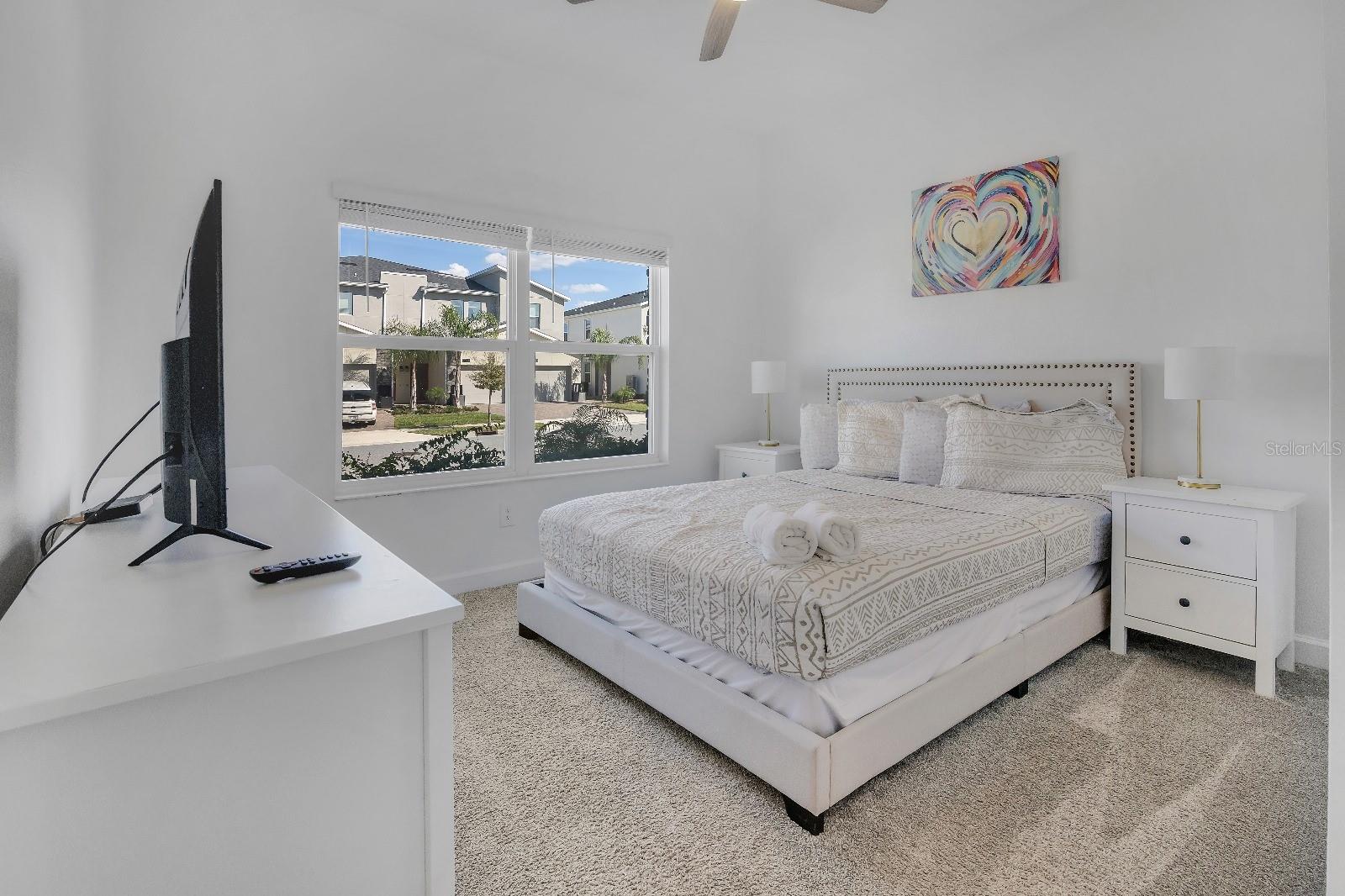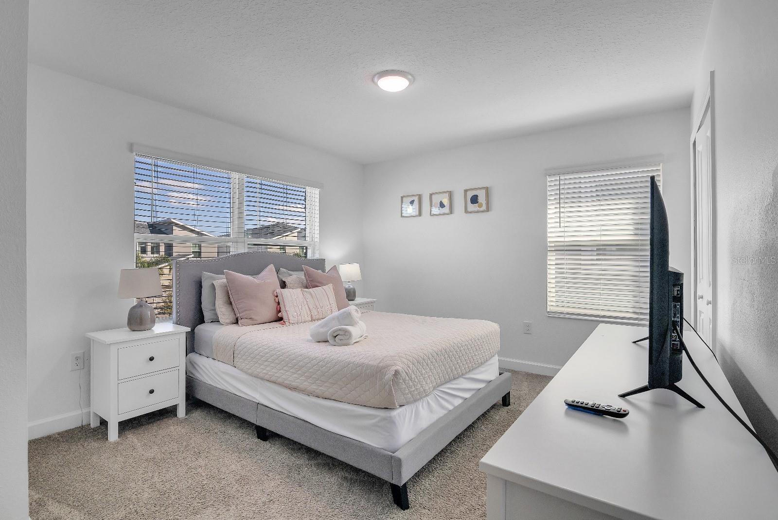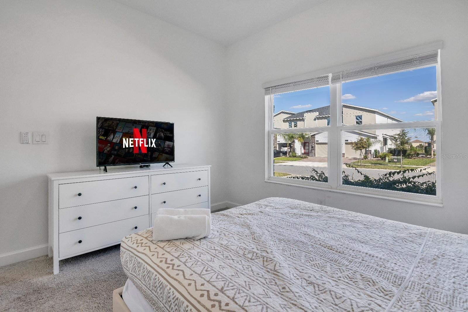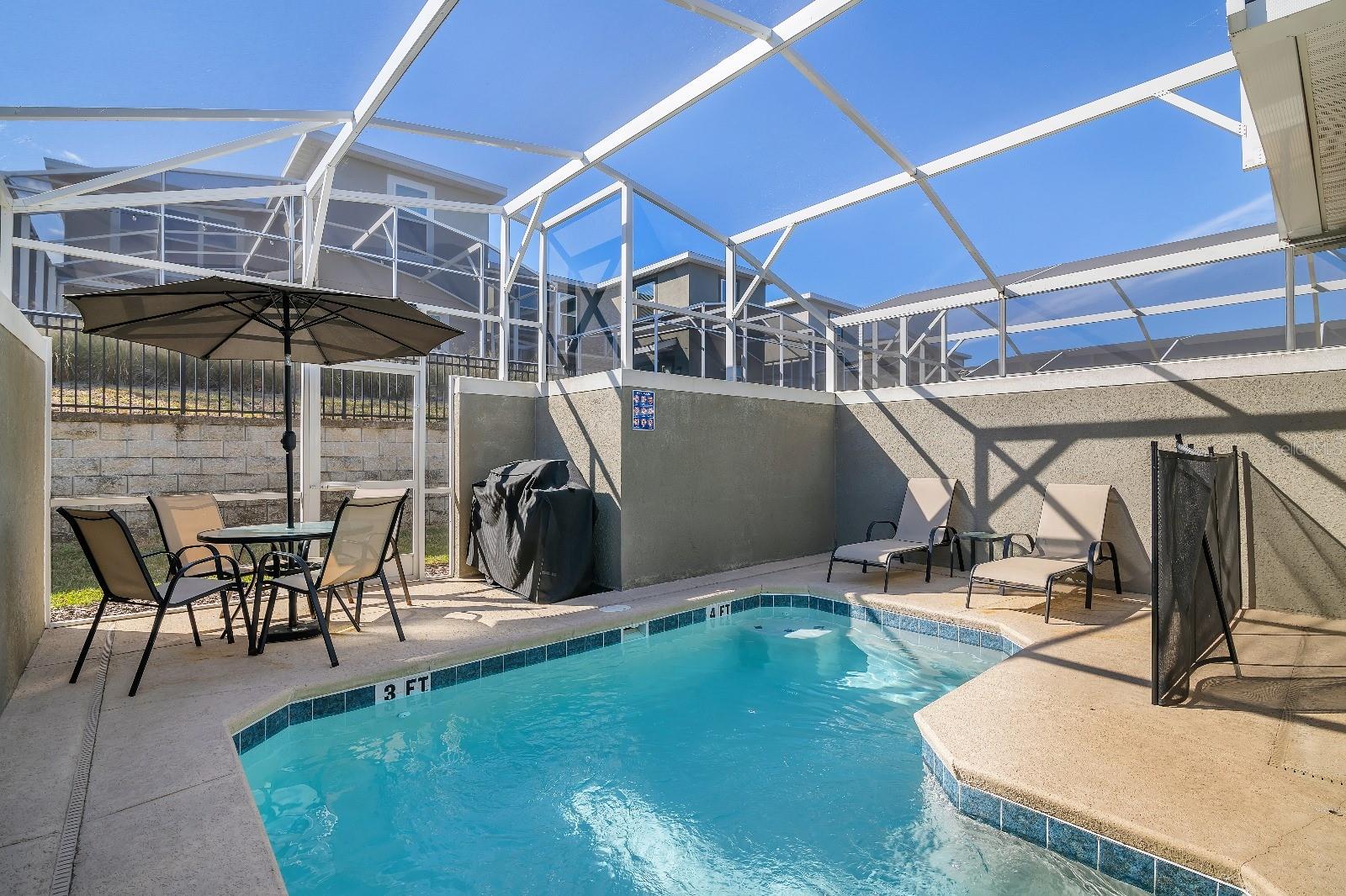 Come see this amazing fully furnished two-story townhome located in the Champions Gate Resort. This spacious property offers 5 bedrooms and 4 bathrooms. The first floor features an open-plan, fully equipped modern kitchen and dining area, spacious family room, two full-size bedrooms and a family bathroom, a spacious private deck with a pool and a covered lanai/patio area. The second floor features a loft area, two master suites and a fifth bedroom, each bedroom is furnished with comfortable bedding, and flat-screen TVs. Don't miss out on the amazing amenities at the Oasis Club featuring one pool for the little ones with awesome water entertainment, a lazy river, adult pool with bar, private cabanas, jacuzzi, restaurant, gym with the latest equipment, game room, movie theater and office center. Other amenities include tennis courts, golf course, a water park, mini soccer, playgrounds and basketball. Located 15 minutes from Disney parks, 30 minutes from Universal Studios, 15 minutes from Premium Outlets, near restaurants and shopping, 10 minutes from US 27, I-4, dinning and shopping.