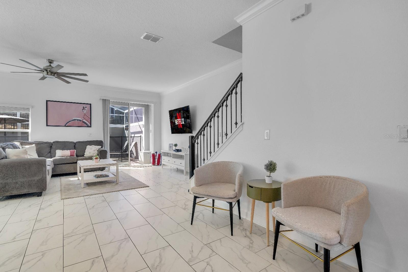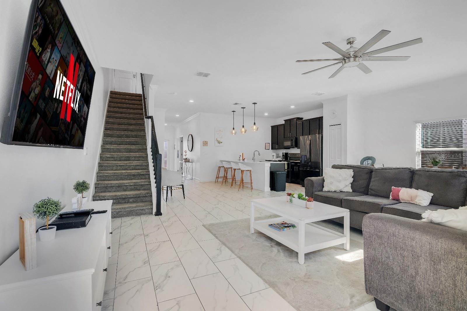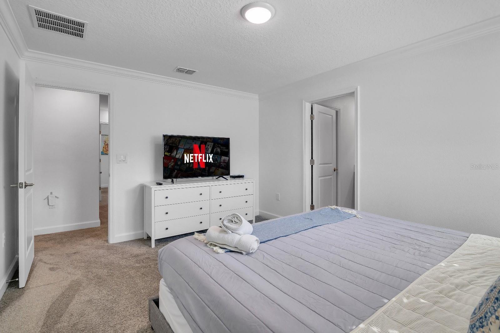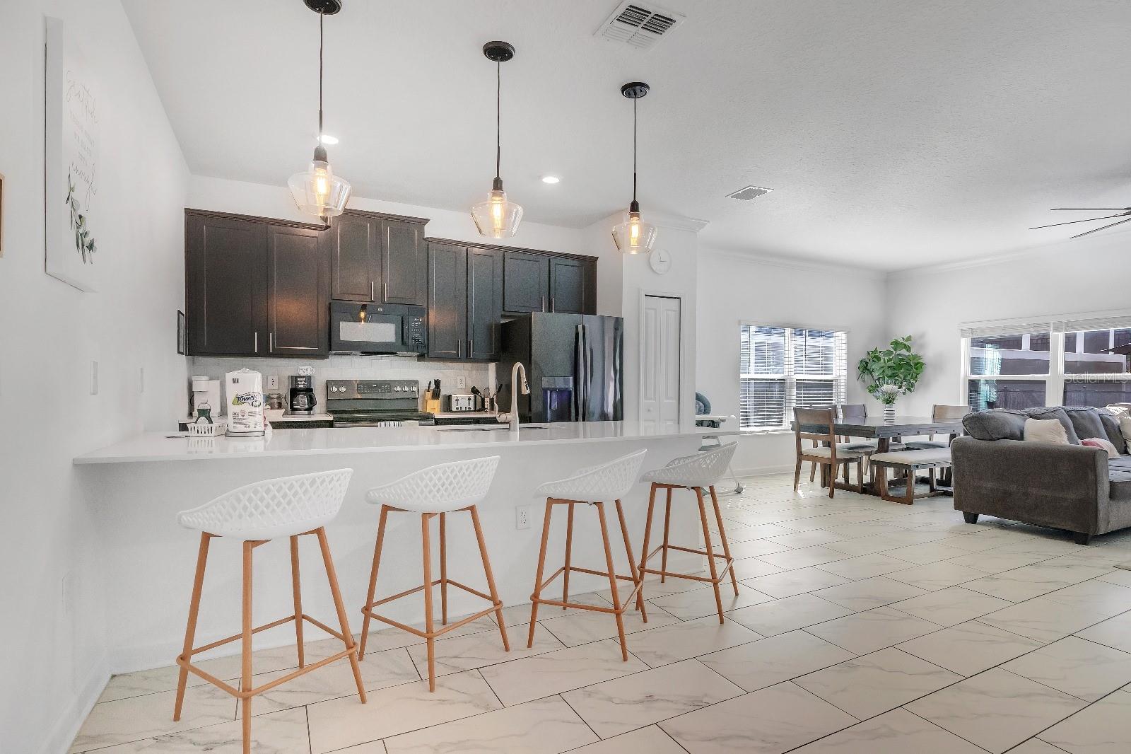 Come see this amazing fully furnished two-story townhome located in the Champions Gate Resort. This spacious property offers 5 bedrooms and 4 bathrooms. The first floor features an open-plan, fully equipped modern kitchen and dining area, spacious family room, two full-size bedrooms and a family bathroom, a spacious private deck with a pool and a covered lanai/patio area. The second floor features a loft area, two master suites and a fifth bedroom, each bedroom is furnished with comfortable bedding, and flat-screen TVs. Don't miss out on the amazing amenities at the Oasis Club featuring one pool for the little ones with awesome water entertainment, a lazy river, adult pool with bar, private cabanas, jacuzzi, restaurant, gym with the latest equipment, game room, movie theater and office center. Other amenities include tennis courts, golf course, a water park, mini soccer, playgrounds and basketball. Located 15 minutes from Disney parks, 30 minutes from Universal Studios, 15 minutes from Premium Outlets, near restaurants and shopping, 10 minutes from US 27, I-4, dinning and shopping.