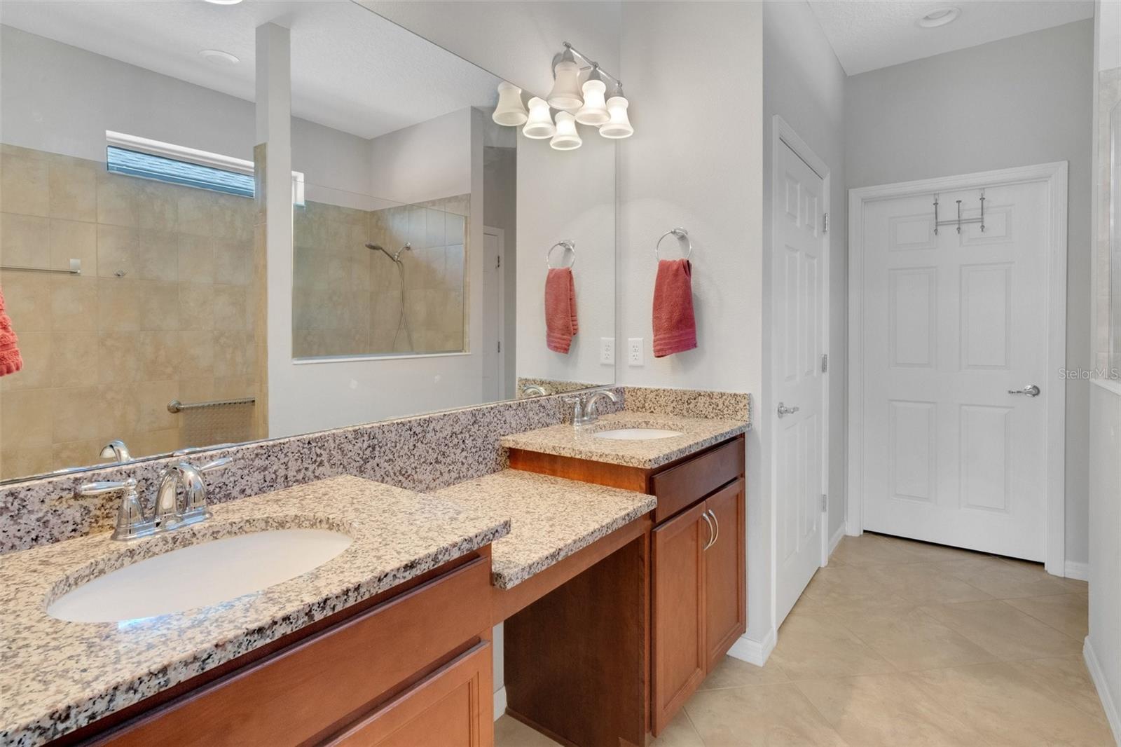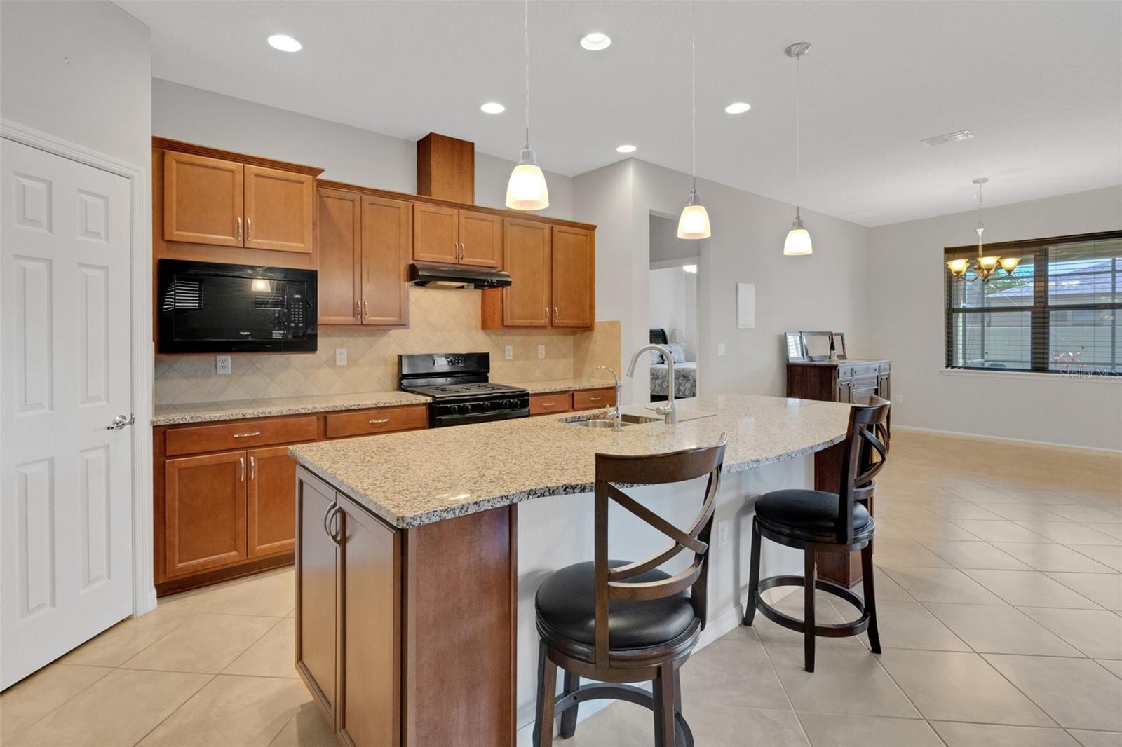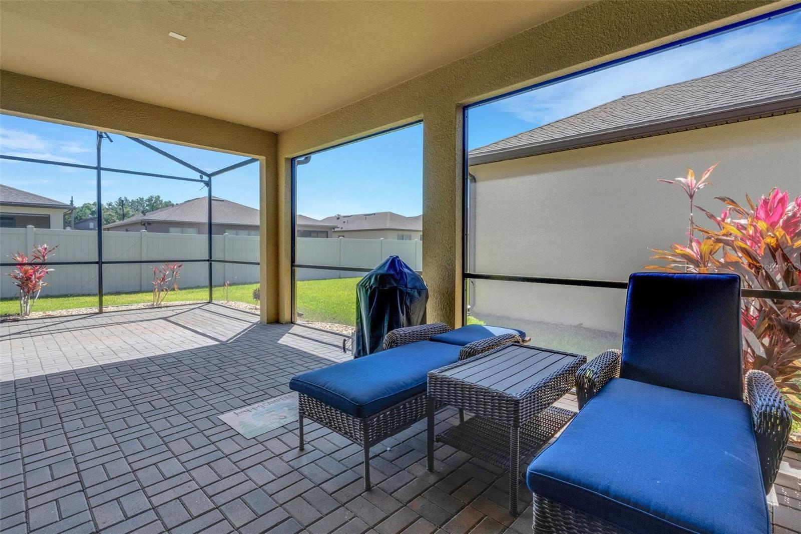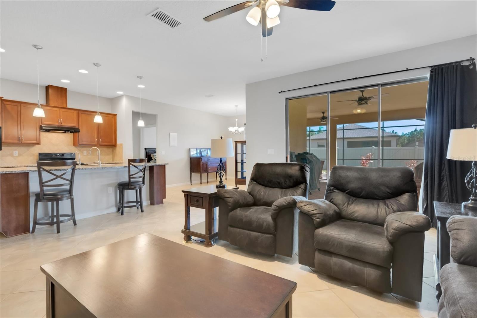 Located in the desired 55+ RESORT STYLE community of Del Webb Orlando, this Beautiful Summerwood floor plan is a MUST SEE! This home features 3 bedrooms + a den, and 2 bathrooms. You walk into the screened front porch and through the decorative front door into the open floor plan. The guest bedrooms and bathroom are in the front of the home. The heart of the home, the kitchen, features black appliances including a NATURAL GAS STOVE, granite countertops, a backsplash, a large island perfect for entertaining, and a spacious pantry. The PRIMARY BEDROOM is in the rear of the home for owner privacy. The primary bathroom suite features double sinks with granite countertops, a extra-large tiled shower, and a large walk-in closet. The dining room is conveniently located adjacent to the kitchen. The large living room features large glass sliding doors that open to the extended covered lanai with a NATURAL GAS HOOK-UP. Beyond the covered lanai is a screened cage. The large laundry room includes a utility sink and built-in cabinets. Best of all this home features ceramic tile laid on the diagonal throughout - NO CARPET! The home also includes a WHOLE-HOUSE GENERATOR and a WHOLE-HOUSE VACUUM. The 2-car garage has a 4' extension and a utility sink. The additional home upgrades include updated lighting and ceiling fans and a NATURAL GAS hot water heater. The exterior of the home features a extra-wide paver driveway, gutters and concrete landscaping curbing. The $328 monthly Del Webb HOA fee includes lawn maintenance, and exclusive access to resident-owned 30,000+ SF Montecito clubhouse and amenities. DEL WEBB ORLANDO is a 55+ community with a tavern, indoor walking track, fitness center, indoor and outdoor pools and spas with locker rooms and showers, billiards, ping pong, craft room, and a ballroom for special events. Outdoor activities include pickleball, tennis, bocce, basketball, shuffleboard, community gardening center, an outdoor amphitheater, large brick fire pit and large screened-in gazebo over the water. Miles of biking and walking trails within Ridgewood Lakes gated community. The $425 semi-annual HOA fee provides 24x7 staffed security gate and master association-owned private road maintenance. Adjacent to recently renovated 18-hole White Heron Golf Club. Community is located conveniently to shopping at Posner Park (4 miles), Disney World, Universal Studios, Orlando & Central FL entertainment nearby. Easy access to I-4, medical facilities, airports & Sunrail Station. Advent Health hospital is 3 miles away.