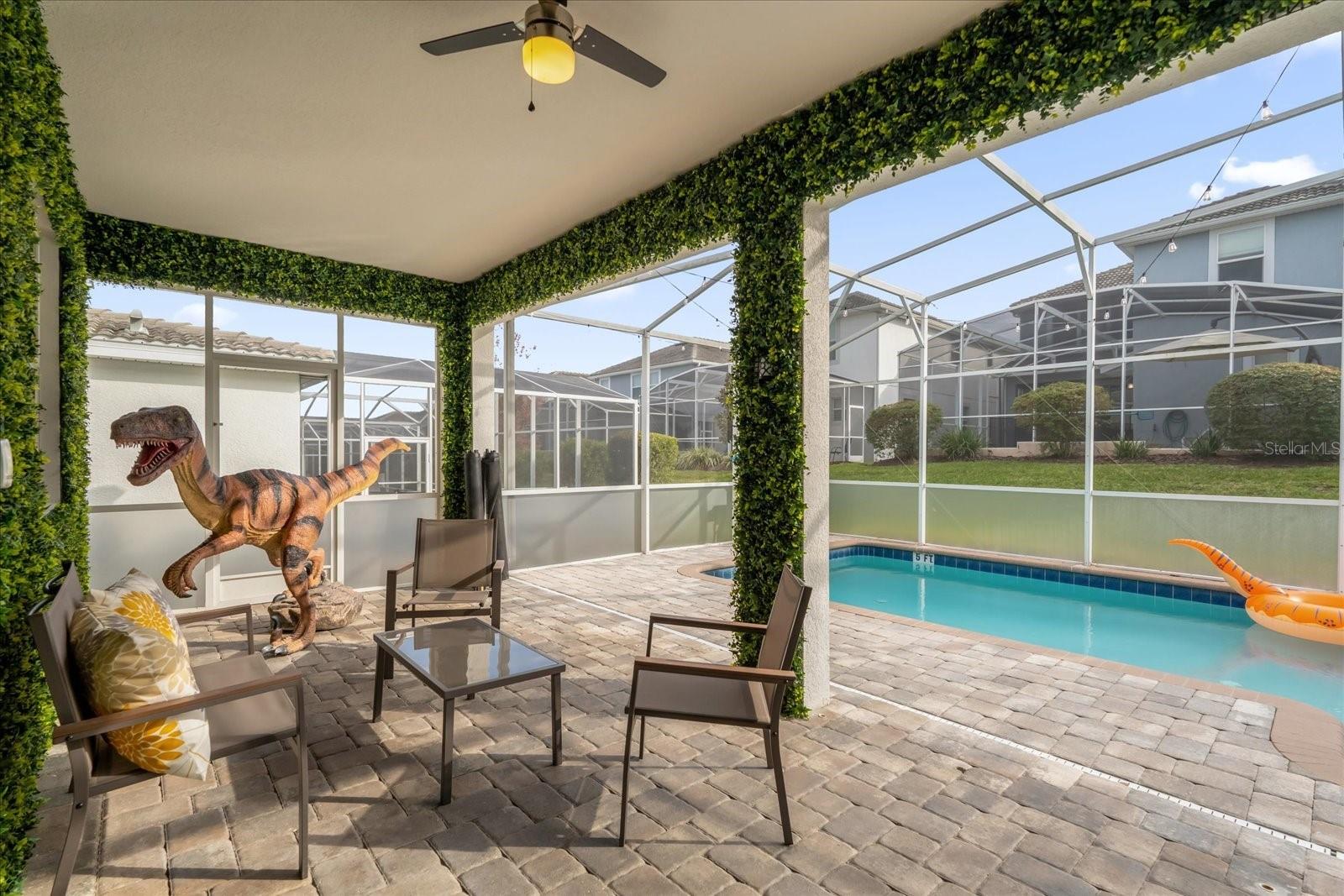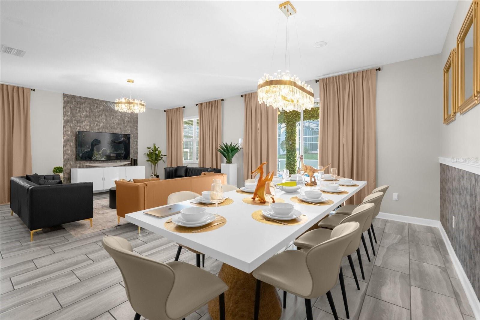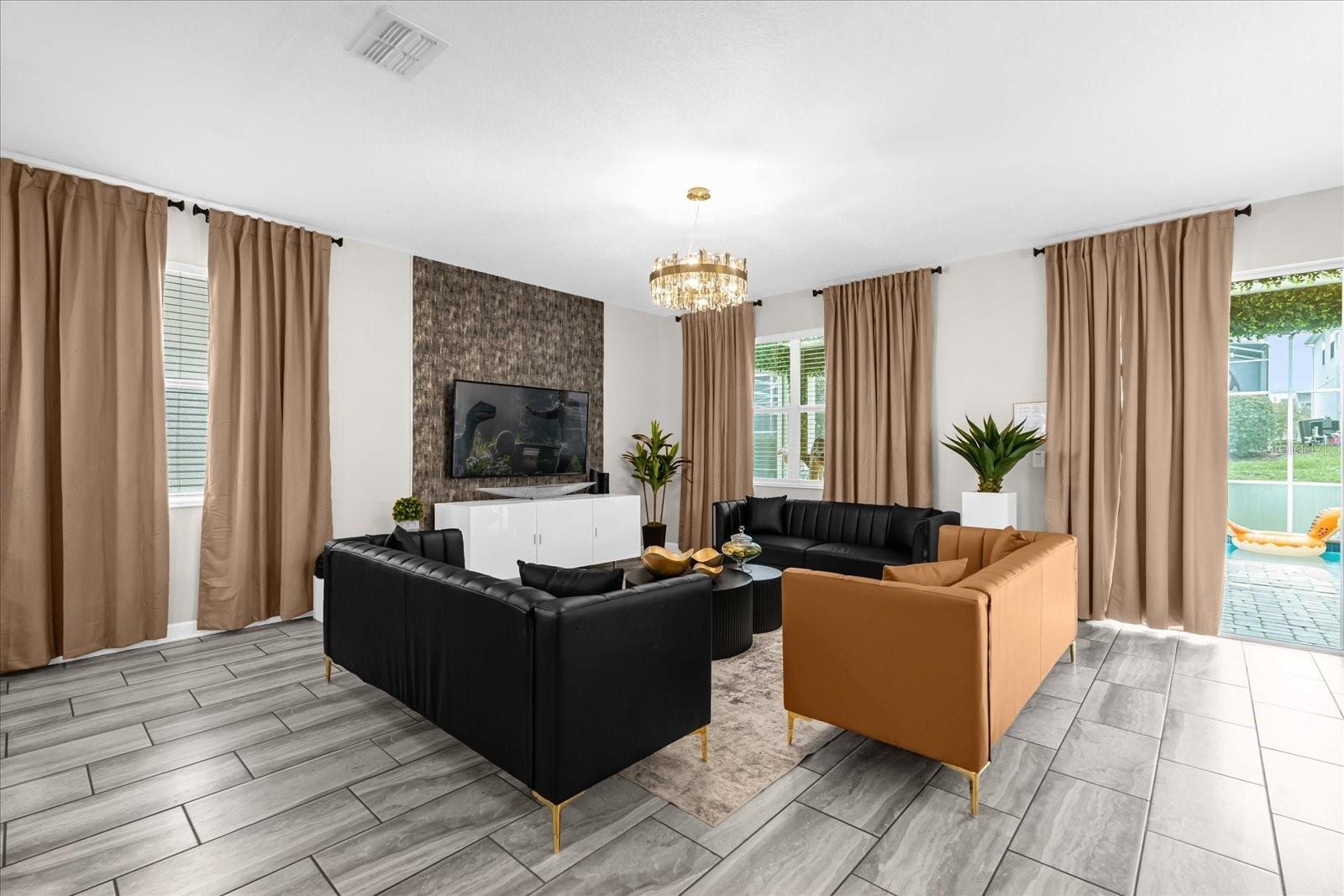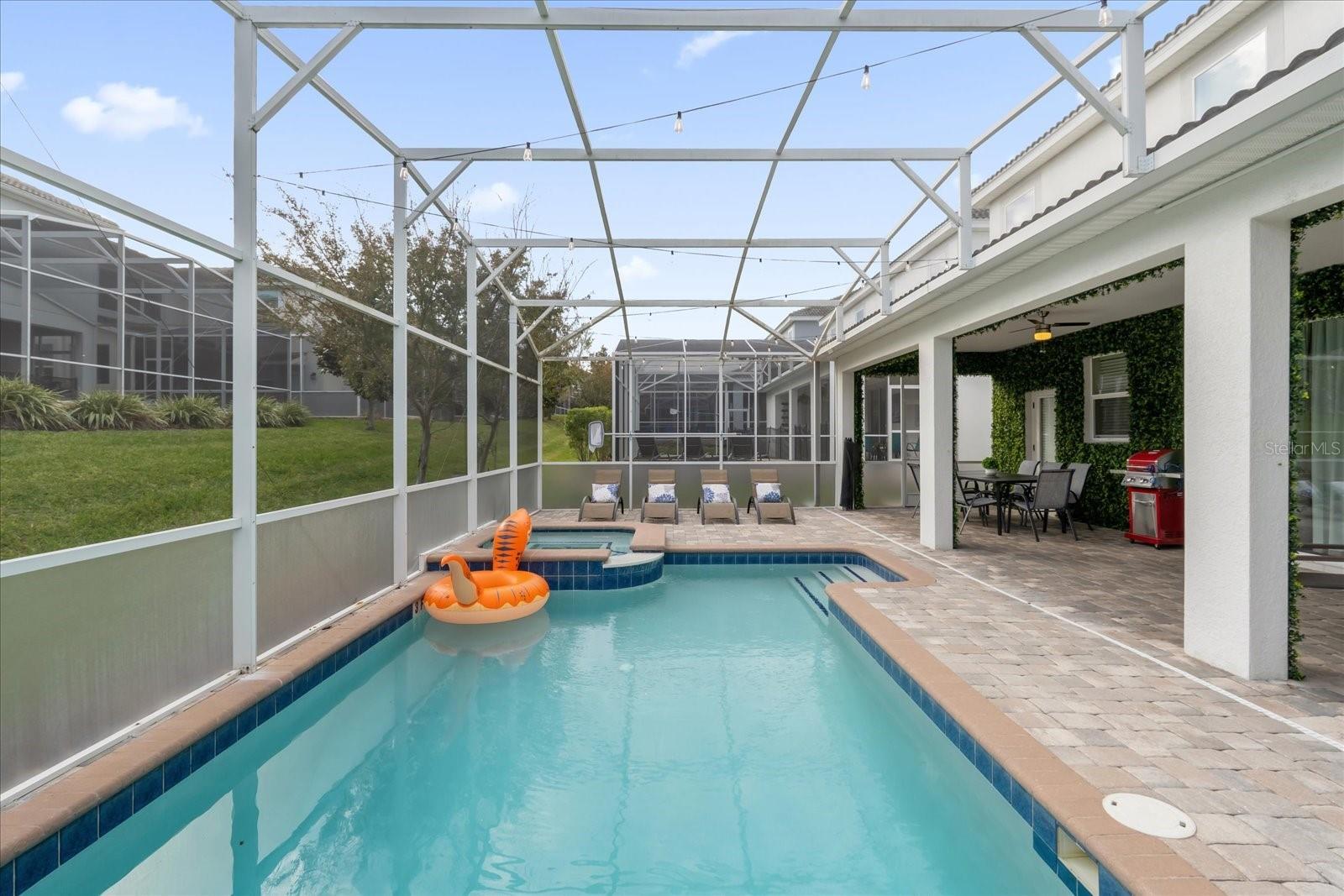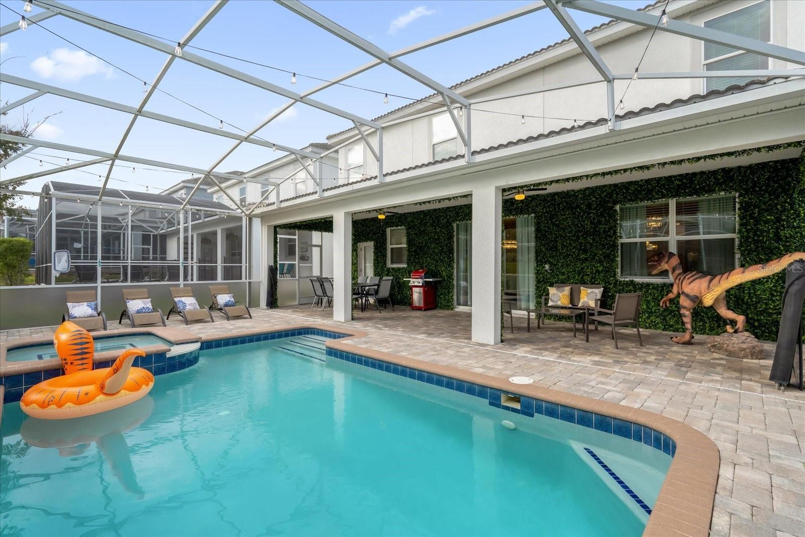 Welcome to this spectacular 8-bedroom, 5-bathroom fully furnished home located in the highly sought-after Retreat at Champions Gate, one of Orlando's premier gated resort communities. Whether you're seeking a high-performing short-term rental or a luxurious second home, this property delivers both style and income—with over $120K in gross rental income in 2023! Professionally designed and filled with natural light, this home features themed bedrooms, a converted game room, and spacious living areas perfect for entertaining. The main level offers two bedrooms, including a primary suite with direct access to the pool deck and an en suite bath with a dual vanity, soaking tub, and glass-enclosed shower. The open-concept kitchen boasts 42" shaker style cabinets, granite countertops, stainless steel appliances, and a bar seating area—flowing seamlessly into the dining and family room. Step outside to enjoy the screen-enclosed pool and lanai, perfect for relaxing or hosting guests. Upstairs, a cozy loft TV room is surrounded by six additional bedrooms and a bonus room that can be converted into a 9th bedroom. The garage-turned-game-room is air-conditioned with epoxy flooring and features a pool table—ensuring endless fun for guests. Just a short walk to the Oasis Clubhouse, where world-class amenities include a lazy river, water slides, splash pad, resort-style pool, fitness center, movie theater, arcade, restaurant, Tiki Bar, and more. A free community shuttle provides easy access to all amenities and nearby golf courses. Located just minutes from Disney, major highways, shopping, and dining, this home is in a zoning phase that allows both short- and long-term rentals—with no restrictions on owner stays. Don’t miss your chance to own one of the most desirable and versatile properties in Central Florida!