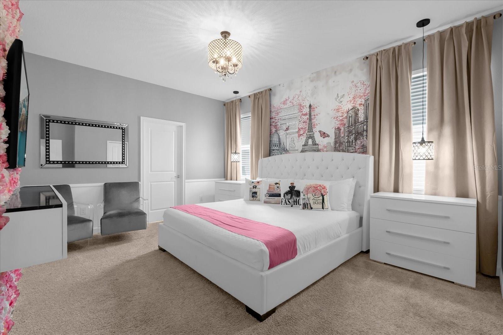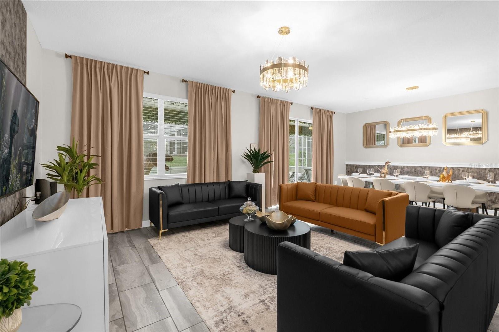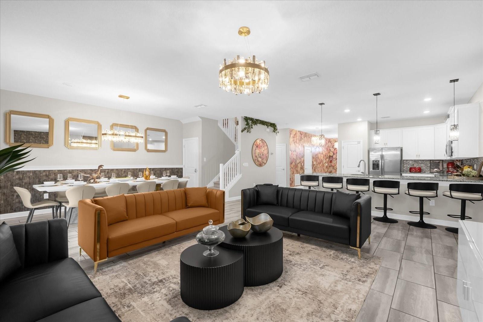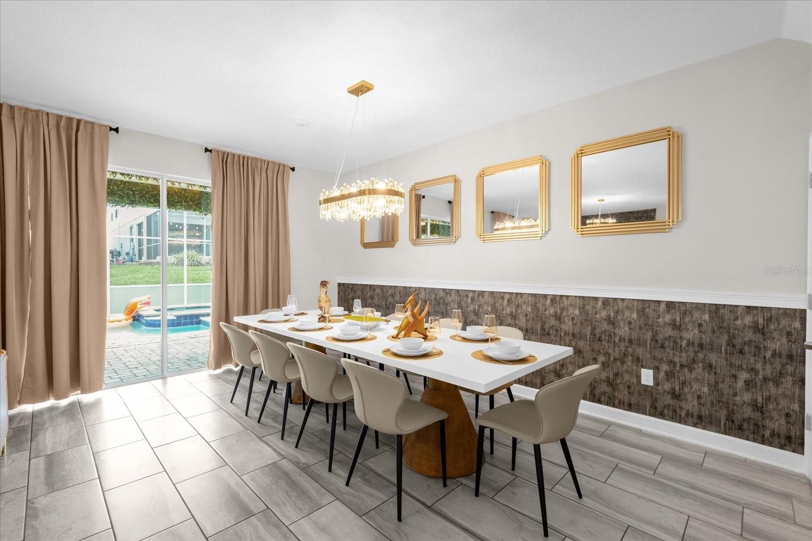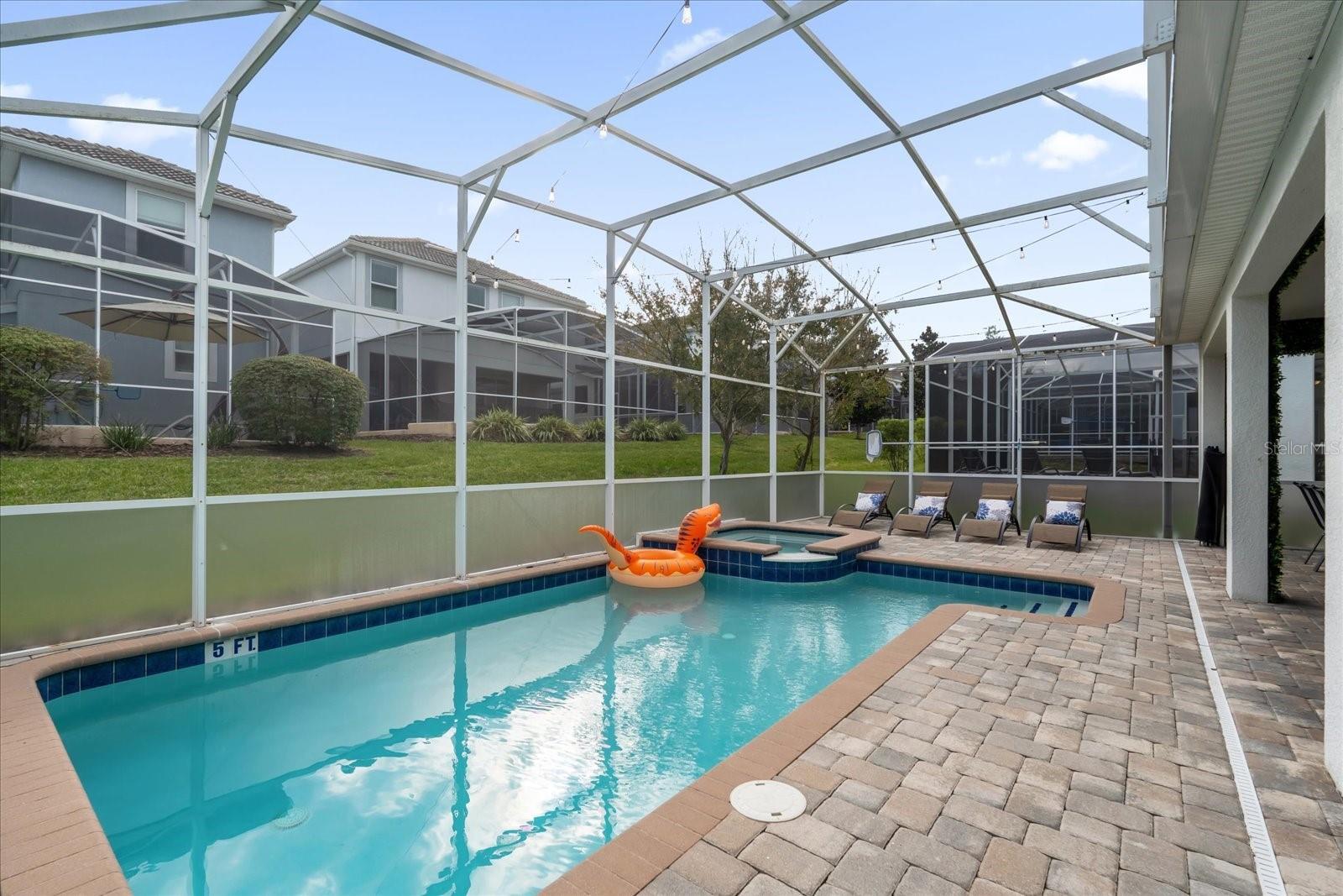 Welcome to this spectacular 8-bedroom, 5-bathroom fully furnished home located in the highly sought-after Retreat at Champions Gate, one of Orlando's premier gated resort communities. Whether you're seeking a high-performing short-term rental or a luxurious second home, this property delivers both style and income—with over $120K in gross rental income in 2023! Professionally designed and filled with natural light, this home features themed bedrooms, a converted game room, and spacious living areas perfect for entertaining. The main level offers two bedrooms, including a primary suite with direct access to the pool deck and an en suite bath with a dual vanity, soaking tub, and glass-enclosed shower. The open-concept kitchen boasts 42" shaker style cabinets, granite countertops, stainless steel appliances, and a bar seating area—flowing seamlessly into the dining and family room. Step outside to enjoy the screen-enclosed pool and lanai, perfect for relaxing or hosting guests. Upstairs, a cozy loft TV room is surrounded by six additional bedrooms and a bonus room that can be converted into a 9th bedroom. The garage-turned-game-room is air-conditioned with epoxy flooring and features a pool table—ensuring endless fun for guests. Just a short walk to the Oasis Clubhouse, where world-class amenities include a lazy river, water slides, splash pad, resort-style pool, fitness center, movie theater, arcade, restaurant, Tiki Bar, and more. A free community shuttle provides easy access to all amenities and nearby golf courses. Located just minutes from Disney, major highways, shopping, and dining, this home is in a zoning phase that allows both short- and long-term rentals—with no restrictions on owner stays. Don’t miss your chance to own one of the most desirable and versatile properties in Central Florida!