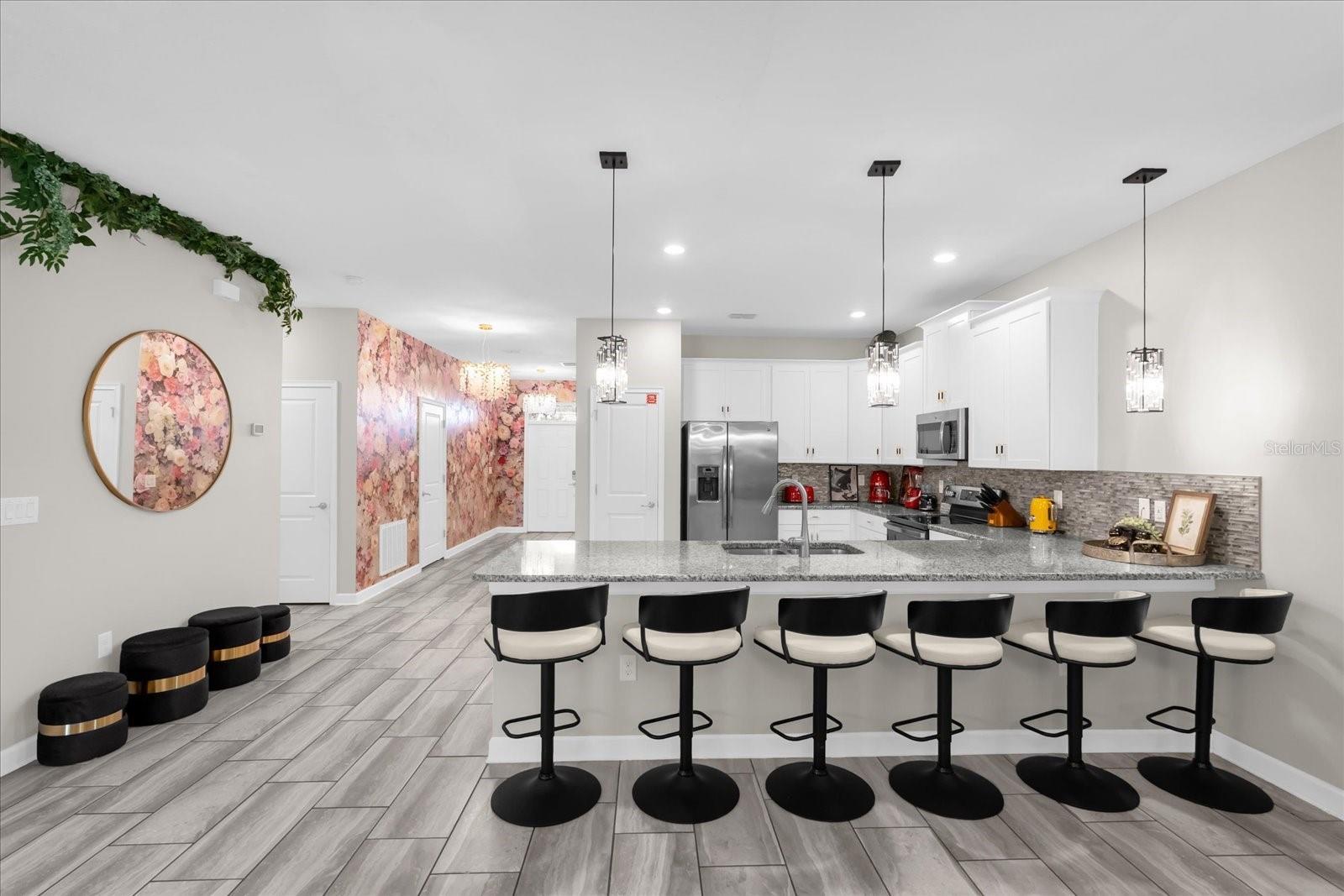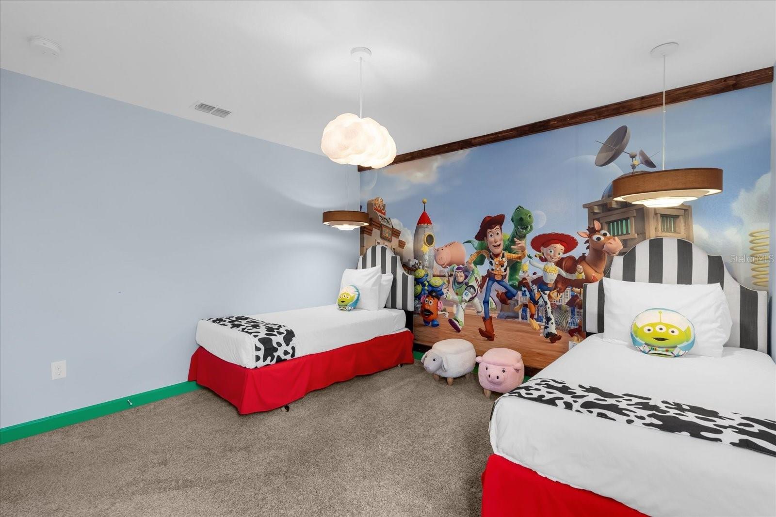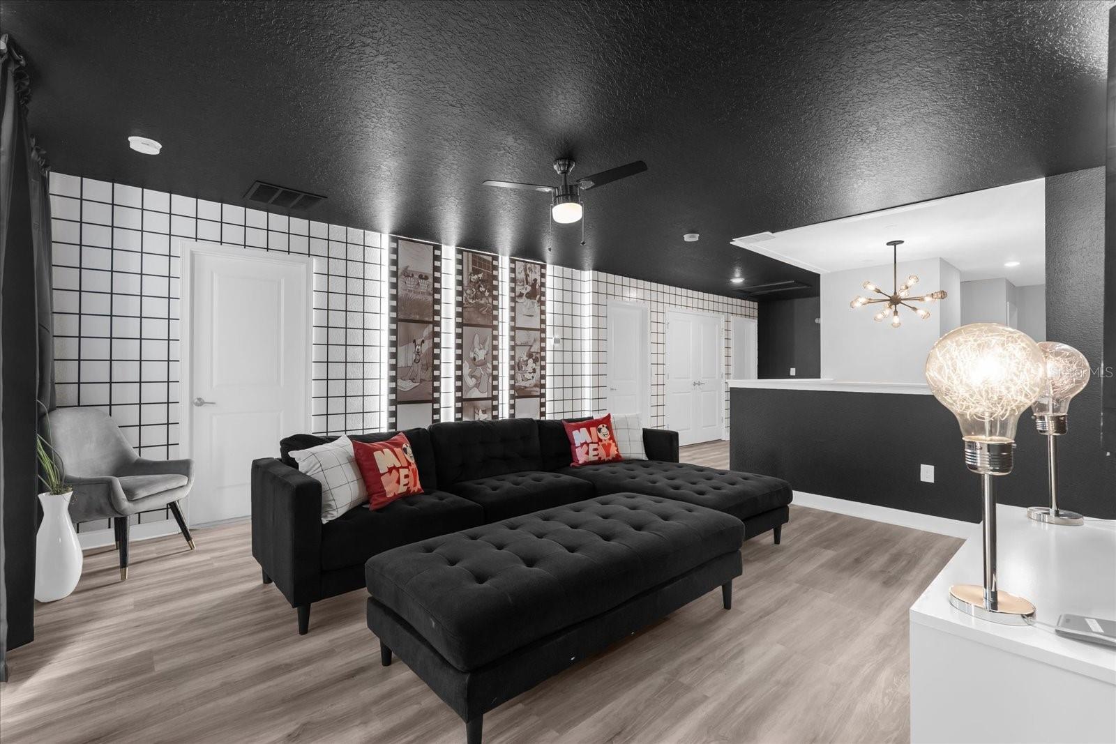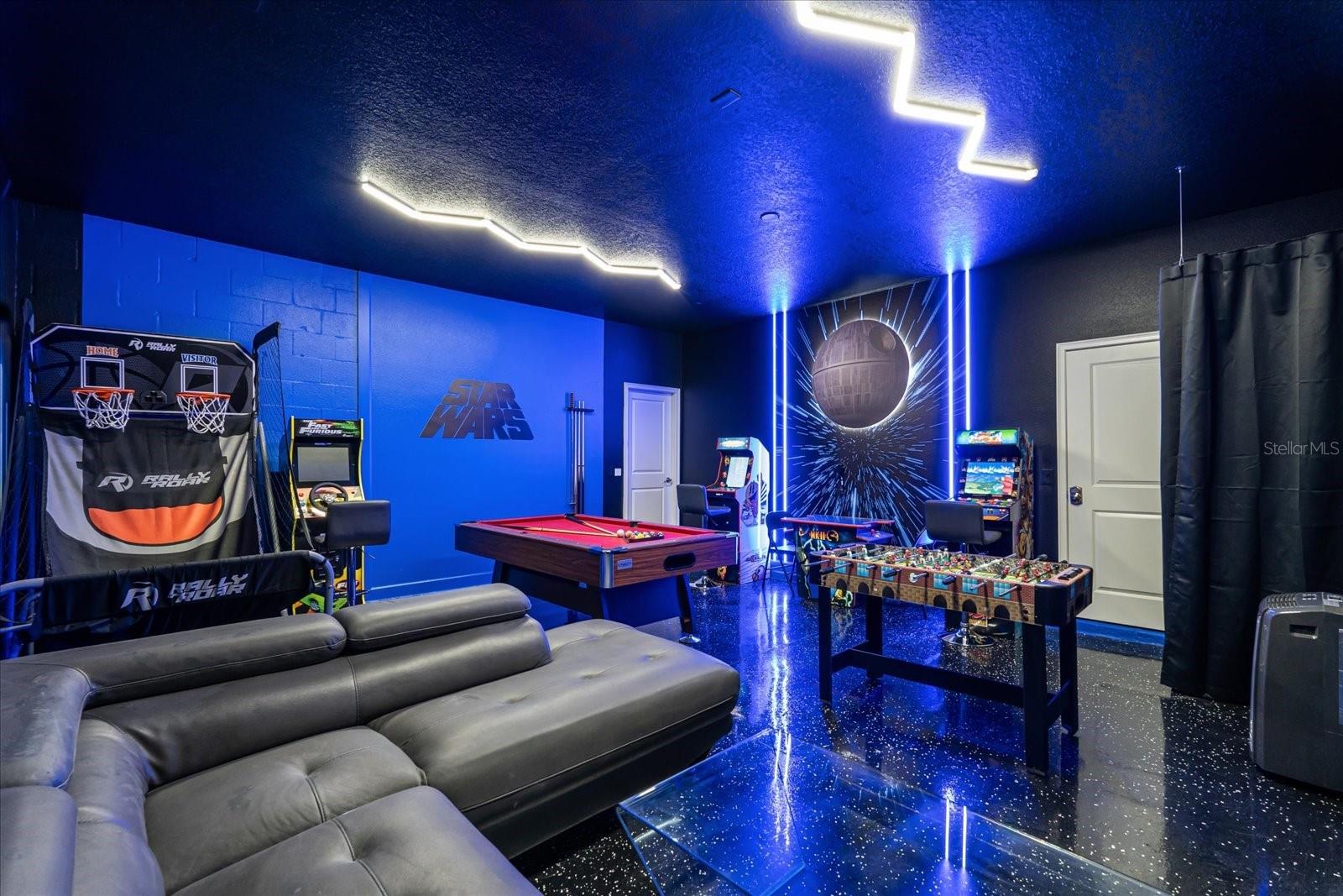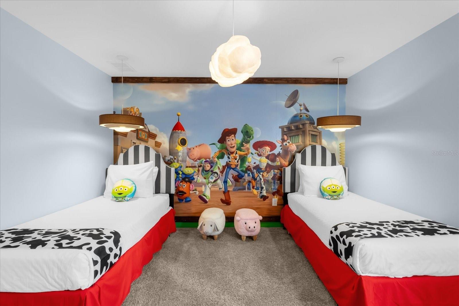 Welcome to this spectacular 8-bedroom, 5-bathroom fully furnished home located in the highly sought-after Retreat at Champions Gate, one of Orlando's premier gated resort communities. Whether you're seeking a high-performing short-term rental or a luxurious second home, this property delivers both style and income—with over $120K in gross rental income in 2023! Professionally designed and filled with natural light, this home features themed bedrooms, a converted game room, and spacious living areas perfect for entertaining. The main level offers two bedrooms, including a primary suite with direct access to the pool deck and an en suite bath with a dual vanity, soaking tub, and glass-enclosed shower. The open-concept kitchen boasts 42" shaker style cabinets, granite countertops, stainless steel appliances, and a bar seating area—flowing seamlessly into the dining and family room. Step outside to enjoy the screen-enclosed pool and lanai, perfect for relaxing or hosting guests. Upstairs, a cozy loft TV room is surrounded by six additional bedrooms and a bonus room that can be converted into a 9th bedroom. The garage-turned-game-room is air-conditioned with epoxy flooring and features a pool table—ensuring endless fun for guests. Just a short walk to the Oasis Clubhouse, where world-class amenities include a lazy river, water slides, splash pad, resort-style pool, fitness center, movie theater, arcade, restaurant, Tiki Bar, and more. A free community shuttle provides easy access to all amenities and nearby golf courses. Located just minutes from Disney, major highways, shopping, and dining, this home is in a zoning phase that allows both short- and long-term rentals—with no restrictions on owner stays. Don’t miss your chance to own one of the most desirable and versatile properties in Central Florida!