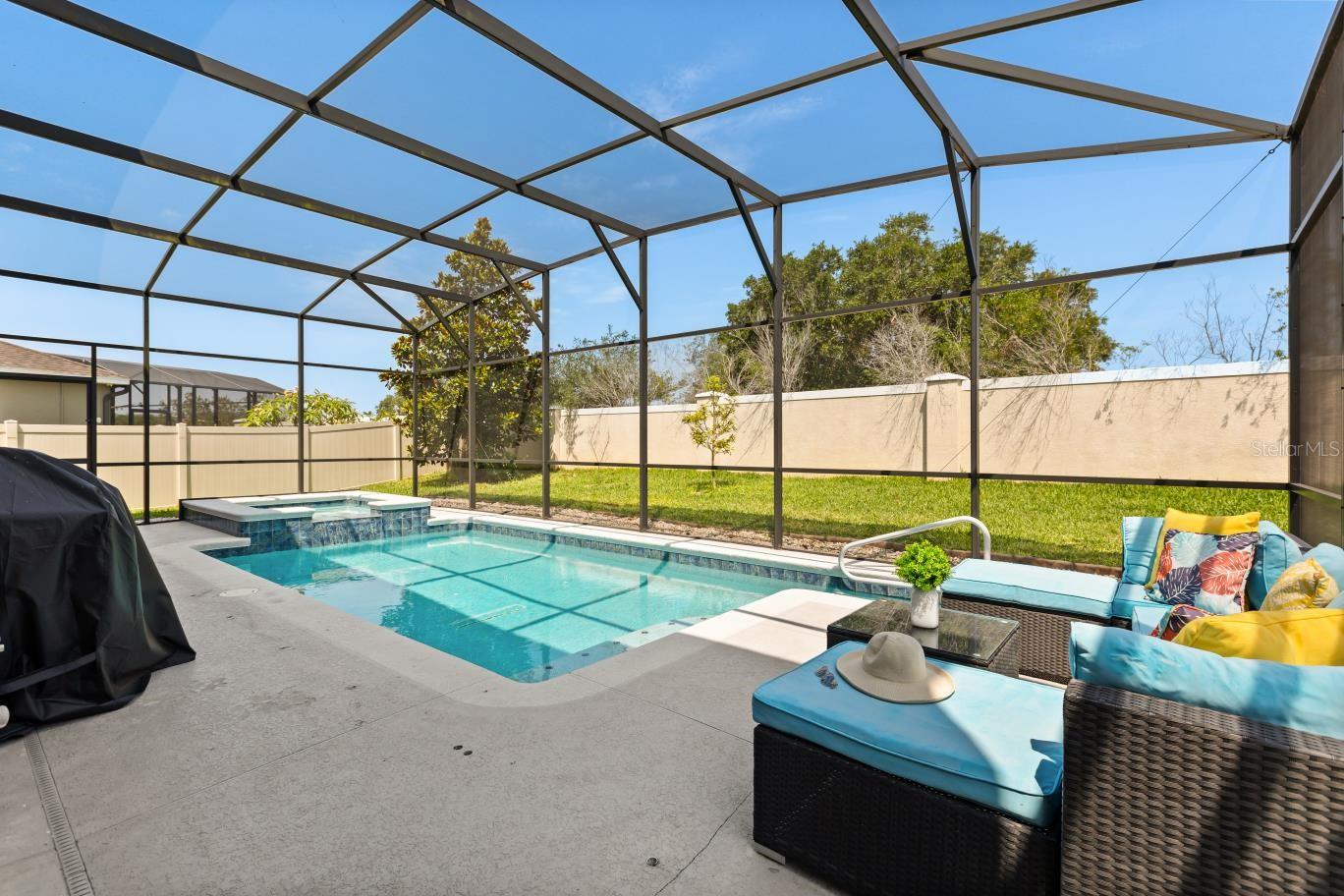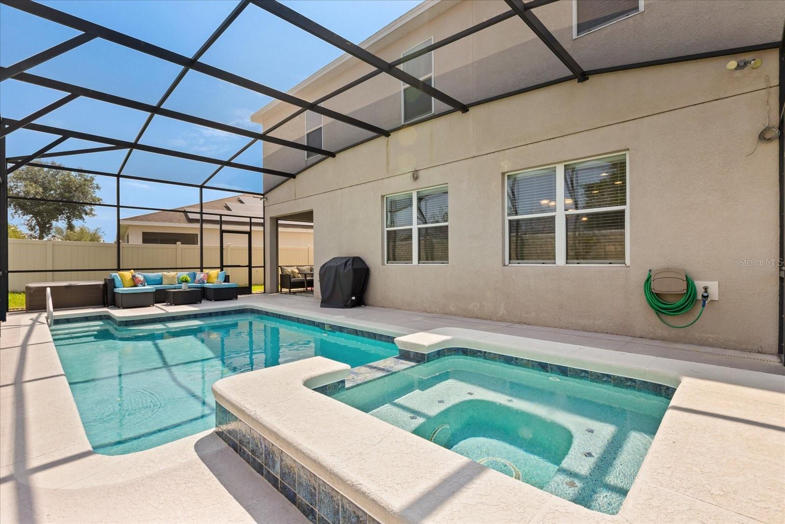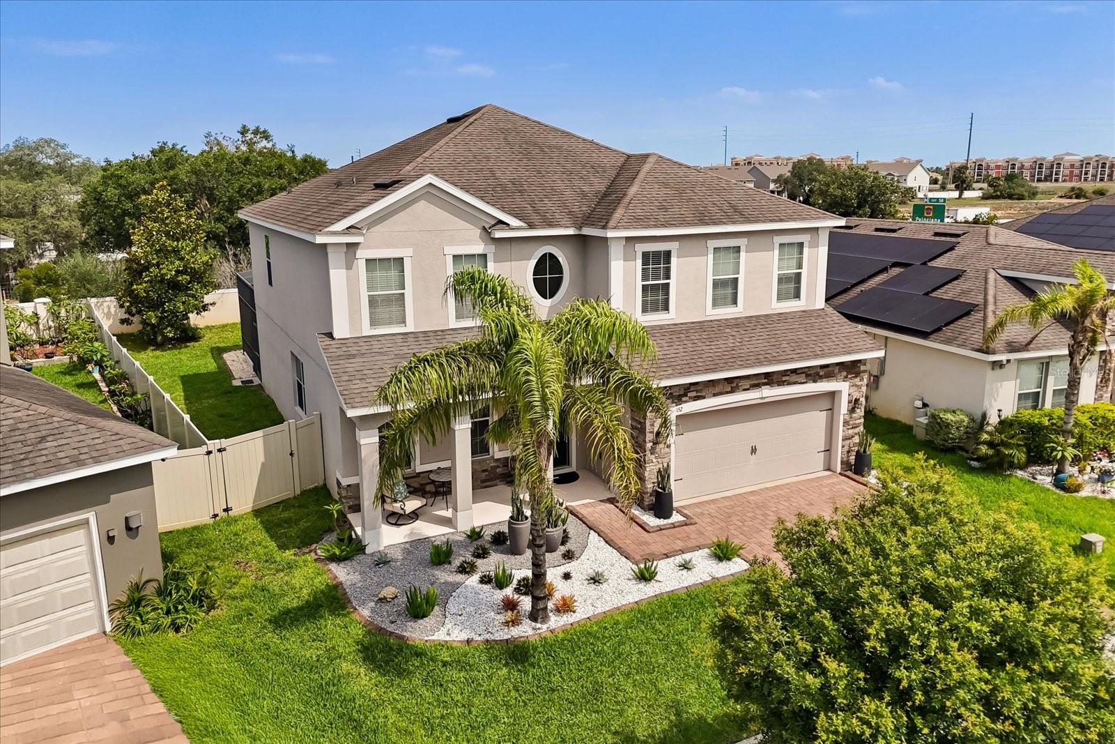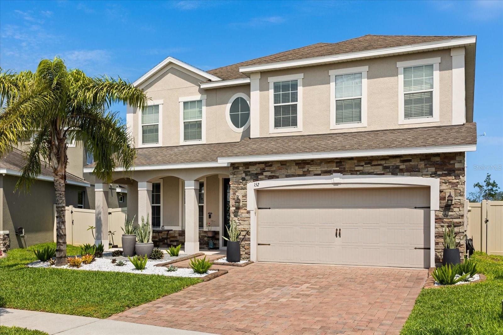 NEW PRICE! Motavited sellers...offering $10K toward buyers closing costs and by downs. Welcome to your dream home in the highly sought-after Champions Reserve community, where resort-style living meets everyday comfort. This beautifully upgraded 5- bedroom, 3-bathroom home features a private pool and spa. stunning curb appeal and luxury finishes throughout. From the moment you arrive, you'll be impressed by the professionally designed landscaping, full irrigation system, and elegant stone facade. Inside, the open and flexible floor plan offers endless possibilities. A dedicated office sits near the entryway perfect for remote work while the adjacent flex space can serve as a formal dining area, sitting room, or even a playroom. On the main level, you'll find a guest bedroom, walk in closet and full bath, ideal for visitors or multigenerational living. The gourmet kitchen is a showstopper with a massive center island, walk-in pantry, 42-inch cabinetry, built-in hutch with glass doors, upgraded glass tile backsplash with accent lighting, and newer stainless-steel appliances (2024). Upstairs, enjoy 4 spacious bedrooms including a luxurious primary suite with dual walk-in closets and a spa like bath featuring a garden tub, double vanity, and separate walk-in shower. You'll also love the oversized bonus room. Perfect as a home theater, game room, or second living area. A centrally located laundry room for added convenience. Two bedrooms feature designer accent walls for added charm and style. Step outside to your private screen-enclosed pool and spa, complete with a covered lanai and extended seating area. Perfect for morning coffee, weekend BBQs, or entertaining guest. Fully fenced backyard offers both privacy and space to relax. Located just minutes from Disney theme parks, world-class golf courses, top-rated restaurants, and the Orlando Airport, this home truly has it all. Move in ready and packed with upgrades- don't miss the chance to live in luxury! NO SHORT-TERM RENTAL.