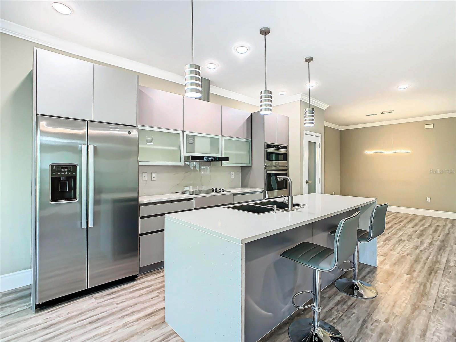 Corner location!!! $10,000 of concession for closing cost!!! 4 bedroom 2.5 bath townhome and a 2-car garage with glass doors. Vinyl flooring throughout the first floor, bathrooms and laundry in second floor. The stairs and second floor have carpet. Stainless steel cable railing in internal stair system. Custom-made doors with horizontal aluminum slats with lever handle on interior doors. Ceiling fans in brushed nickel with frosted opal glass lighting throughout bedrooms and living room. Contemporary-style designer chandelier with matching dining room and island lighting fixtures and much more! On the first floor you are greeted by an open floor plan with lots of light. The kitchen is very modern and features a waterfall granite countertop, marble backsplashes, sleek 42" multi-level European design cabinetry with soft open and slow close function, frosted glass cabinet door with interior lighting, gourmet kitchen and built-in stainless steel. Steel Appliance Package with Combination Microwave, Stove, Range Hood, Dishwasher and Countertop Refrigerator with Ice Maker, built-in wine cooler for 36 bottles, designer faucet with removable sprayer. 5 1/4" pine wood crown molding and baseboards painted and installed in all rooms. Upstairs you have the master bedroom with a tray ceiling with lighting and a stunning balcony to enjoy the views. The in-suite master bathroom is stunning and spacious with freestanding tub, granite counter tops, lighting under cabinet, double sinks, tiled shower, and walk-in closet. The remaining three bedrooms are super spacious and share an additional bathroom with a full shower and double sinks. Providence amenities include dog park, bar/restaurant, clubhouse, zero-entry pool with slides, junior Olympic pool, fitness center, tennis courts, playground and more. NO CDD, low HOA! Eight-year warranty with a home builder's warranty. Located in Golf Club Villas, a luxury development of COMMUNITY TOWNHOMES WITH GOLF at Providence Golf and Country Club, featuring an 18-hole designer golf course designed by Michael Dasher located just minutes from Disney and major attractions.
