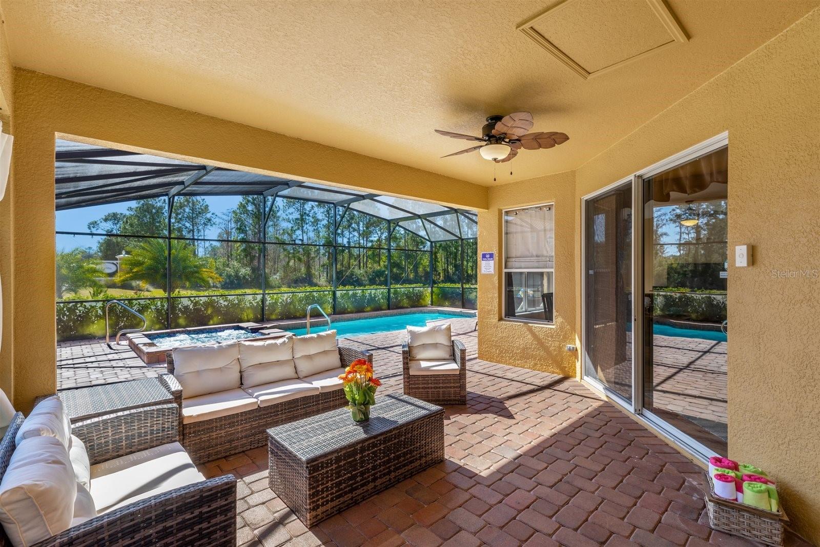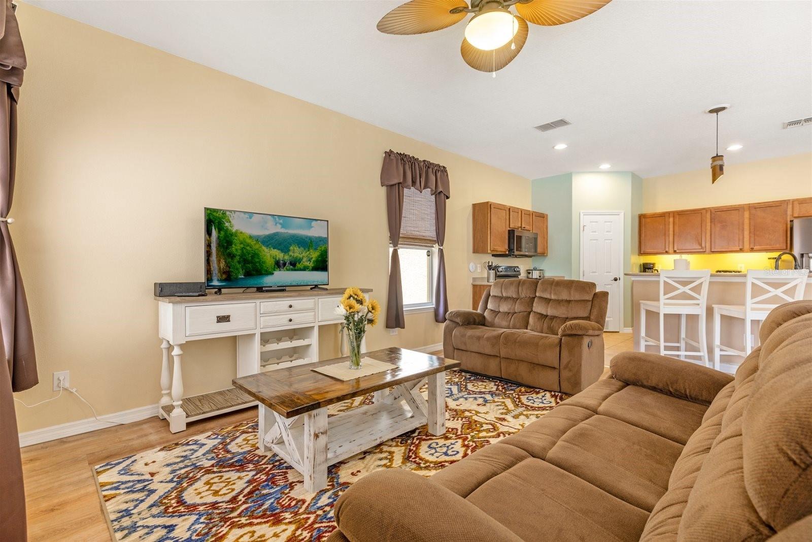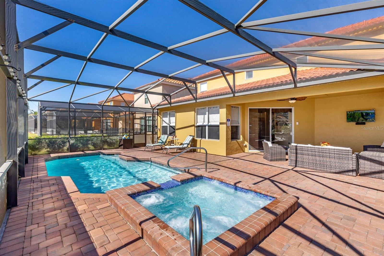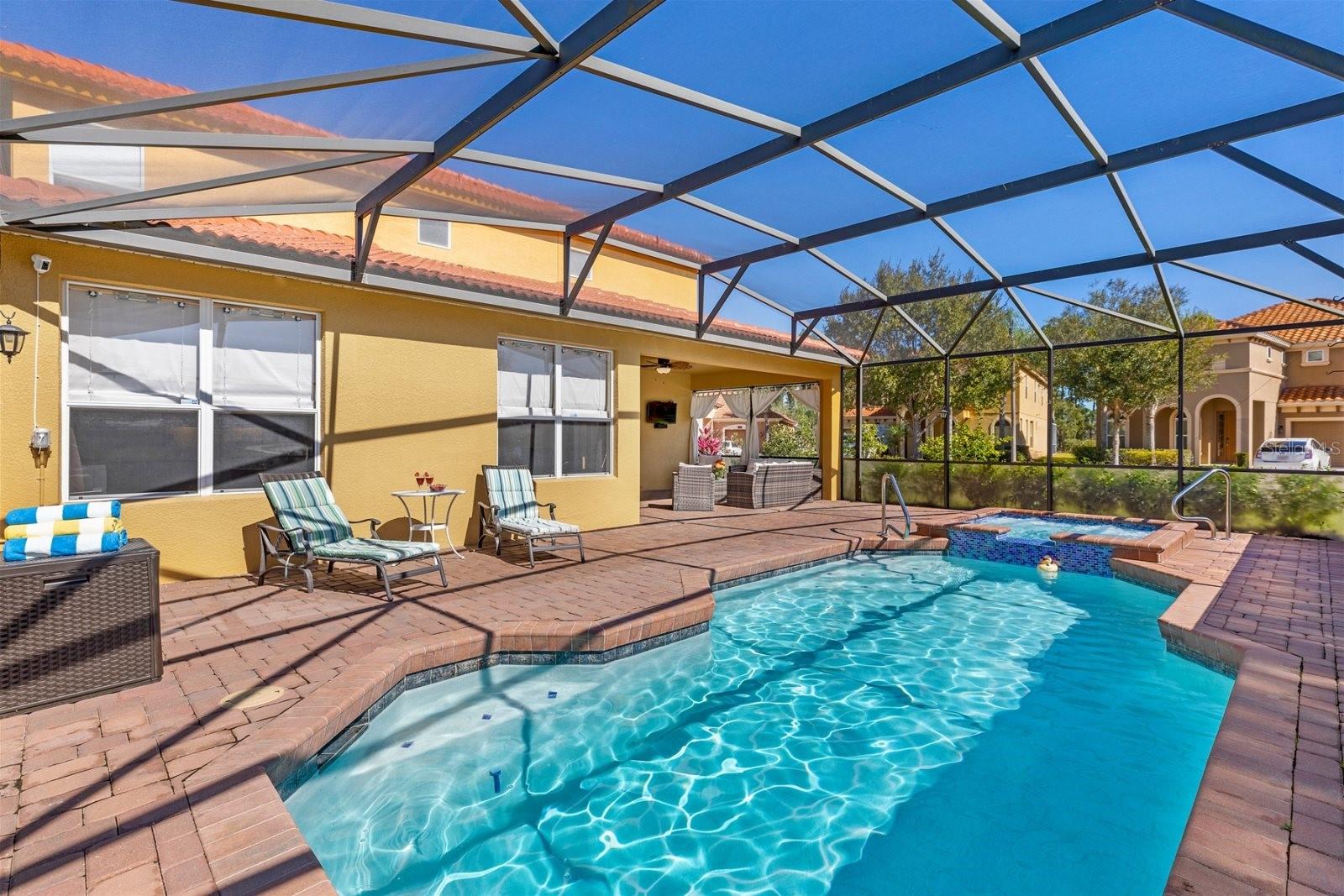Welcome to this beautifully maintained 4-bedroom, 4-bathroom pool and spa home, perfectly suited as a primary residence or an exceptional short-term rental for families visiting Central Florida. Situated on a spacious corner lot with no rear neighbors, the home offers peaceful views of a lush conservation area. Located in the secluded highly desirable, resort-style gated community of Watersong, residents enjoy access to a well-appointed clubhouse, resort pool, playground, fitness center, and meticulously landscaped surroundings. The HOA covers cable, internet, and lawn care—so you can relax and enjoy the Florida lifestyle without the extra hassle. Inside, the main level features a large open-concept kitchen equipped with Stainless Steel appliances, a regular pantry, and a lock-off owner’s pantry—both enhanced with custom California Closet shelving. The kitchen opens seamlessly into the dining and family room areas and includes an island with a breakfast bar—ideal for hosting and gathering. Also on the first floor is a versatile bedroom with a semi-ensuite bath. Upstairs, a generous loft area leads to a spacious primary suite and two additional ensuite bedrooms. The large garage has a fun games room with great lighting and new epoxy floor. Step outside to enjoy beautifully manicured landscaping, a covered lanai, and a screened-in pool and spa, both resurfaced in 2018. Custom pavers add a stylish touch to the outdoor space, while a new garage door opener and exterior repaint complete the home's recent upgrades. Move-in ready and available with furnishings, linens, and housewares—negotiable for those seeking a turnkey rental opportunity. Conveniently located in Davenport, just a short drive to Orlando’s major attractions (Disney, Universal, SeaWorld). The current management company will come highly recommended by the owners, for those buyers looking to use it as vacation home.