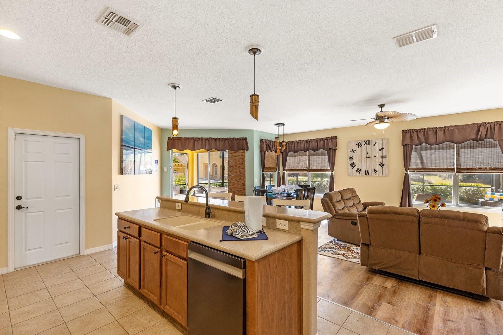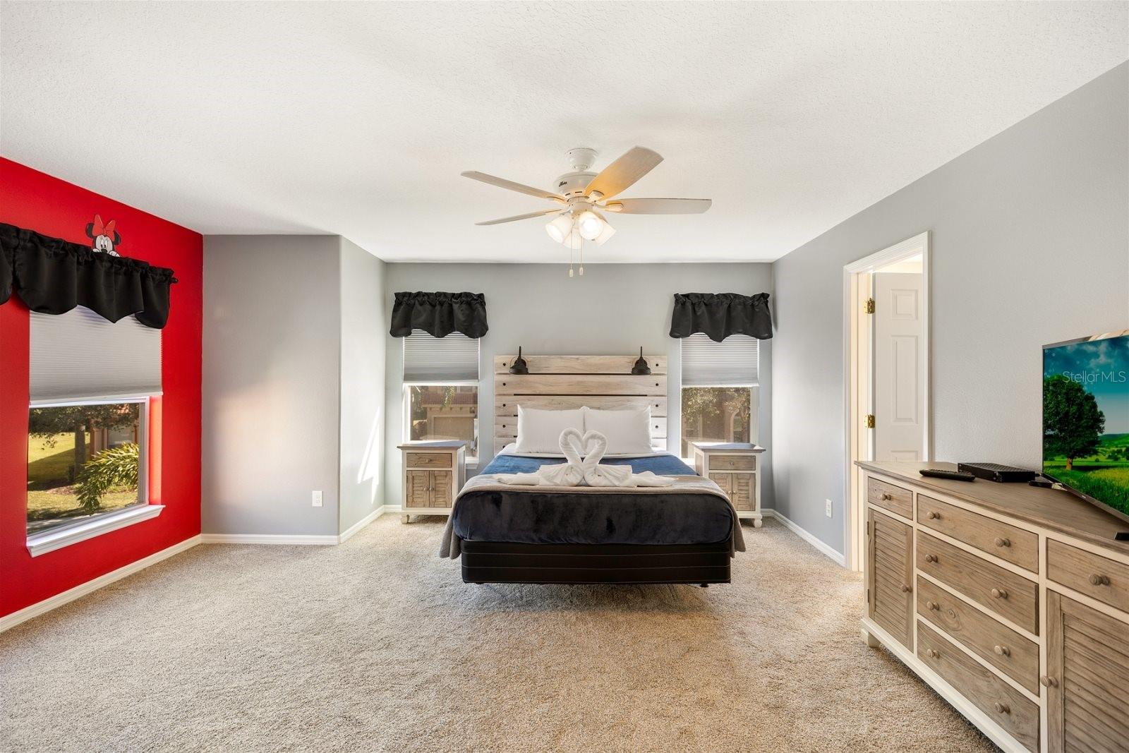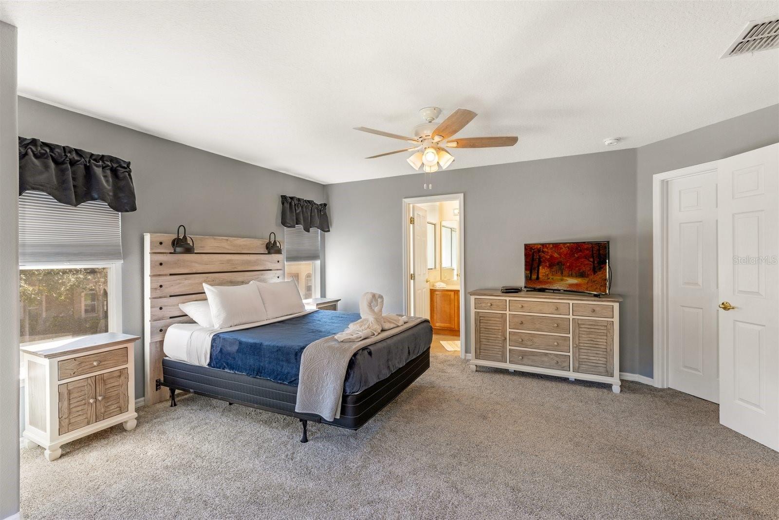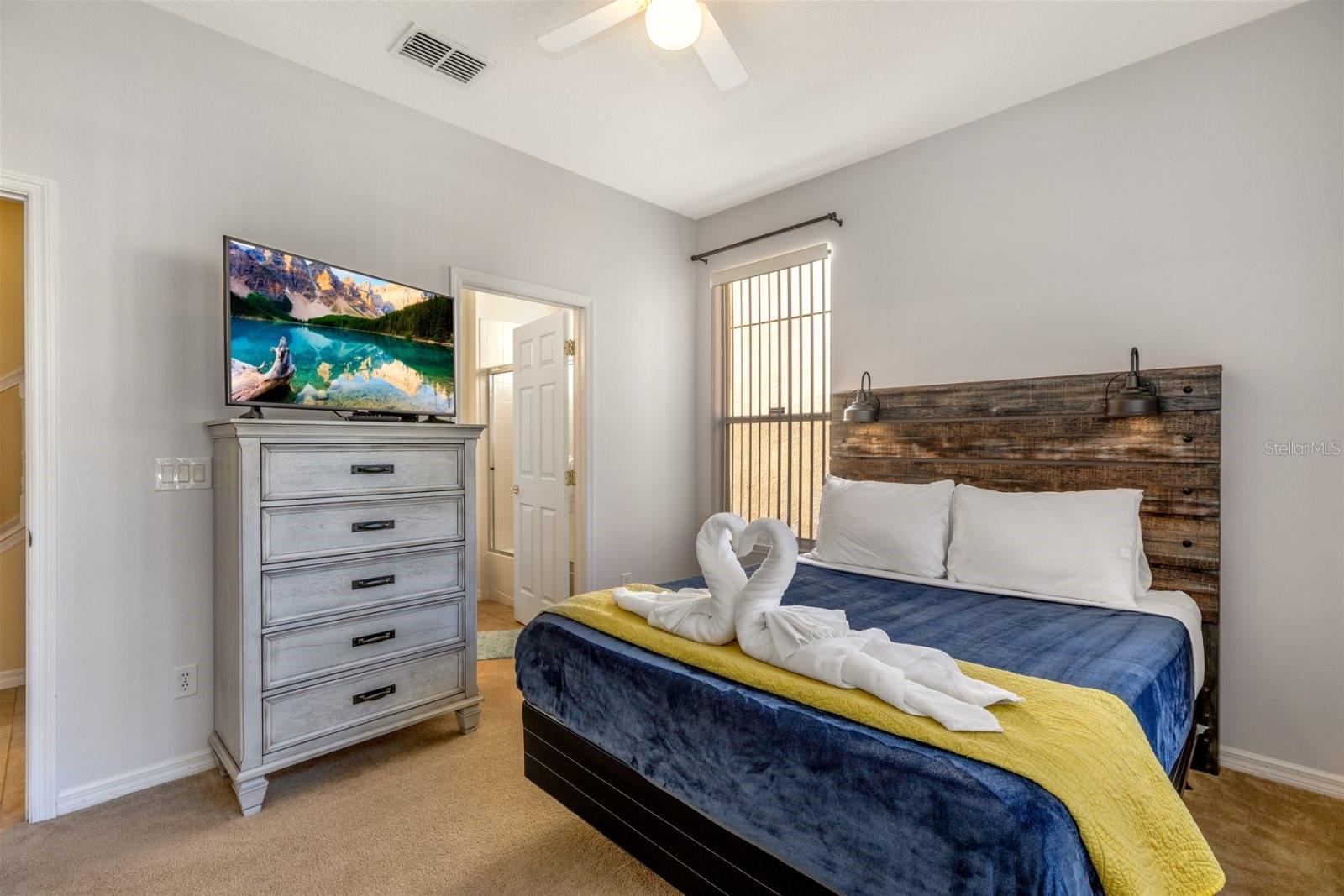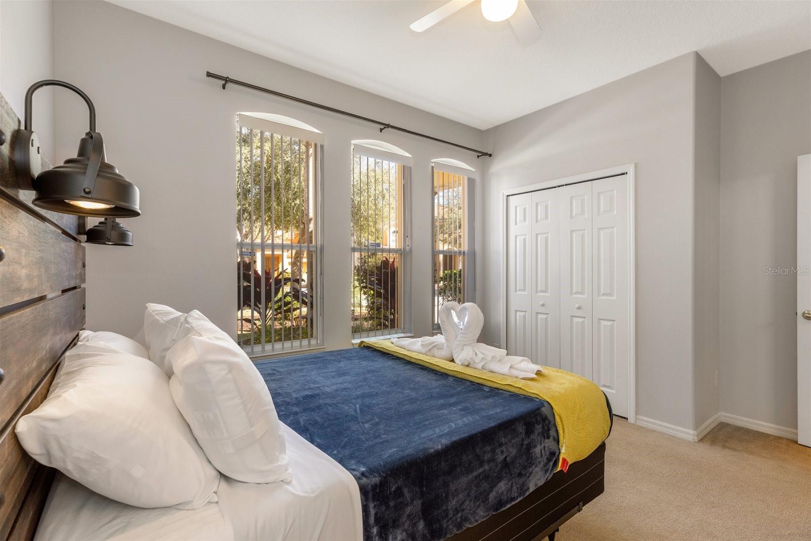 Welcome to this beautifully maintained 4-bedroom, 4-bathroom pool and spa home, perfectly suited as a primary residence or an exceptional short-term rental for families visiting Central Florida. Situated on a spacious corner lot with no rear neighbors, the home offers peaceful views of a lush conservation area. Located in the secluded highly desirable, resort-style gated community of Watersong, residents enjoy access to a well-appointed clubhouse, resort pool, playground, fitness center, and meticulously landscaped surroundings. The HOA covers cable, internet, and lawn care—so you can relax and enjoy the Florida lifestyle without the extra hassle. Inside, the main level features a large open-concept kitchen equipped with Stainless Steel appliances, a regular pantry, and a lock-off owner’s pantry—both enhanced with custom California Closet shelving. The kitchen opens seamlessly into the dining and family room areas and includes an island with a breakfast bar—ideal for hosting and gathering. Also on the first floor is a versatile bedroom with a semi-ensuite bath. Upstairs, a generous loft area leads to a spacious primary suite and two additional ensuite bedrooms. The large garage has a fun games room with great lighting and new epoxy floor. Step outside to enjoy beautifully manicured landscaping, a covered lanai, and a screened-in pool and spa, both resurfaced in 2018. Custom pavers add a stylish touch to the outdoor space, while a new garage door opener and exterior repaint complete the home's recent upgrades. Move-in ready and available with furnishings, linens, and housewares—negotiable for those seeking a turnkey rental opportunity. Conveniently located in Davenport, just a short drive to Orlando’s major attractions (Disney, Universal, SeaWorld). The current management company will come highly recommended by the owners, for those buyers looking to use it as vacation home.