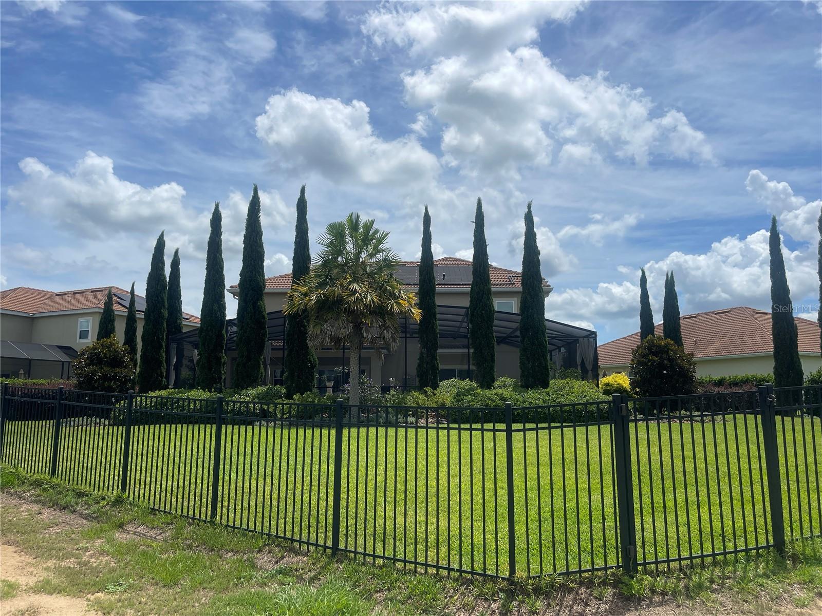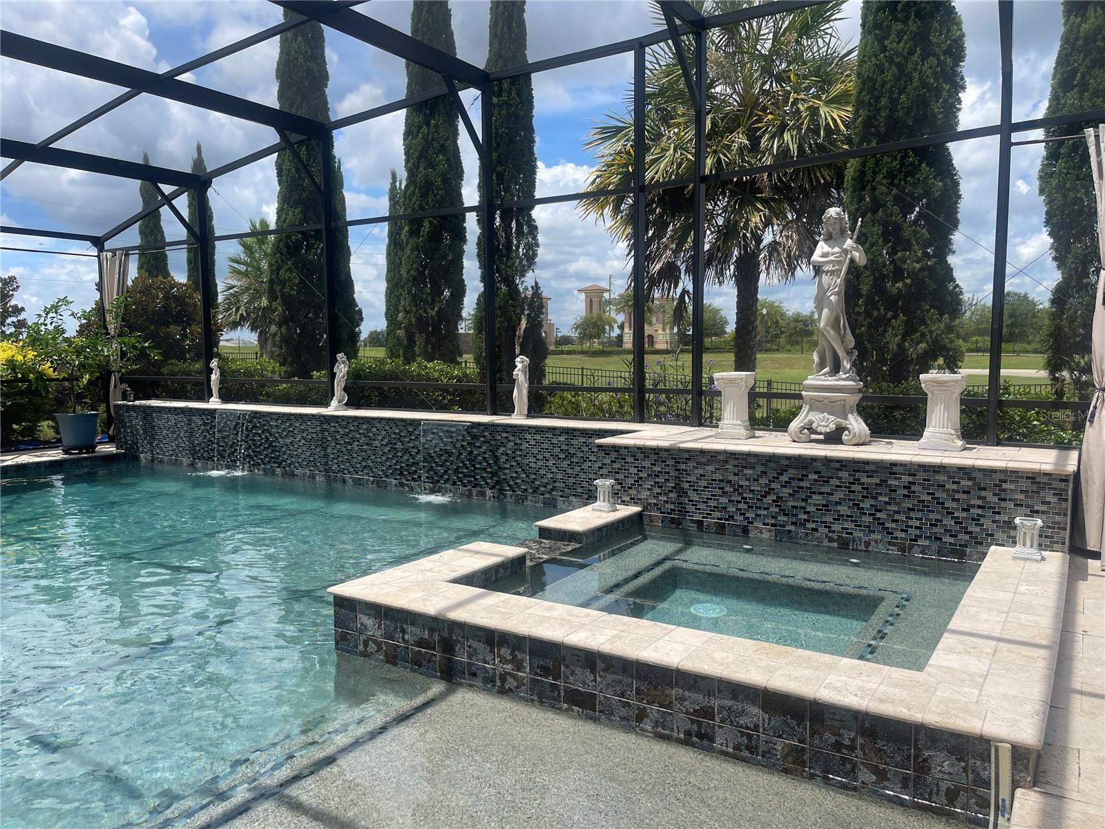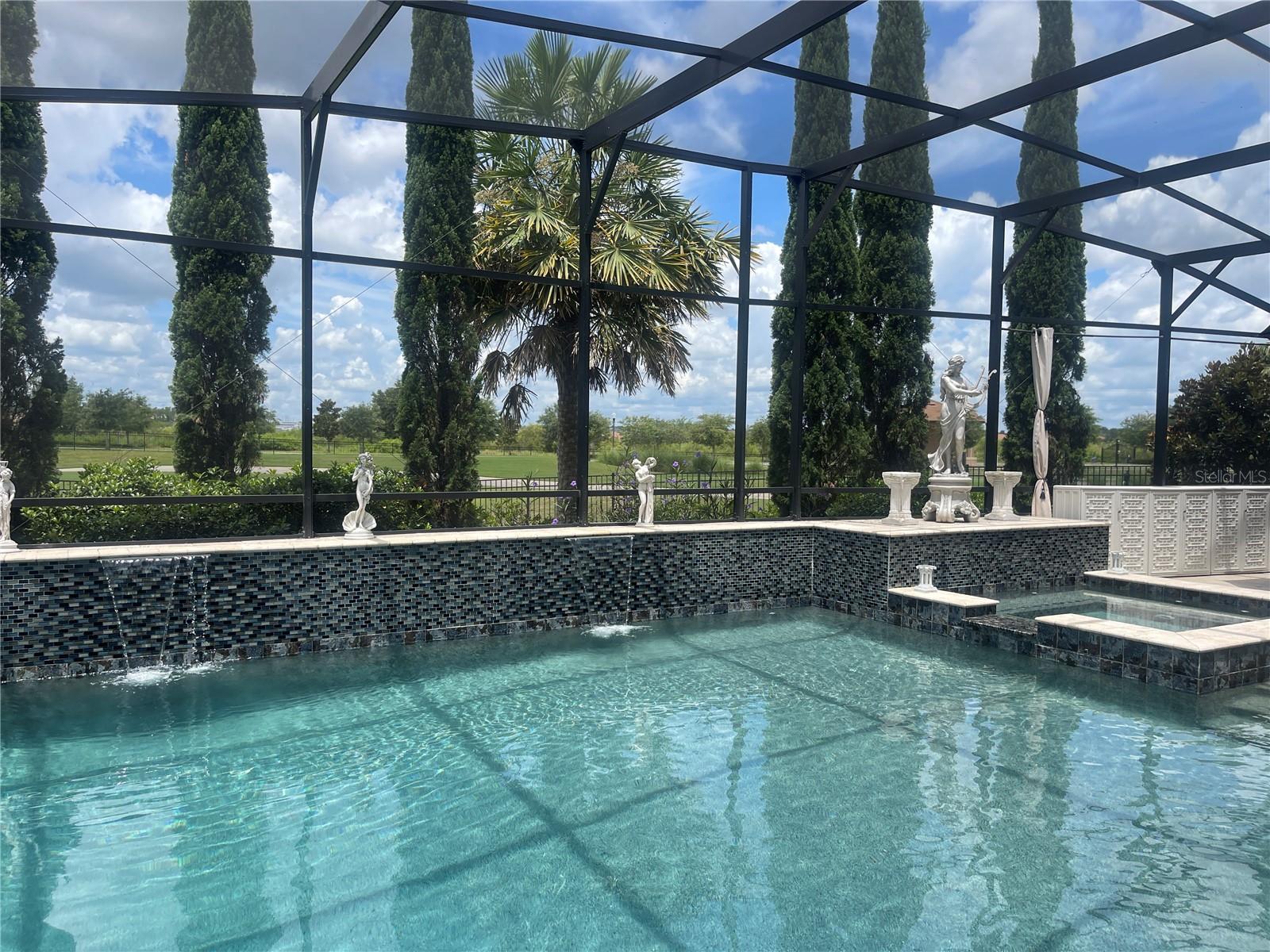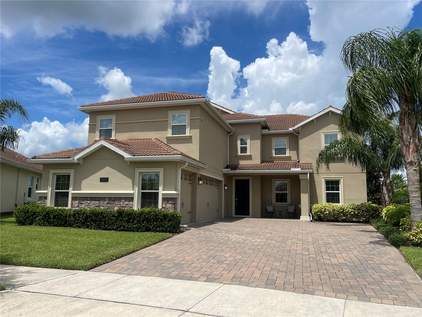 CHAMPIONS GATE BEAUTY! BEST LOT WITH THE BEST VIEWS OF THE GOLF COURSE! INCLUDES GOLF, TENNIS, PICKLE-BALL, RESORT POOLS all included when you reside in sought after CHAMPIONS GATE! This premium lot offers fantastic views of the 3rd Hole of this championship course. Not many Buckingham models built on an estate lot this size. Plenty of privacy. The salt system Pool with relaxing Spa, has two heat sources, solar and electric. Two waterfall features in this custom designed pool area with a tiled waterfall. Colorful LED pool lights will make all the fun! Relax in your spa after a day at the theme parks or just a relaxing day with friends. You will want to host the pool parties! The Expansive Travertine Tiled Lanai transposes you to a tuscan villa atmosphere where you can dine alfresco everyday while enjoying the colorful evening sunsets, complete with sun safe privacy shades. This well thought out home is professionally landscaped with beautiful palms and Italian cypress trees all enclosed within a five foot aluminum fenced yard. Great for the kiddos and pets. This Five bedroom palatial home is perfectly styled for entertaining your guests. The Chefs kitchen boasts a center island with quartz counters and lovely cabinetry. Open floor plan gives way to enjoy conversing with your great room guests. Outstanding Views of the pool and golf from these areas. The Three car side entry garage gives way to elegant curb appeal and your generous paver driveway allows plenty of parking for your visitors. Inside, the Main floor hosts an ensuite bedroom and bath. Included in this home is a Formal Dining area and living room or office. You will find easy to maintain, designer wood look tile floor throughout on the main level. The elegant open stairway leads to the Primary Suite with sitting area, two walk in closets and a spa like bath that has plenty of room for luxury relaxation. Upgraded designer lighting! Enormous Bonus Room upstairs can be a home theater or a true Great Room! Additional generous sized guest bedrooms, one with a Murphy bed, large guest bath and laundry area upstairs. This well maintained home awaits your visit. Home is complete with a barrel tile roof. GOLF, TENNIS & PICKLE BALL are Included with HOA payment, which also includes full lawn care and shrub weekly maintenance, includes internet and cable TV, putting green, parks, neighborhood pool, manned security; plus two resort style activities centers with lazy river, movie theater, fitness centers, splash pads, and an array of planned activities are included! This GUARD GATED COMMUNITY is a stellar and highly regarded subdivision. Close to shopping, dining, Central Florida theme parks and the airport, making your commute a breeze. One hour to either coast for beaches. Home has been well maintained by original owner. No short term rentals allowed in this residential area. $75 monthly food credit from your HOA dues allows you to dine in or take out, at the Private Residents Only PLAZA Club which also offers a FITNESS CENTER, SAUNA, CABANA, Community Pool and outdoor bar. Come see for yourself what other communities wish they had...Be A Part of The Championship Life! You have access to Full Golf, Tennis, Pickle Ball and the OASIS RESORT, lazy river, movies, fitness center, arcade, outdoor pools, splash pad, truly Amazing!! This is the life you dream about! Theme Parks are minutes away....Hurry!