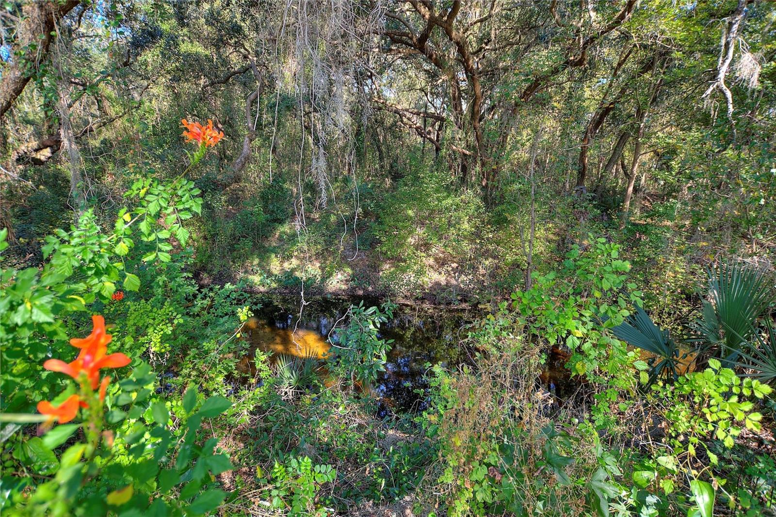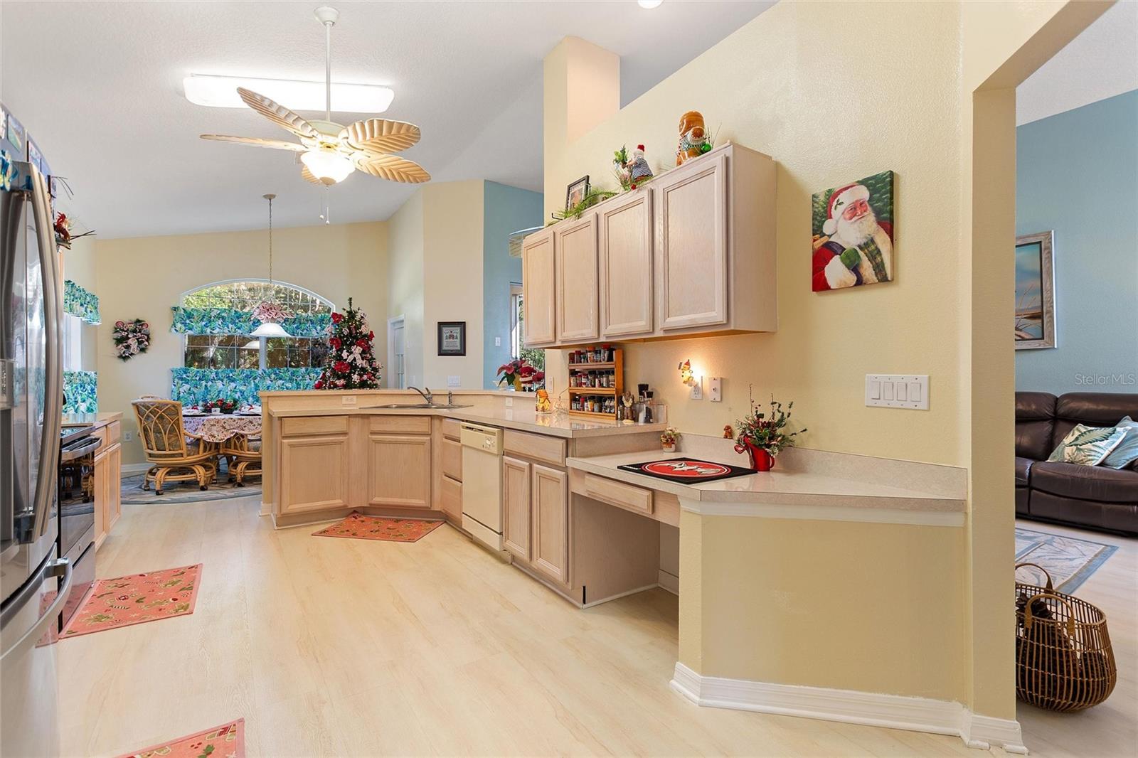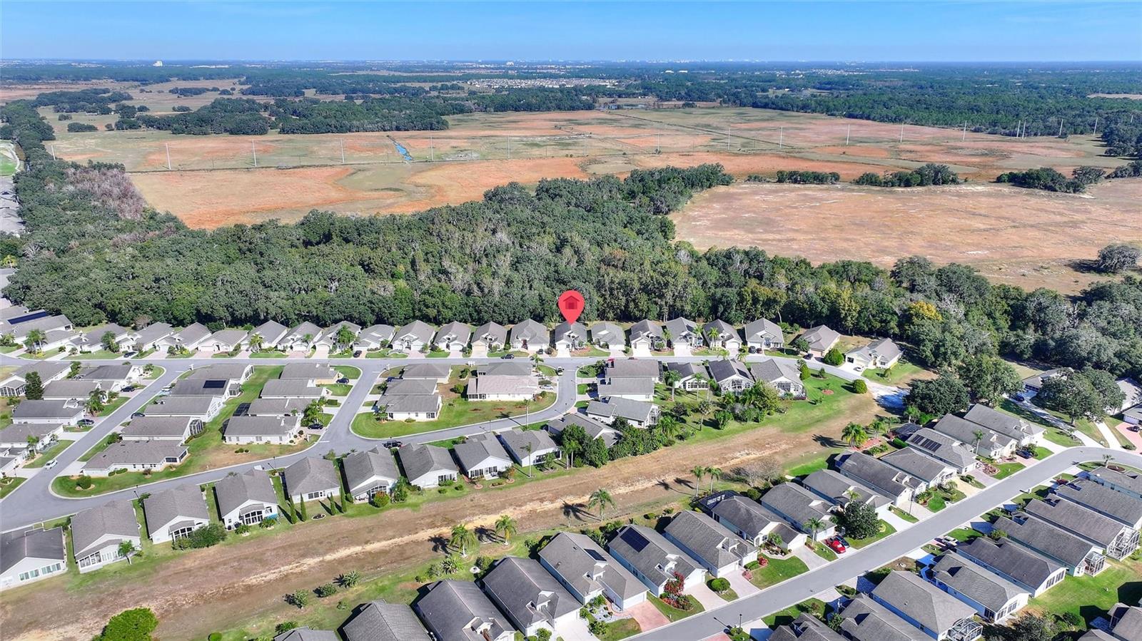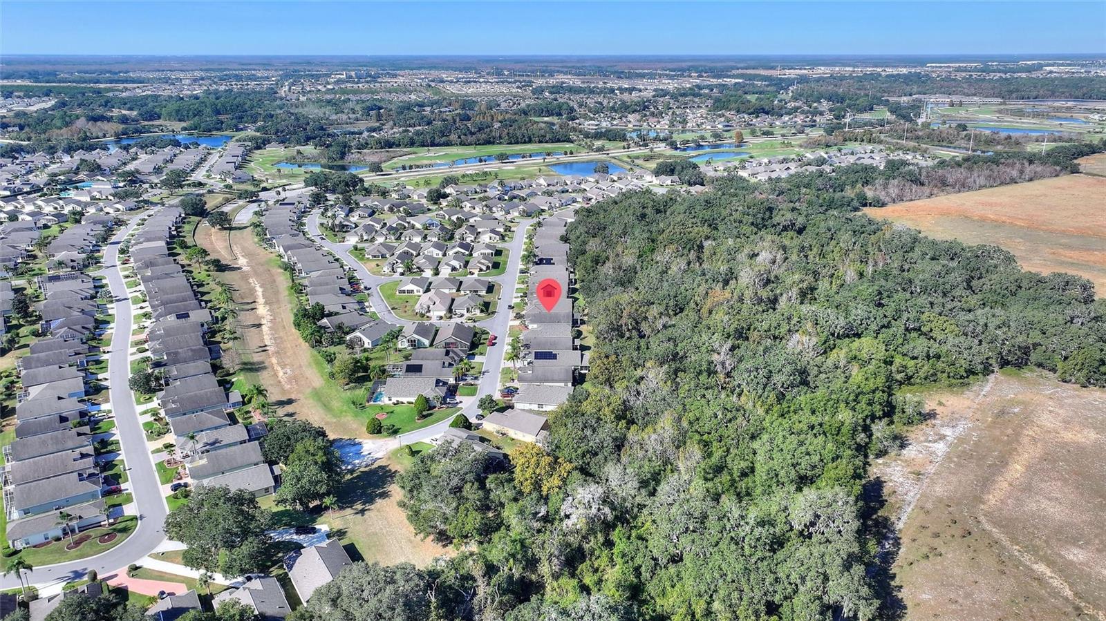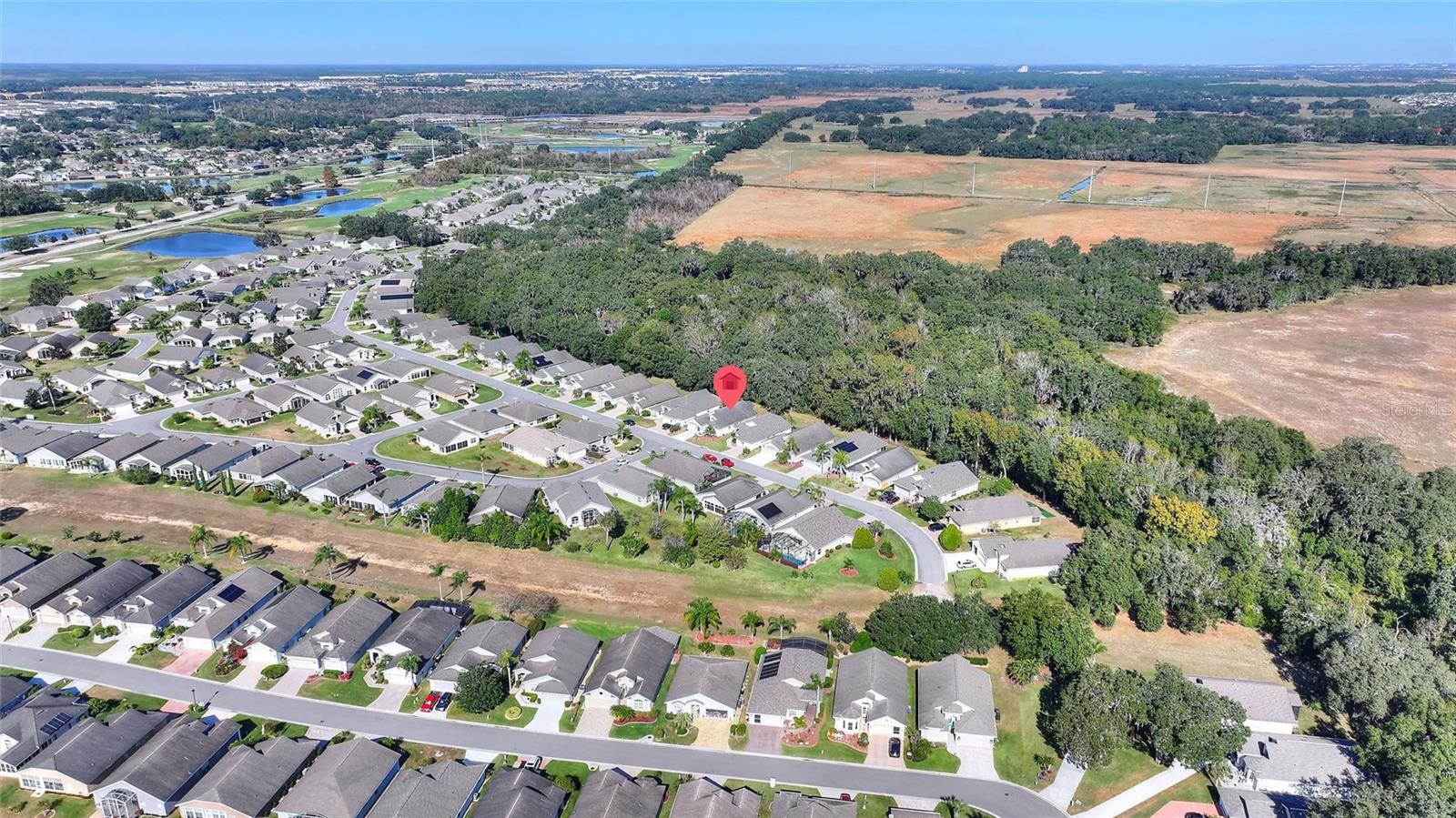 The Favorite - RidgeDale 3/2 with Preferred Bay Window elevation on Conservation Lot overlooking Horse Creek has 24 kW Generac Whole-House Generator, Solid Surface Floors, Kinetico Whole-House Water Treatment System, Extended Garage and a 260 SF North-Facing Covered & Screened Lanai, located just 0.4 miles from the High Vista 55+ private clubhouse and amenity center. 12 FT ceiling in central Great Room with a wall of patio doors to lanai and patio. Eat-in kitchen has breakfast bar, pantry, desk, broom closet and vaulted ceiling. Cathedral ceiling in primary en suite bedroom with walk-in and linen closets. Split bedroom design offers two guest bedrooms with a full bath and linen closet nestled between them. Corridor laundry room to garage has utility sink and closet. 2017 roof, 2020 water heater, newer sinks in both bathrooms, newer front storm door with integrated screen and some newer ceiling fans. Garage has sliding screens, pull-down ladder access to attic. Garage refrigerator is reserved. Sold As-Is. Ridgewood Lakes is a golf cart friendly community. $230 monthly High Vista HOA fee includes Spectrum internet and basic cable TV with 2 cable boxes, lawn mowing and exclusive access to resident-owned 12,000 SF private High Vista clubhouse and amenities. $425 semi-annual Ridgewood Lakes HOA fee provides 24x7 staffed security gate and master association-owned private road maintenance. Adjacent to 18-hole White Heron Golf Club with The Nest restaurant, privately owned and open to the public. High Vista is a 55+ community with outdoor heated pool and spa, fitness center, library, pub & many organized activities. Pickle ball, tennis, bocce and shuffleboard courts. Miles of biking and walking trails within Ridgewood Lakes gated community. Shopping, Disney, Universal, Orlando & Central FL entertainment nearby, easy access to I-4, medical facilities, airports & Sunrail Station. Advent Health hospital is 3 miles away.
