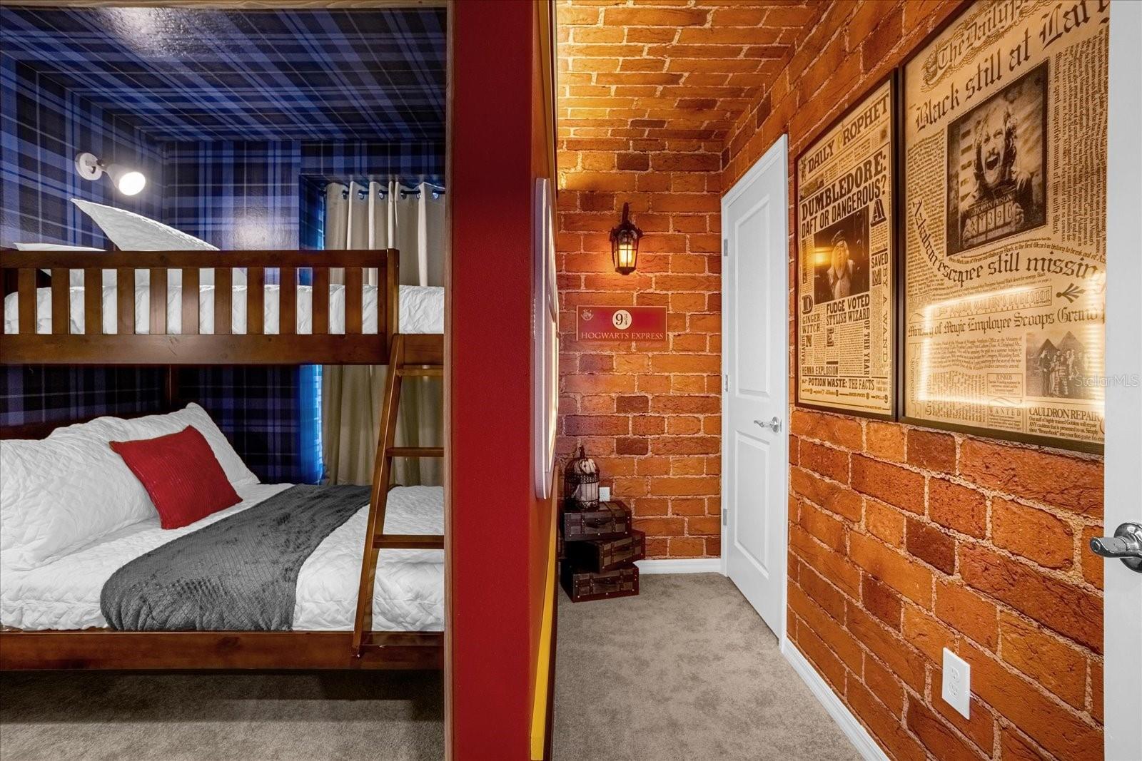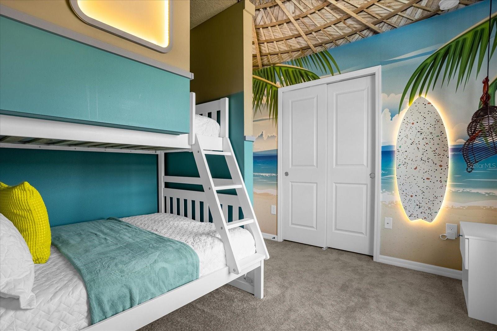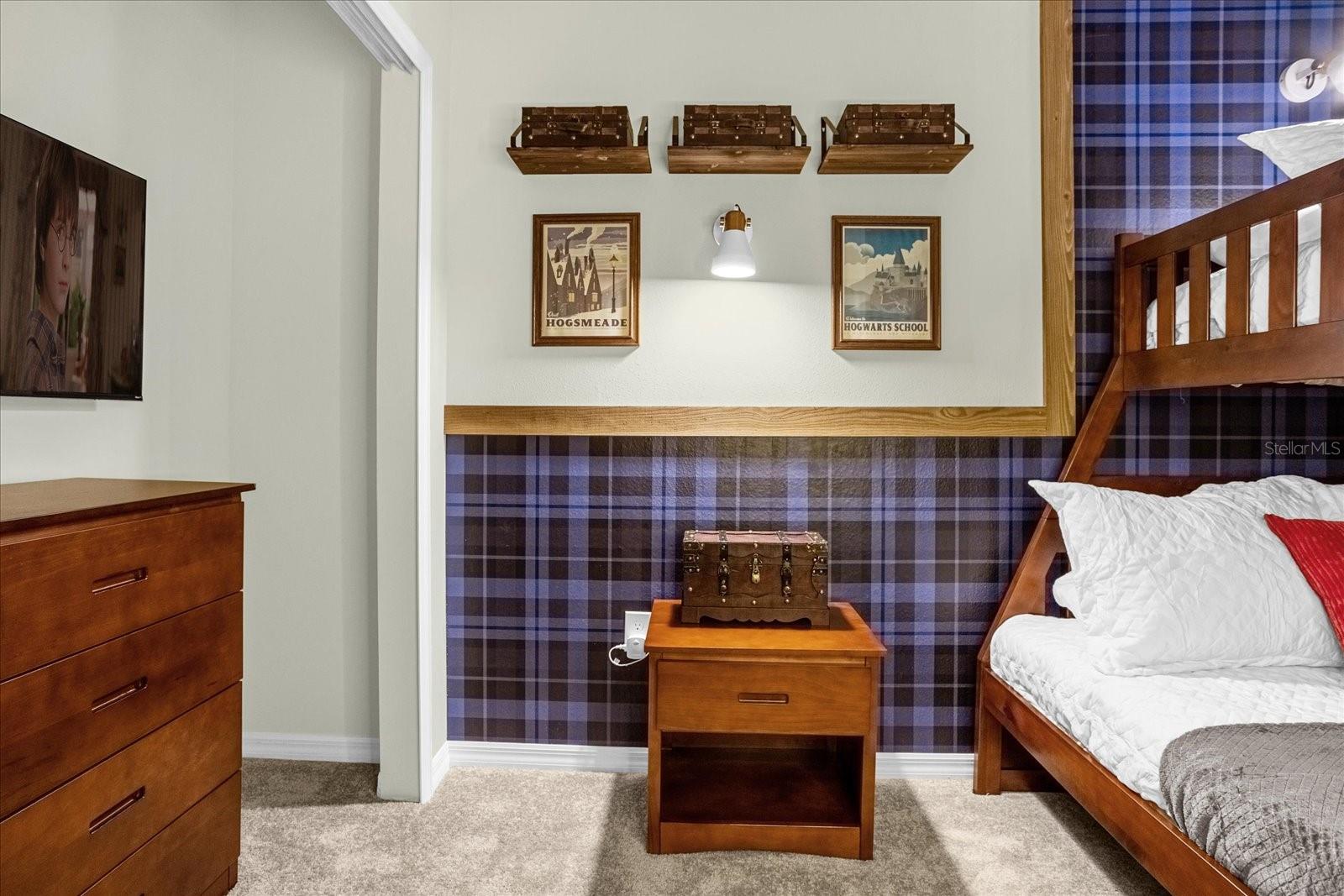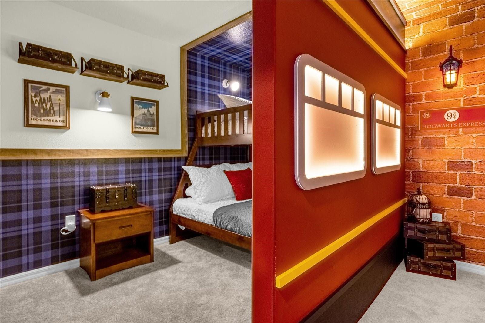 Welcome to this exquisite end-unit townhome in the prestigious Windsor Island Resort, Davenport's ultimate vacation destination! This 2023-built gem offers 5 bedrooms and 4.5 bathrooms across 2,293 sq ft of under AC space, on a premium corner lot, providing enhanced privacy, natural light, and serene views. Fully furnished and turnkey-ready for short-term rentals with no lease restrictions, it's an investor's dream blending luxury, fun, and high revenue potential. Enter an open-concept layout with elegant ceramic tile flooring in main areas and plush carpeting in bedrooms, showcasing fantastic professional interior design. The gourmet kitchen features white shaker cabinets, granite countertops, stainless steel appliances (including Whirlpool refrigerator, dishwasher, range, microwave), a large island with pendant circle lights seating 4, and potted plants for a fresh touch—perfect for family gatherings. Adjacent, the dining area boasts a sleek white pedestal table with 8 gray upholstered chairs under a crystal chandelier, reflecting modern sophistication. Relax in themed bedrooms that delight: a Mickey Mouse surf-themed kids' room with thatched ceiling, illuminated surfboard mural, VW van bunk beds (twin over full), white dresser, and beachy vibes; a Harry Potter-inspired retreat with plaid wallpaper, wooden bunk beds (twin over full), vintage posters, lantern lighting, and trunk decor; plus luxurious master suites—one with king bed, wooden headboard wall, neon circle sconce, floating white nightstand, beige throw, and leather accents; another in green tones with velvet throw, modern pendant drops, mirrored headboard, and bench. All include smart TVs, ample storage like white dressers or built-ins, and en-suite baths. The loft/game room transforms into a Star Wars galaxy with neon LED accents, murals of BB-8 and C-3PO, purple lighting, sectional sofa, armchairs, and TV for immersive entertainment. Outdoors, your screened lanai encloses a private heated pool and spa with child safety fence, paver deck, lounge chairs, dining set for 6, and grill—ideal for al fresco evenings overlooking green space. Enjoy Windsor Island's resort-style amenities: 24/7 gated security, 6,500 sq ft clubhouse with arcade, fitness center, sundry shop; zero-entry pool with lazy river, dual waterslides, splash pad, hot tub, cabanas, hammocks; tiki bar/restaurant, mini golf, basketball/volleyball courts, soccer field, corn hole, tennis, firepit, and event lawn—all enhancing guest appeal. Just 9 miles from Disney World, minutes from Universal, SeaWorld, outlets, and dining, this west-facing haven offers convenience and tranquility. Whether for personal use or lucrative rentals, seize this standout opportunity—schedule your showing today!