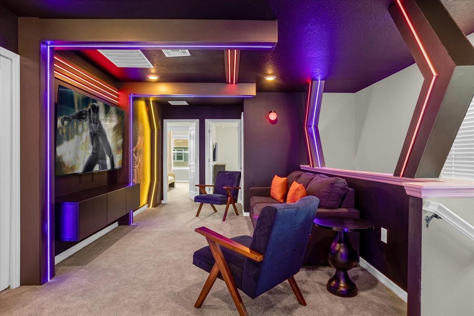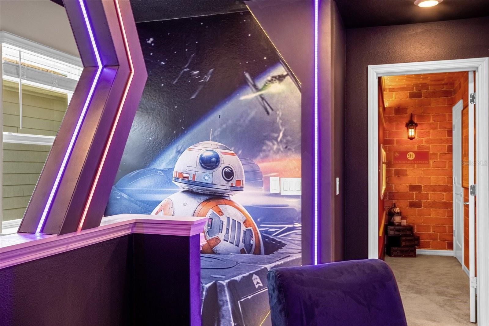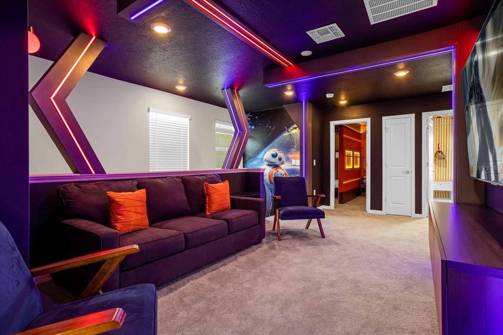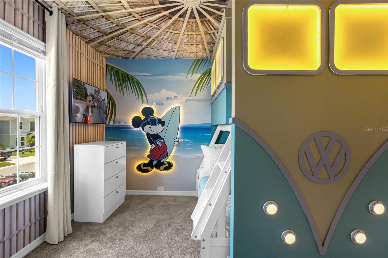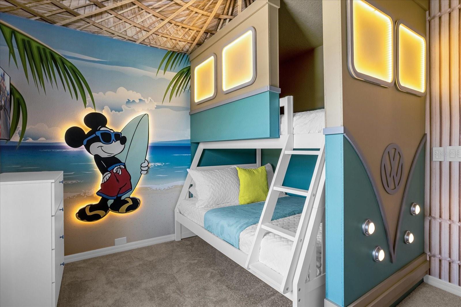 Welcome to this exquisite end-unit townhome in the prestigious Windsor Island Resort, Davenport's ultimate vacation destination! This 2023-built gem offers 5 bedrooms and 4.5 bathrooms across 2,293 sq ft of under AC space, on a premium corner lot, providing enhanced privacy, natural light, and serene views. Fully furnished and turnkey-ready for short-term rentals with no lease restrictions, it's an investor's dream blending luxury, fun, and high revenue potential. Enter an open-concept layout with elegant ceramic tile flooring in main areas and plush carpeting in bedrooms, showcasing fantastic professional interior design. The gourmet kitchen features white shaker cabinets, granite countertops, stainless steel appliances (including Whirlpool refrigerator, dishwasher, range, microwave), a large island with pendant circle lights seating 4, and potted plants for a fresh touch—perfect for family gatherings. Adjacent, the dining area boasts a sleek white pedestal table with 8 gray upholstered chairs under a crystal chandelier, reflecting modern sophistication. Relax in themed bedrooms that delight: a Mickey Mouse surf-themed kids' room with thatched ceiling, illuminated surfboard mural, VW van bunk beds (twin over full), white dresser, and beachy vibes; a Harry Potter-inspired retreat with plaid wallpaper, wooden bunk beds (twin over full), vintage posters, lantern lighting, and trunk decor; plus luxurious master suites—one with king bed, wooden headboard wall, neon circle sconce, floating white nightstand, beige throw, and leather accents; another in green tones with velvet throw, modern pendant drops, mirrored headboard, and bench. All include smart TVs, ample storage like white dressers or built-ins, and en-suite baths. The loft/game room transforms into a Star Wars galaxy with neon LED accents, murals of BB-8 and C-3PO, purple lighting, sectional sofa, armchairs, and TV for immersive entertainment. Outdoors, your screened lanai encloses a private heated pool and spa with child safety fence, paver deck, lounge chairs, dining set for 6, and grill—ideal for al fresco evenings overlooking green space. Enjoy Windsor Island's resort-style amenities: 24/7 gated security, 6,500 sq ft clubhouse with arcade, fitness center, sundry shop; zero-entry pool with lazy river, dual waterslides, splash pad, hot tub, cabanas, hammocks; tiki bar/restaurant, mini golf, basketball/volleyball courts, soccer field, corn hole, tennis, firepit, and event lawn—all enhancing guest appeal. Just 9 miles from Disney World, minutes from Universal, SeaWorld, outlets, and dining, this west-facing haven offers convenience and tranquility. Whether for personal use or lucrative rentals, seize this standout opportunity—schedule your showing today!