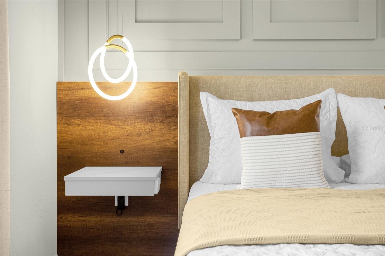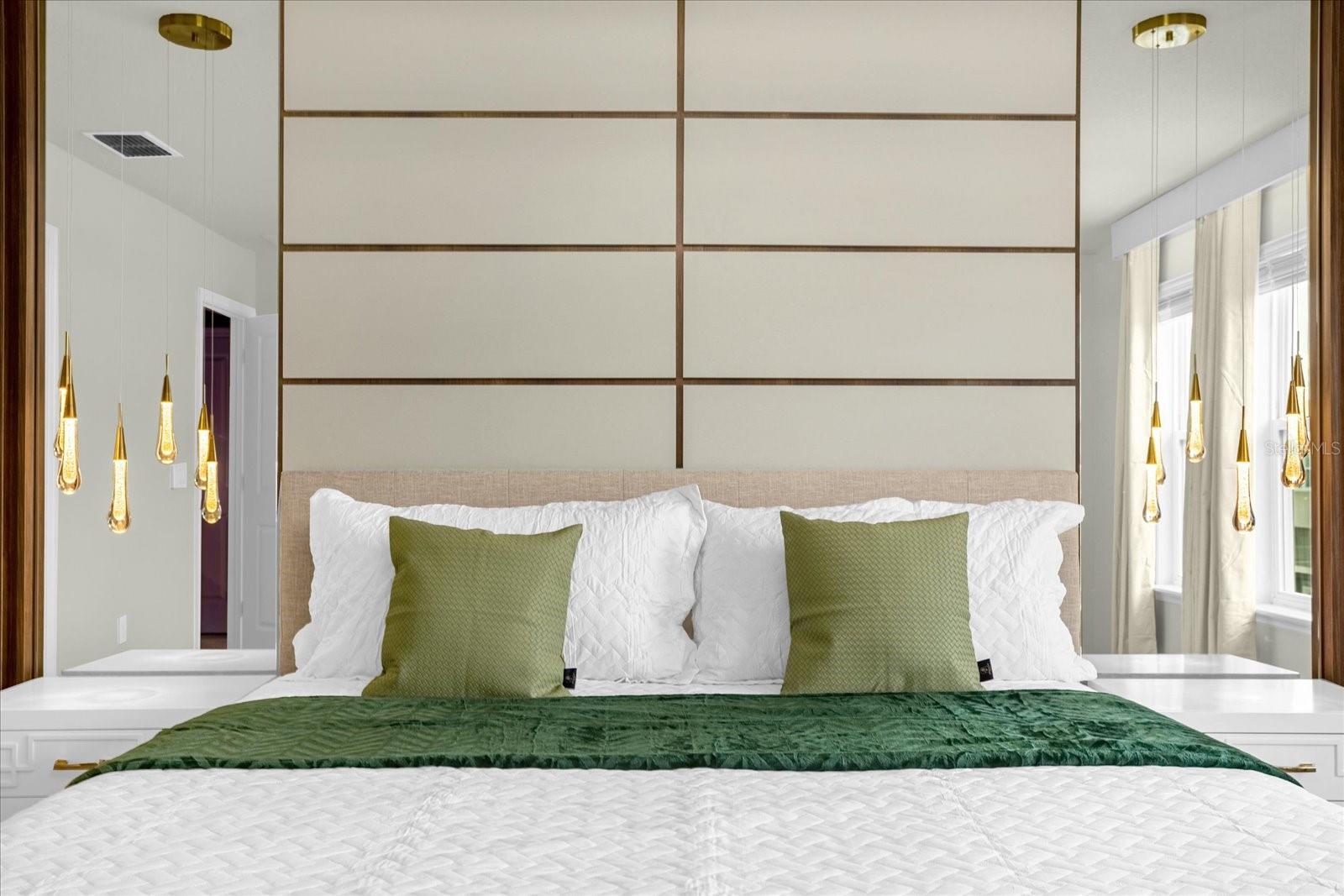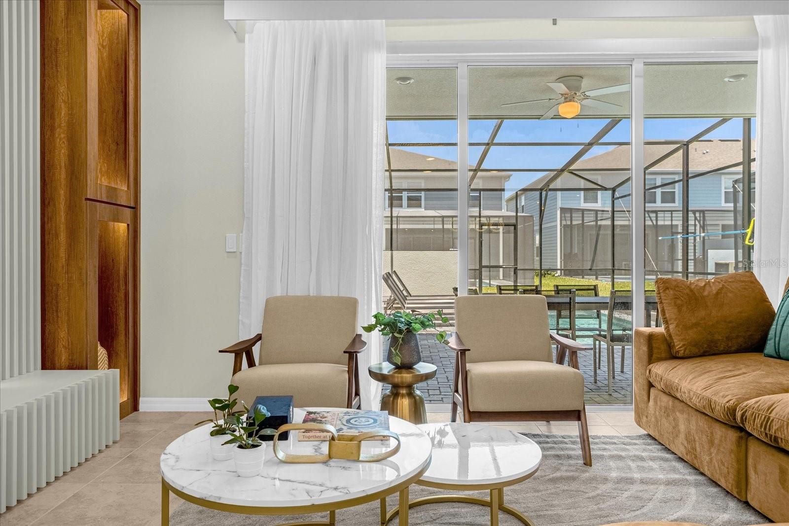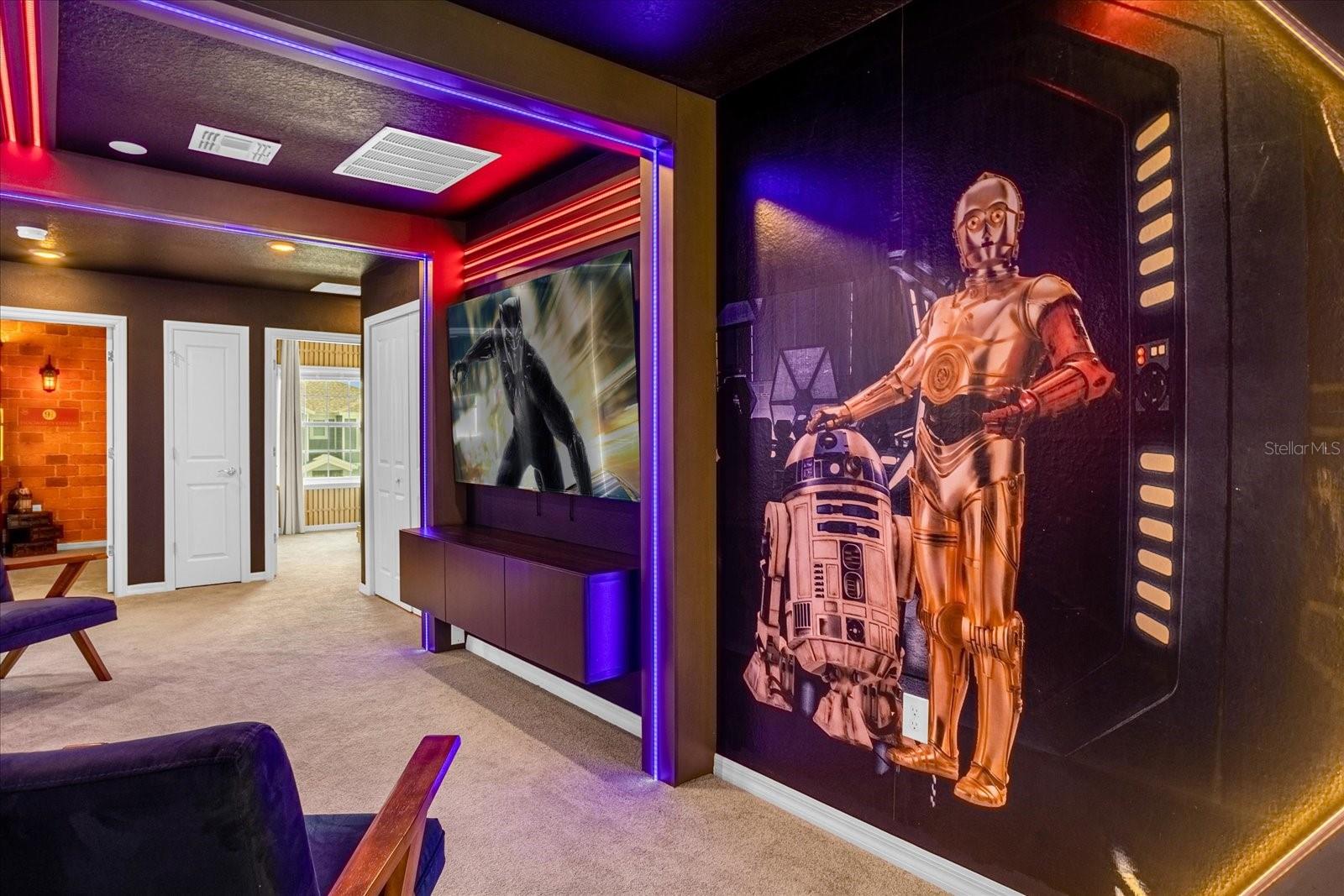 Welcome to this exquisite end-unit townhome in the prestigious Windsor Island Resort, Davenport's ultimate vacation destination! This 2023-built gem offers 5 bedrooms and 4.5 bathrooms across 2,293 sq ft of under AC space, on a premium corner lot, providing enhanced privacy, natural light, and serene views. Fully furnished and turnkey-ready for short-term rentals with no lease restrictions, it's an investor's dream blending luxury, fun, and high revenue potential. Enter an open-concept layout with elegant ceramic tile flooring in main areas and plush carpeting in bedrooms, showcasing fantastic professional interior design. The gourmet kitchen features white shaker cabinets, granite countertops, stainless steel appliances (including Whirlpool refrigerator, dishwasher, range, microwave), a large island with pendant circle lights seating 4, and potted plants for a fresh touch—perfect for family gatherings. Adjacent, the dining area boasts a sleek white pedestal table with 8 gray upholstered chairs under a crystal chandelier, reflecting modern sophistication. Relax in themed bedrooms that delight: a Mickey Mouse surf-themed kids' room with thatched ceiling, illuminated surfboard mural, VW van bunk beds (twin over full), white dresser, and beachy vibes; a Harry Potter-inspired retreat with plaid wallpaper, wooden bunk beds (twin over full), vintage posters, lantern lighting, and trunk decor; plus luxurious master suites—one with king bed, wooden headboard wall, neon circle sconce, floating white nightstand, beige throw, and leather accents; another in green tones with velvet throw, modern pendant drops, mirrored headboard, and bench. All include smart TVs, ample storage like white dressers or built-ins, and en-suite baths. The loft/game room transforms into a Star Wars galaxy with neon LED accents, murals of BB-8 and C-3PO, purple lighting, sectional sofa, armchairs, and TV for immersive entertainment. Outdoors, your screened lanai encloses a private heated pool and spa with child safety fence, paver deck, lounge chairs, dining set for 6, and grill—ideal for al fresco evenings overlooking green space. Enjoy Windsor Island's resort-style amenities: 24/7 gated security, 6,500 sq ft clubhouse with arcade, fitness center, sundry shop; zero-entry pool with lazy river, dual waterslides, splash pad, hot tub, cabanas, hammocks; tiki bar/restaurant, mini golf, basketball/volleyball courts, soccer field, corn hole, tennis, firepit, and event lawn—all enhancing guest appeal. Just 9 miles from Disney World, minutes from Universal, SeaWorld, outlets, and dining, this west-facing haven offers convenience and tranquility. Whether for personal use or lucrative rentals, seize this standout opportunity—schedule your showing today!