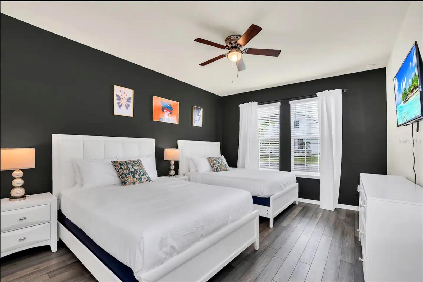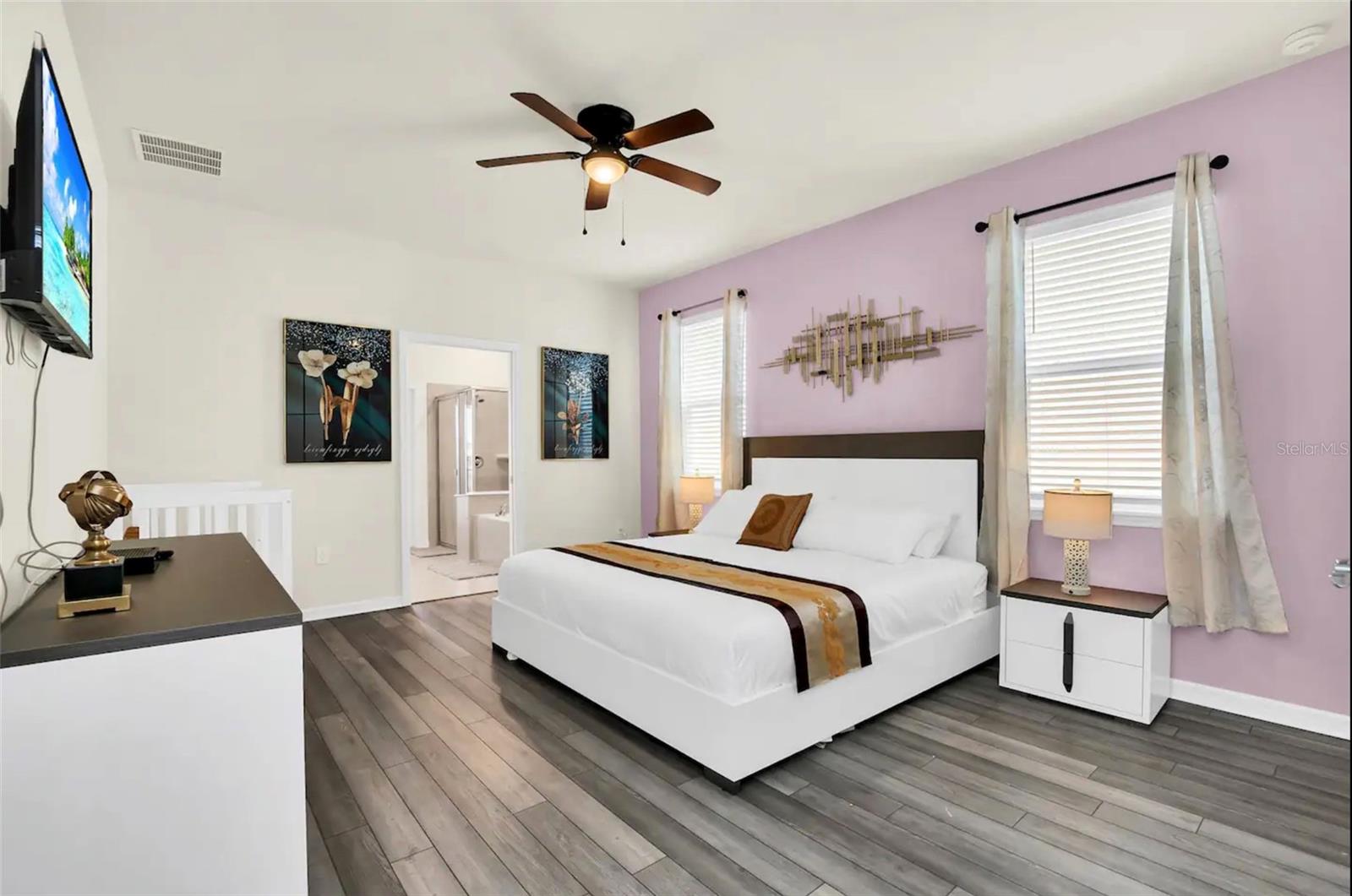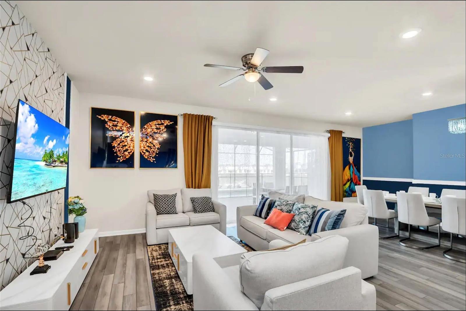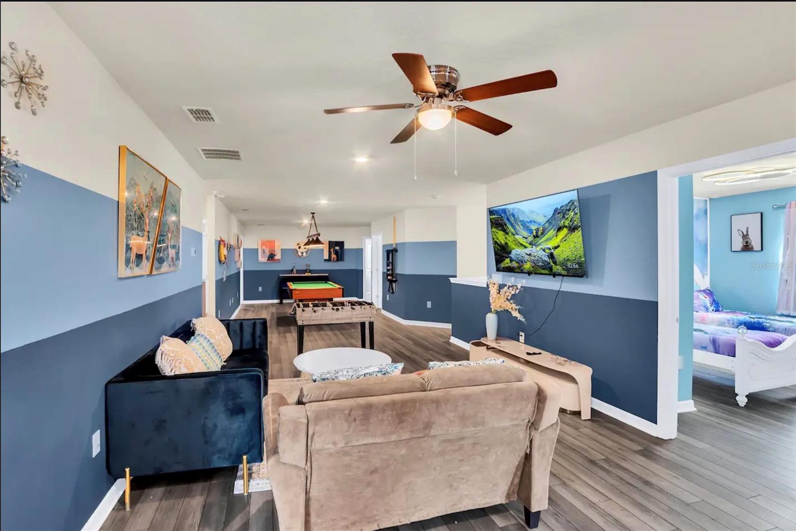 The Windsor Island Resort, a new and thrilling vacation home development, is ideally located near central Florida's major attractions, including Disney and Universal. This elegantly furnished home, sold complete with furniture, boasts 10 bedrooms and 8 bathrooms. It features a private, screened-in pool with a spa. Windsor Island's amenities rank among central Florida's finest, offering a zero-entry resort pool, a lazy river, water slides, a splash pad, a fitness center, a game room, mini-golf, a hammock garden, a sand volleyball court, a basketball court, private cabanas, a poolside bar, an ice-cream/snack bar, and a 24-hour guarded gate for enhanced security. The absence of neighbors behind the property provides additional privacy for residents.