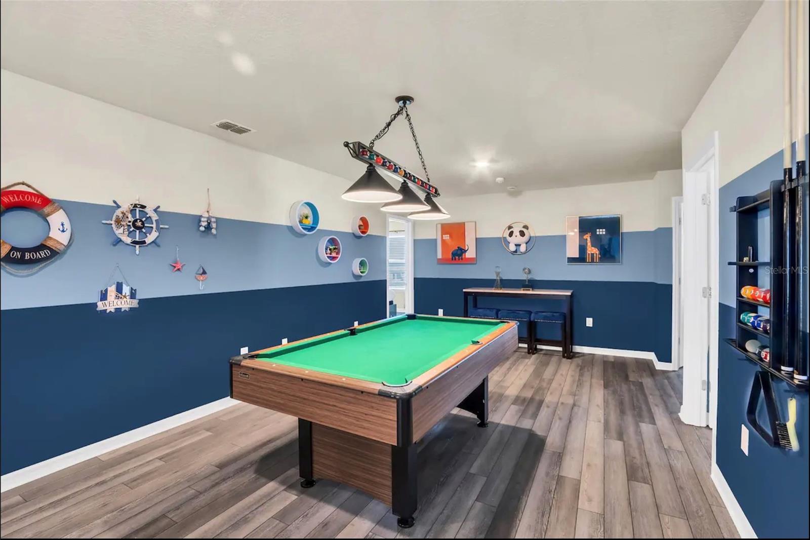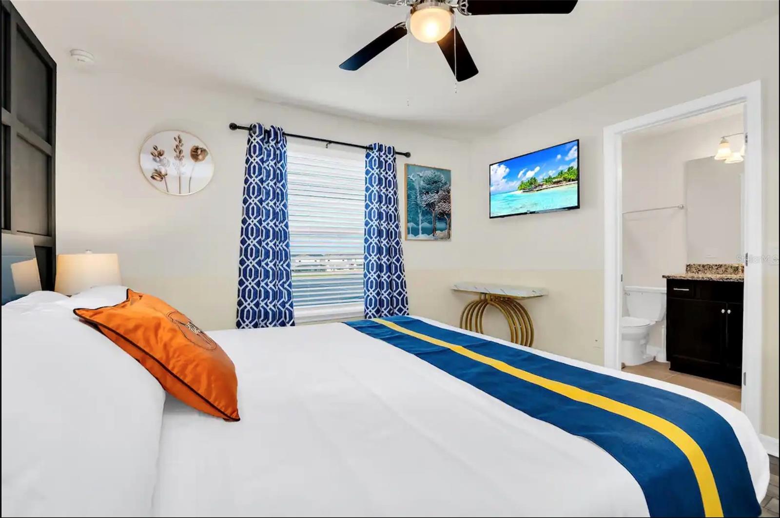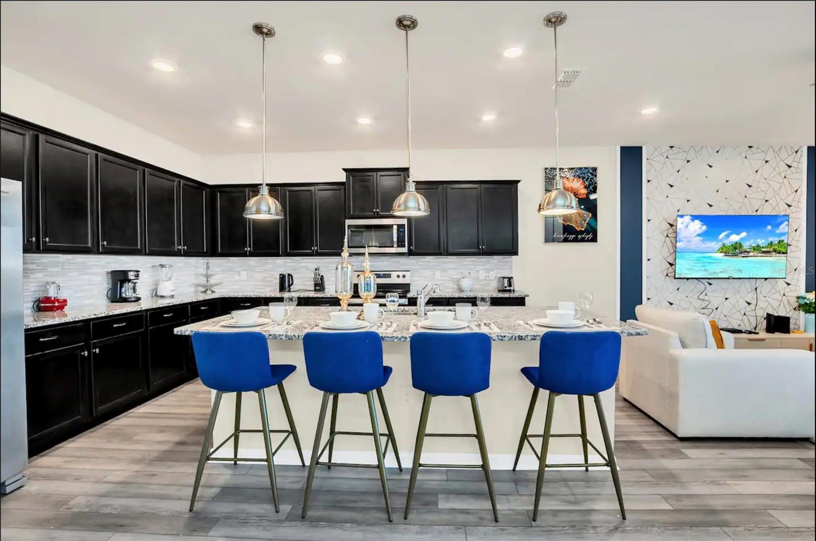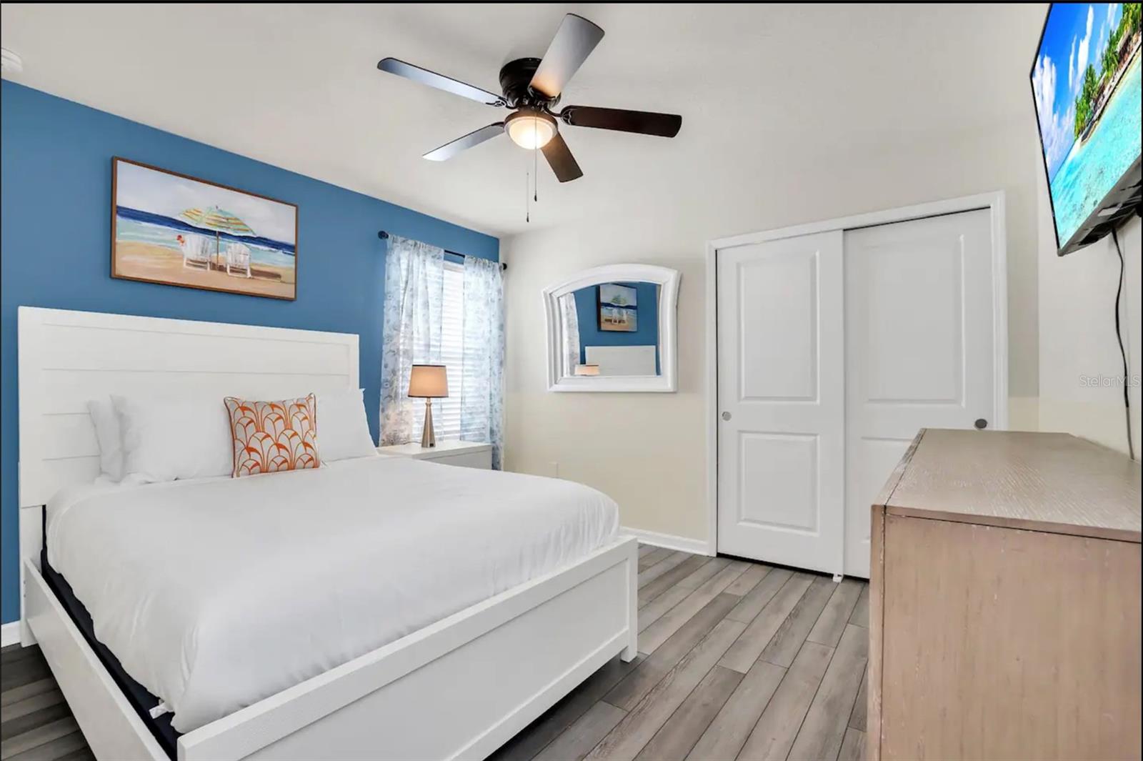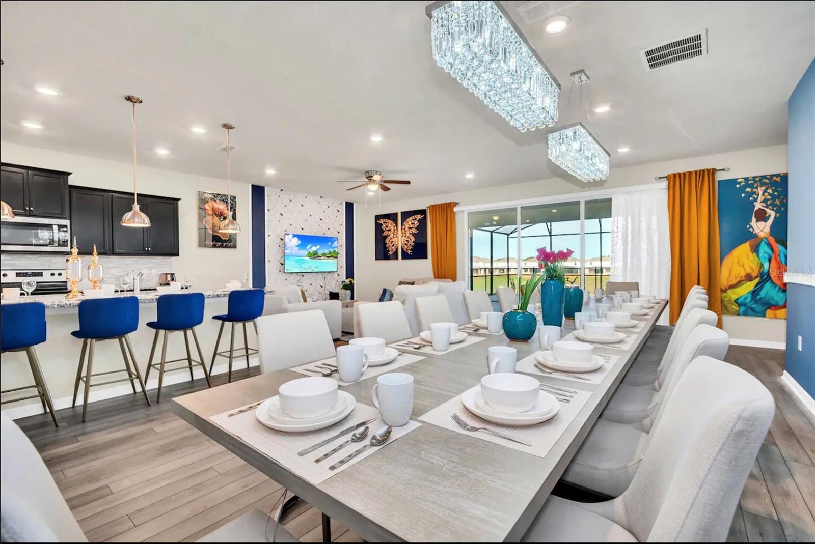 The Windsor Island Resort, a new and thrilling vacation home development, is ideally located near central Florida's major attractions, including Disney and Universal. This elegantly furnished home, sold complete with furniture, boasts 10 bedrooms and 8 bathrooms. It features a private, screened-in pool with a spa. Windsor Island's amenities rank among central Florida's finest, offering a zero-entry resort pool, a lazy river, water slides, a splash pad, a fitness center, a game room, mini-golf, a hammock garden, a sand volleyball court, a basketball court, private cabanas, a poolside bar, an ice-cream/snack bar, and a 24-hour guarded gate for enhanced security. The absence of neighbors behind the property provides additional privacy for residents.