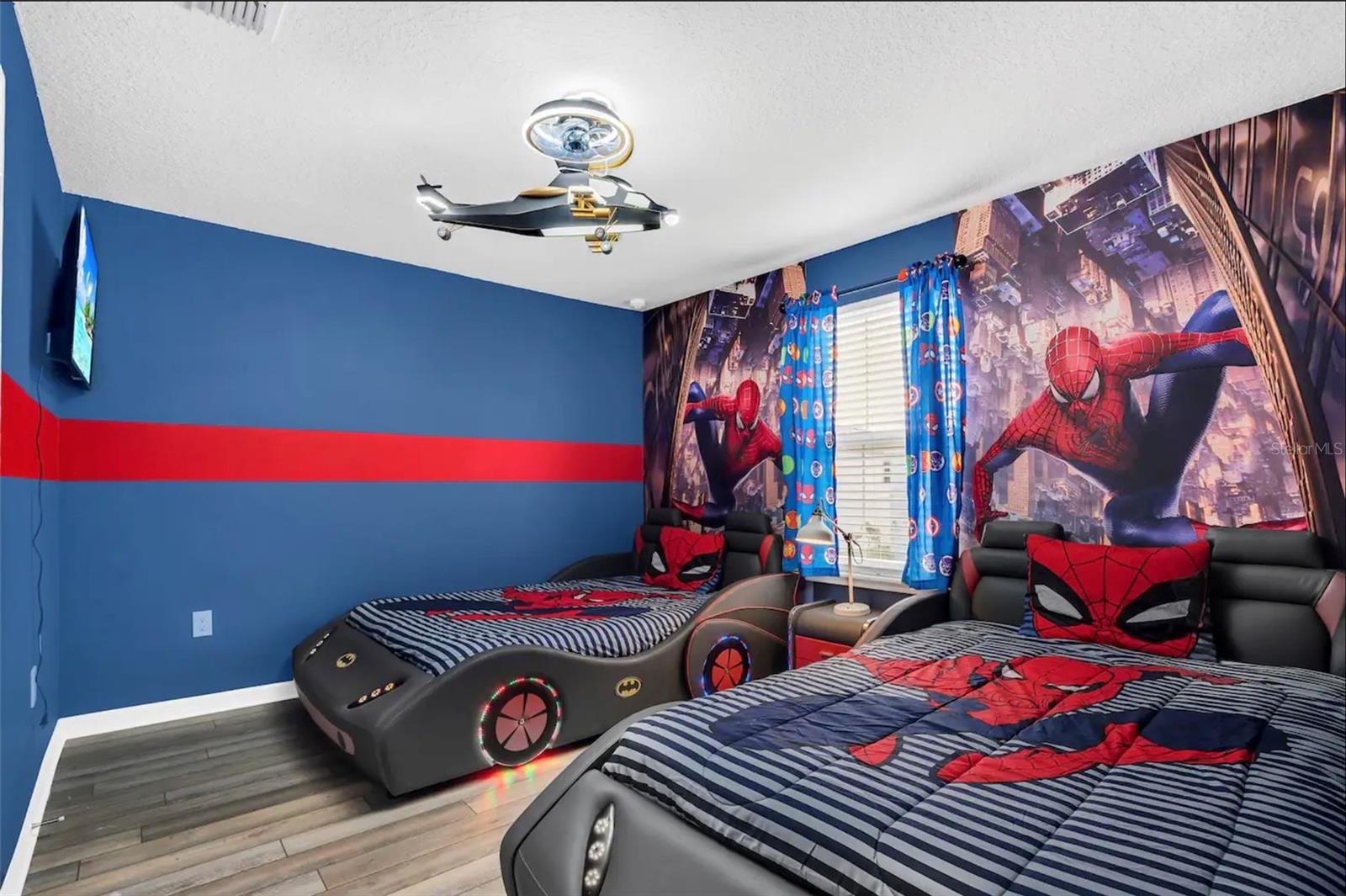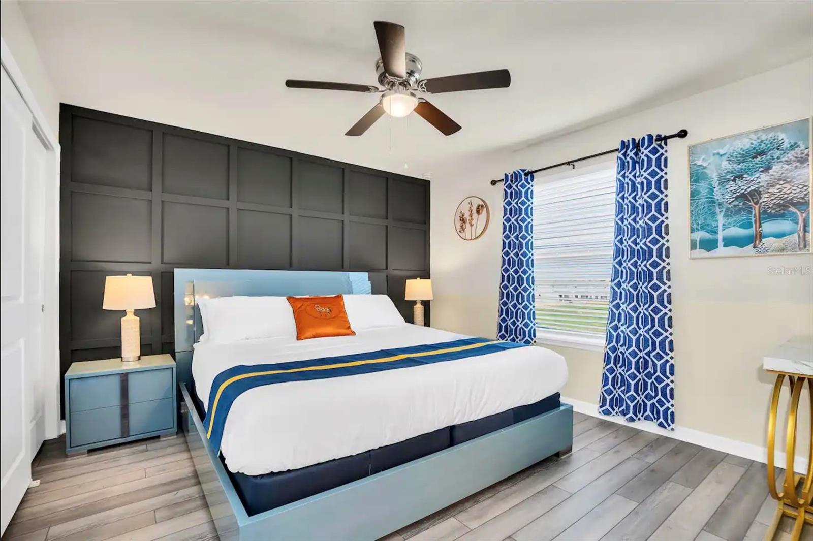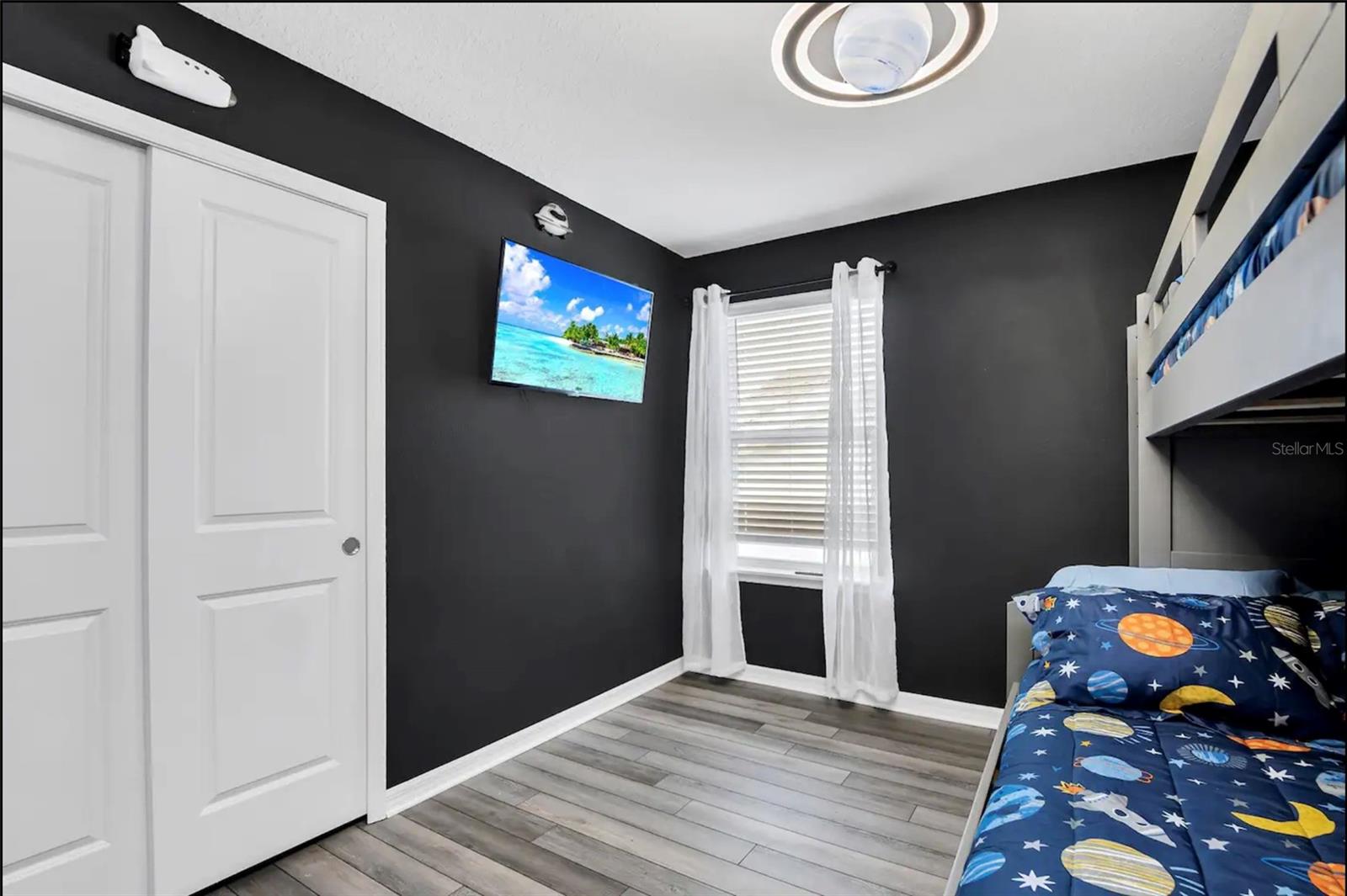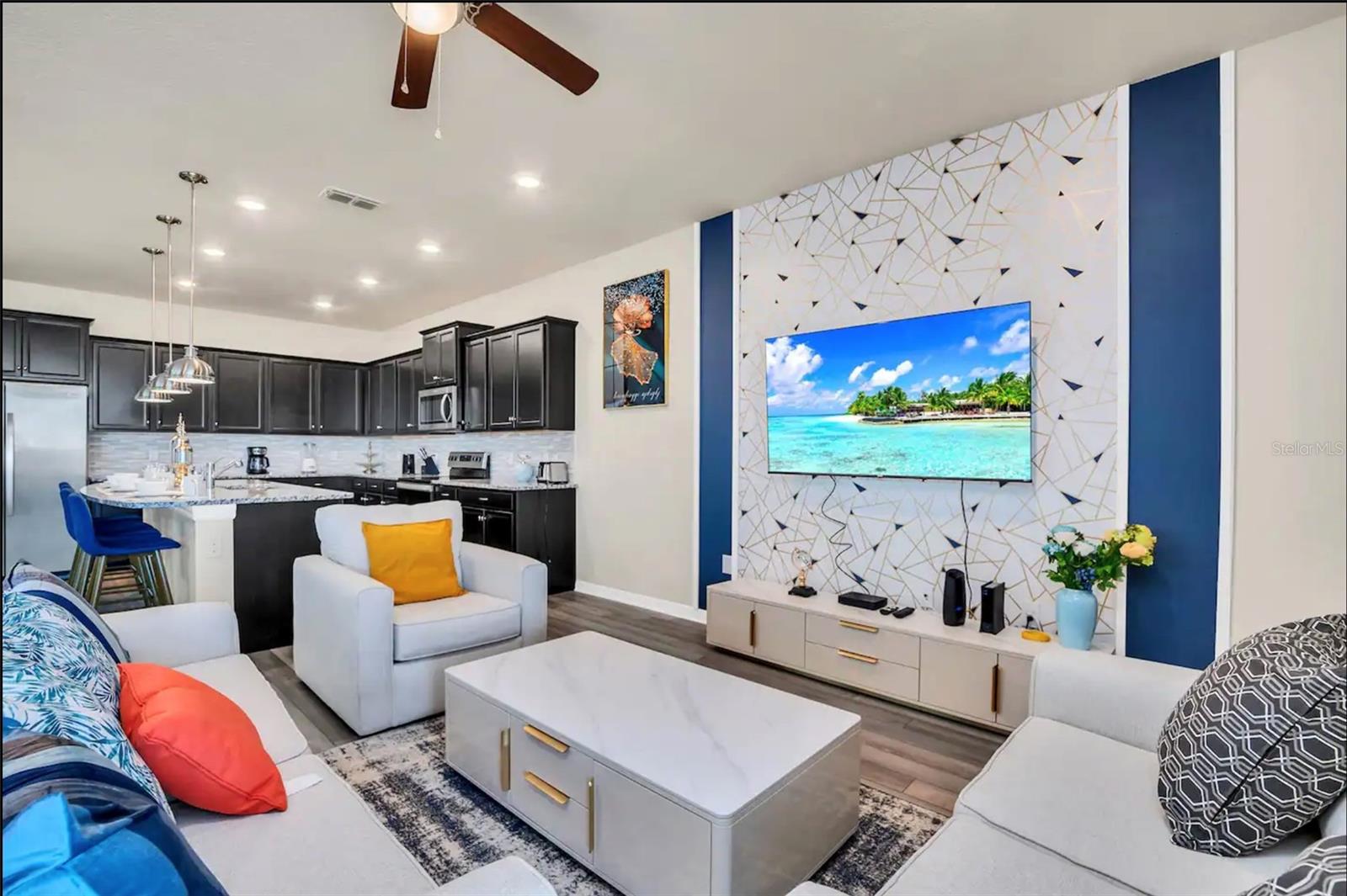 The Windsor Island Resort, a new and thrilling vacation home development, is ideally located near central Florida's major attractions, including Disney and Universal. This elegantly furnished home, sold complete with furniture, boasts 10 bedrooms and 8 bathrooms. It features a private, screened-in pool with a spa. Windsor Island's amenities rank among central Florida's finest, offering a zero-entry resort pool, a lazy river, water slides, a splash pad, a fitness center, a game room, mini-golf, a hammock garden, a sand volleyball court, a basketball court, private cabanas, a poolside bar, an ice-cream/snack bar, and a 24-hour guarded gate for enhanced security. The absence of neighbors behind the property provides additional privacy for residents.