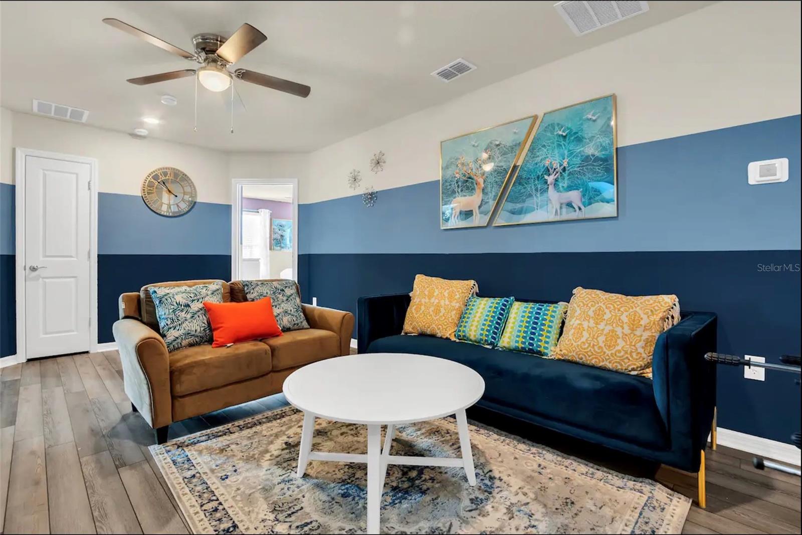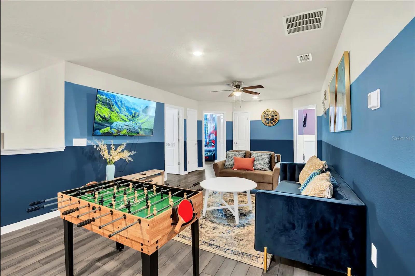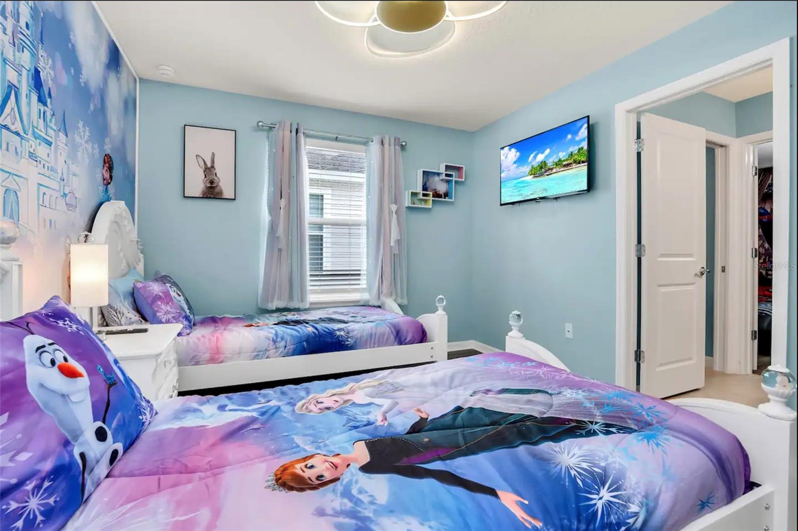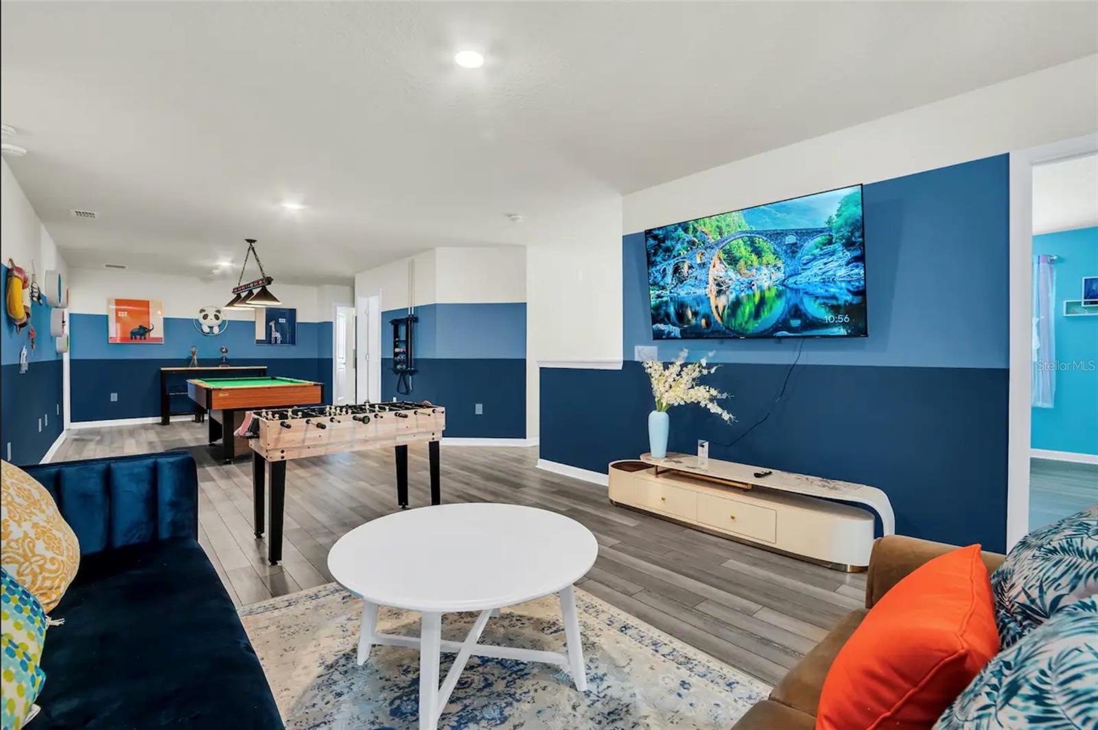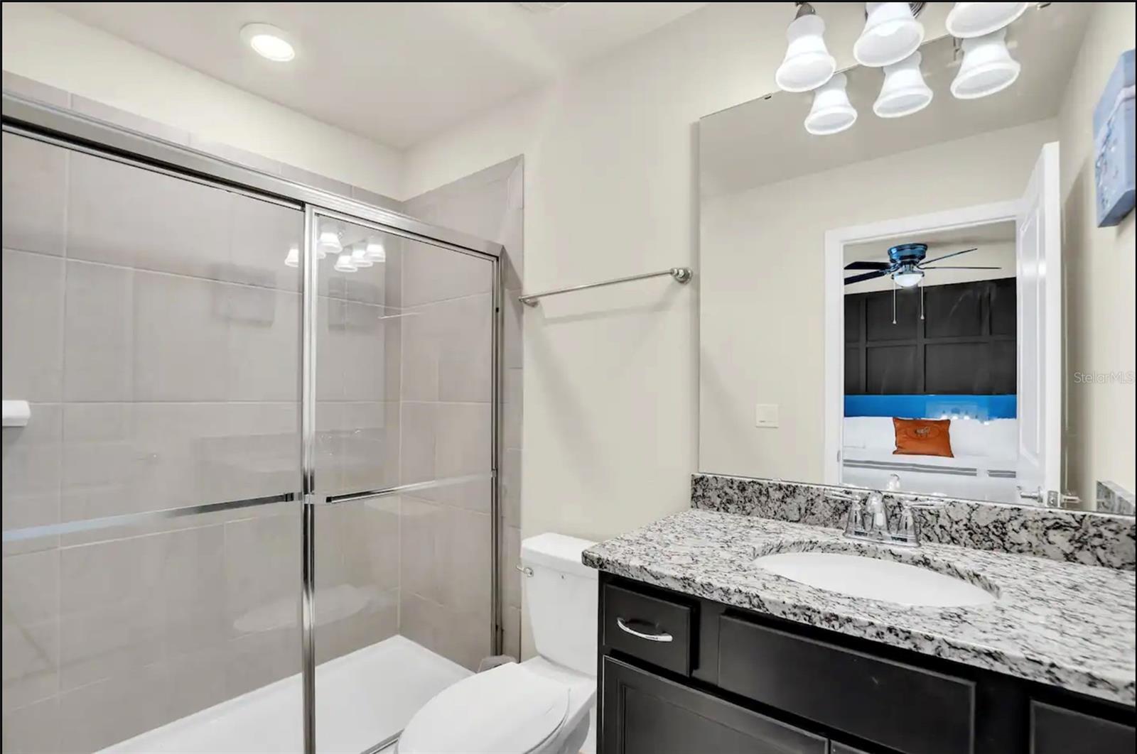 The Windsor Island Resort, a new and thrilling vacation home development, is ideally located near central Florida's major attractions, including Disney and Universal. This elegantly furnished home, sold complete with furniture, boasts 10 bedrooms and 8 bathrooms. It features a private, screened-in pool with a spa. Windsor Island's amenities rank among central Florida's finest, offering a zero-entry resort pool, a lazy river, water slides, a splash pad, a fitness center, a game room, mini-golf, a hammock garden, a sand volleyball court, a basketball court, private cabanas, a poolside bar, an ice-cream/snack bar, and a 24-hour guarded gate for enhanced security. The absence of neighbors behind the property provides additional privacy for residents.