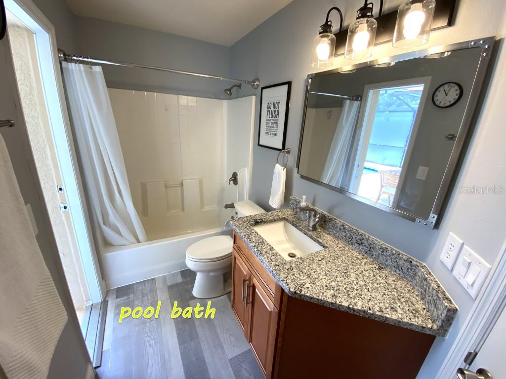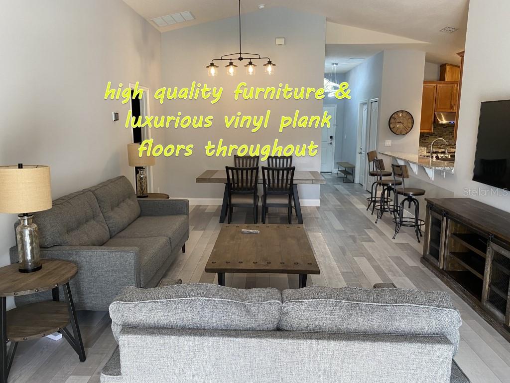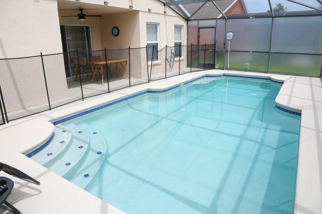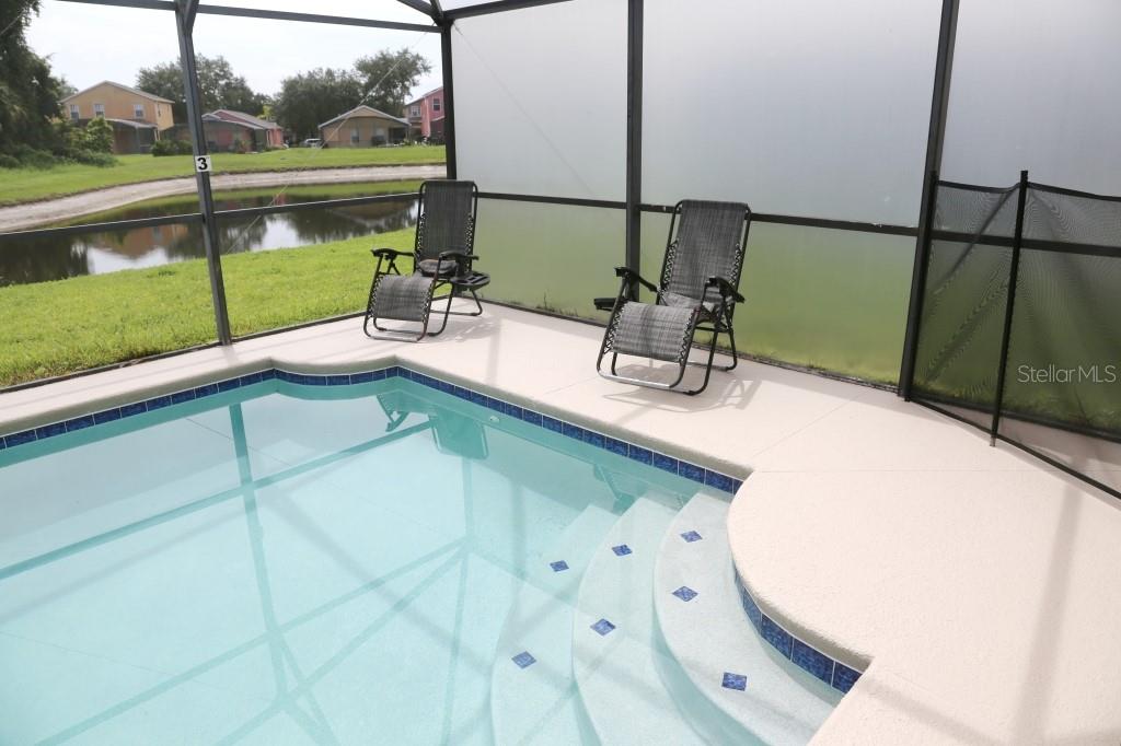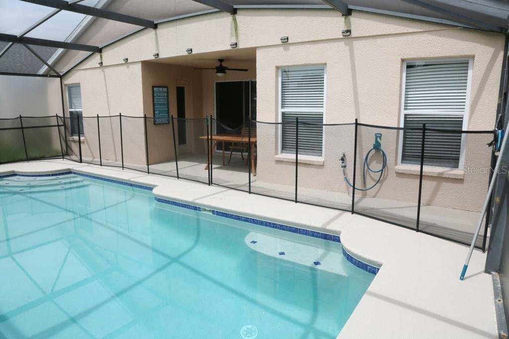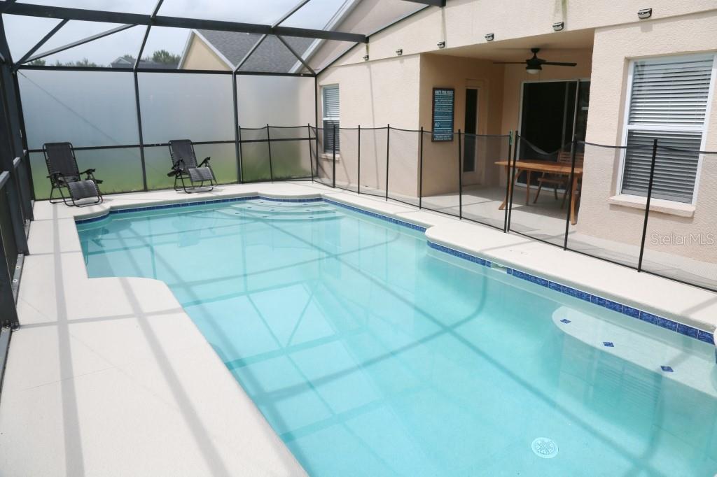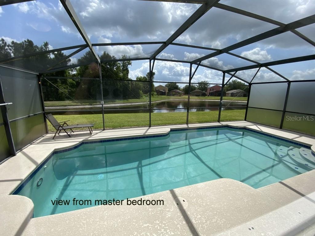 Stunning 5 bed/3 bath POOL house with game room, a truly luxurious interior and a fantastic location just 13 miles from Disney. Property sold as FULLY FURNISHED for a smooth transition to continue operating as a successful vacation rental, or just move in directly as your next full time home! This is a ONE STOREY detached single family house, with NO STEPS to climb. Property has NO REAR NEIGHBORS, backing up to a small pond, very peaceful and quiet. Some highlights: - Entire solar system is fully paid off, easily a $15k value! - Roof less than 5 years old - Pool heater around 3 years old - AC around 5~6 years old - entire pool deck just painted, looking brand new Impressive new vinyl plank floors throughout. Beautiful GRANITE countertops in kitchen and all bathrooms. Kitchen also features 42 inch soft close cabinets, Samsung stainless steel appliances, vent hood, and premium backsplash. Open concept kitchen so you can still interact with everyone in the dining area and living room while cooking. Master bedroom has a King size bed, double sink bathroom, a very large walk in closet with another lockout closet for extra storage, an office desk, and a wall mounted Samsung smart TV. 2nd Master has a Queen size bed, and it also provides an office desk, and a wall mounted Samsung smart TV. All toilets in the house are Kohler soft close toilet seats. Garage can be used as a game room with a foosball table provided. It also has a spacious closet that can store lots of tools and materials.