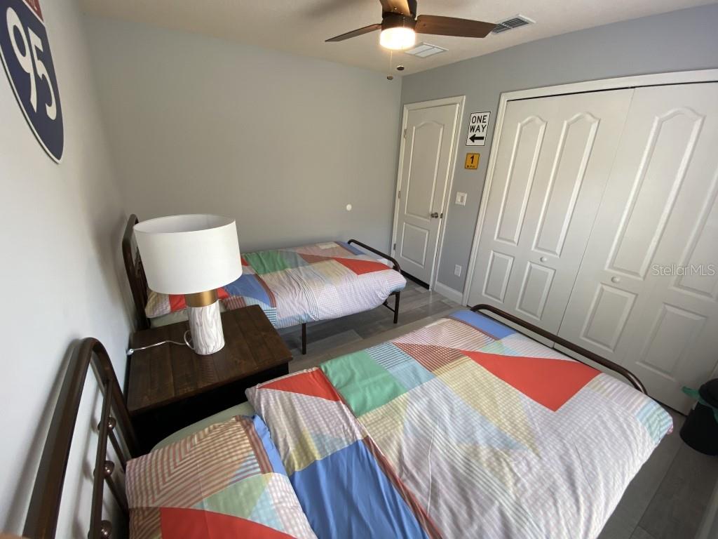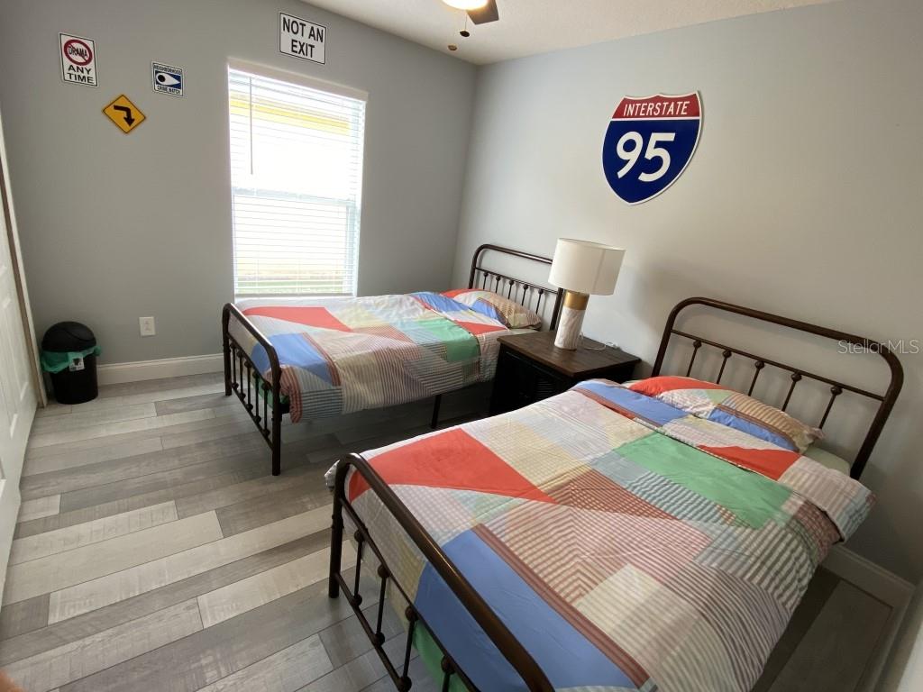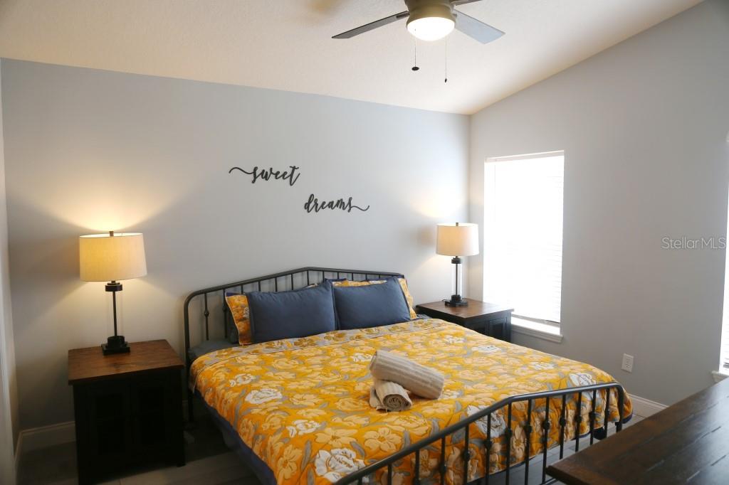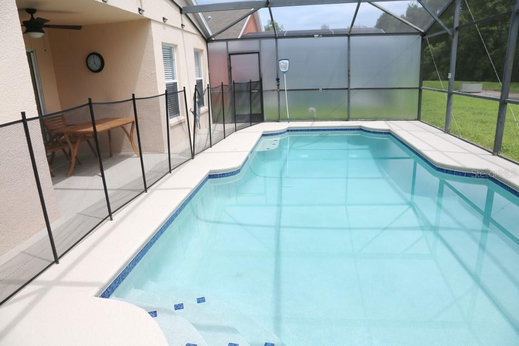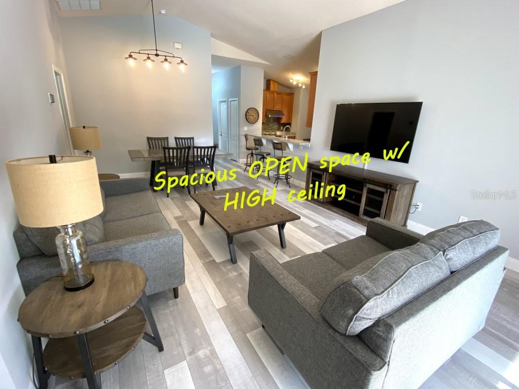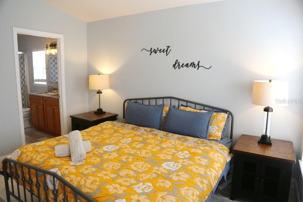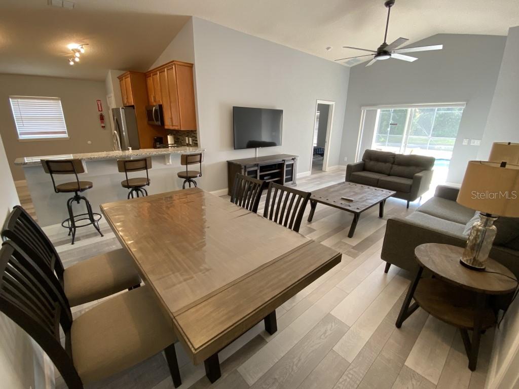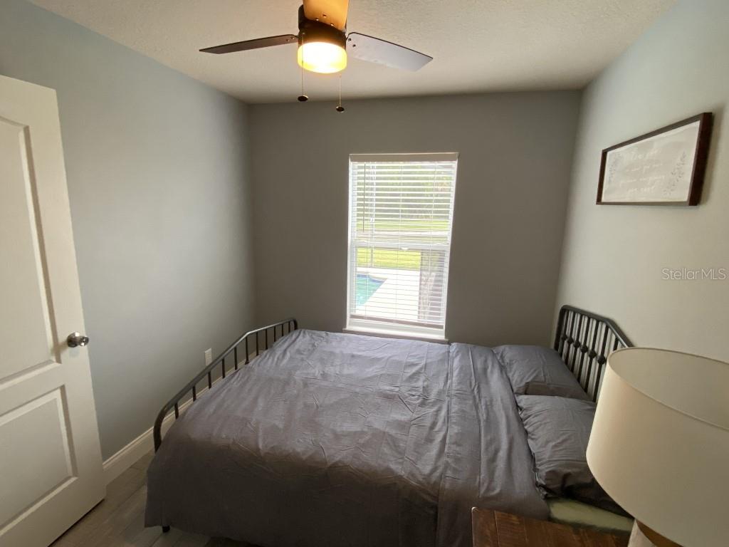 Stunning 5 bed/3 bath POOL house with game room, a truly luxurious interior and a fantastic location just 13 miles from Disney. Property sold as FULLY FURNISHED for a smooth transition to continue operating as a successful vacation rental, or just move in directly as your next full time home! This is a ONE STOREY detached single family house, with NO STEPS to climb. Property has NO REAR NEIGHBORS, backing up to a small pond, very peaceful and quiet. Some highlights: - Entire solar system is fully paid off, easily a $15k value! - Roof less than 5 years old - Pool heater around 3 years old - AC around 5~6 years old - entire pool deck just painted, looking brand new Impressive new vinyl plank floors throughout. Beautiful GRANITE countertops in kitchen and all bathrooms. Kitchen also features 42 inch soft close cabinets, Samsung stainless steel appliances, vent hood, and premium backsplash. Open concept kitchen so you can still interact with everyone in the dining area and living room while cooking. Master bedroom has a King size bed, double sink bathroom, a very large walk in closet with another lockout closet for extra storage, an office desk, and a wall mounted Samsung smart TV. 2nd Master has a Queen size bed, and it also provides an office desk, and a wall mounted Samsung smart TV. All toilets in the house are Kohler soft close toilet seats. Garage can be used as a game room with a foosball table provided. It also has a spacious closet that can store lots of tools and materials.