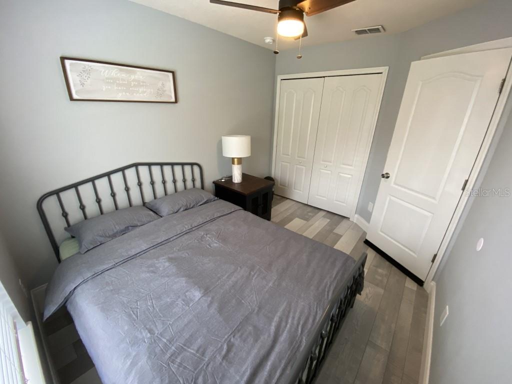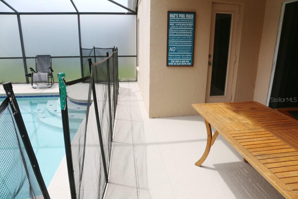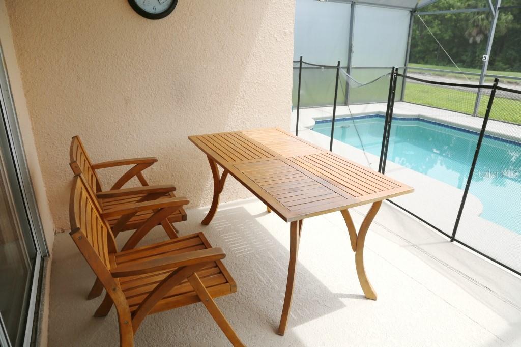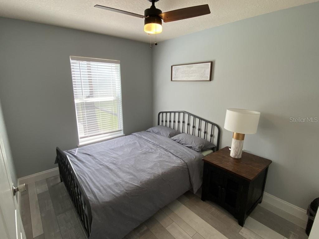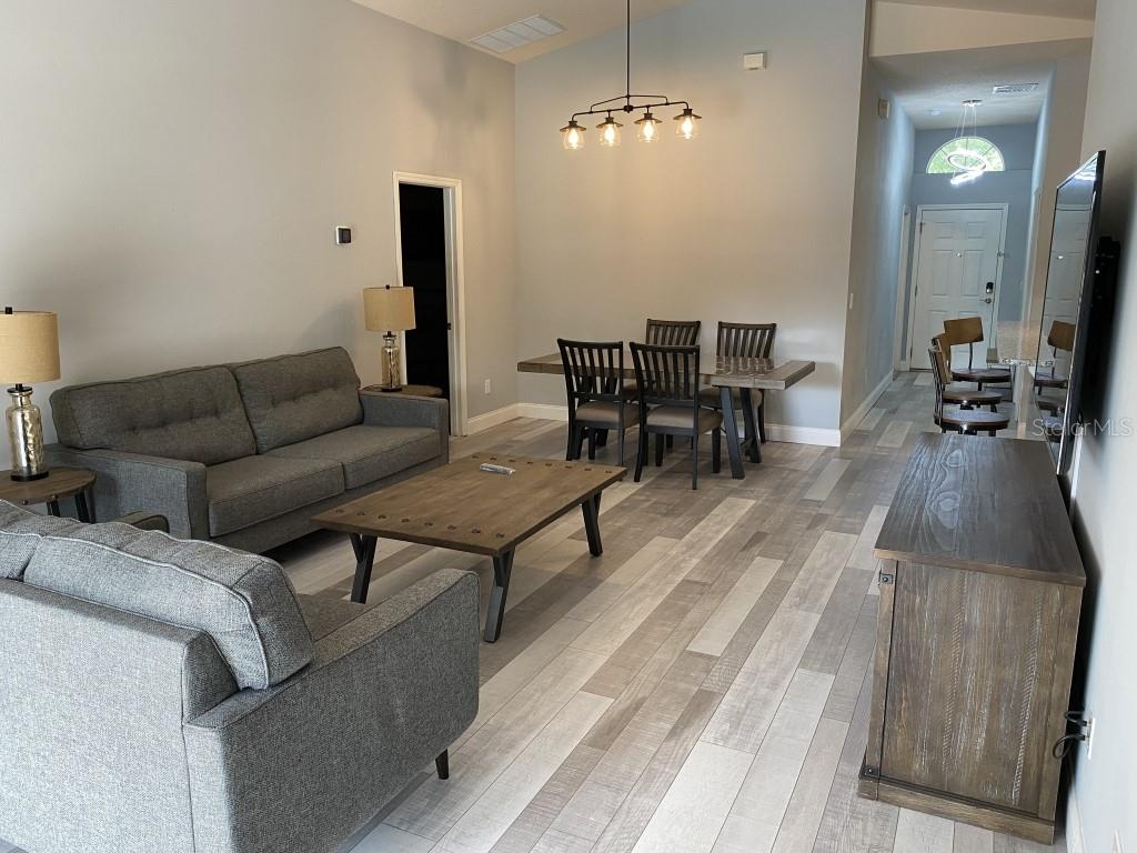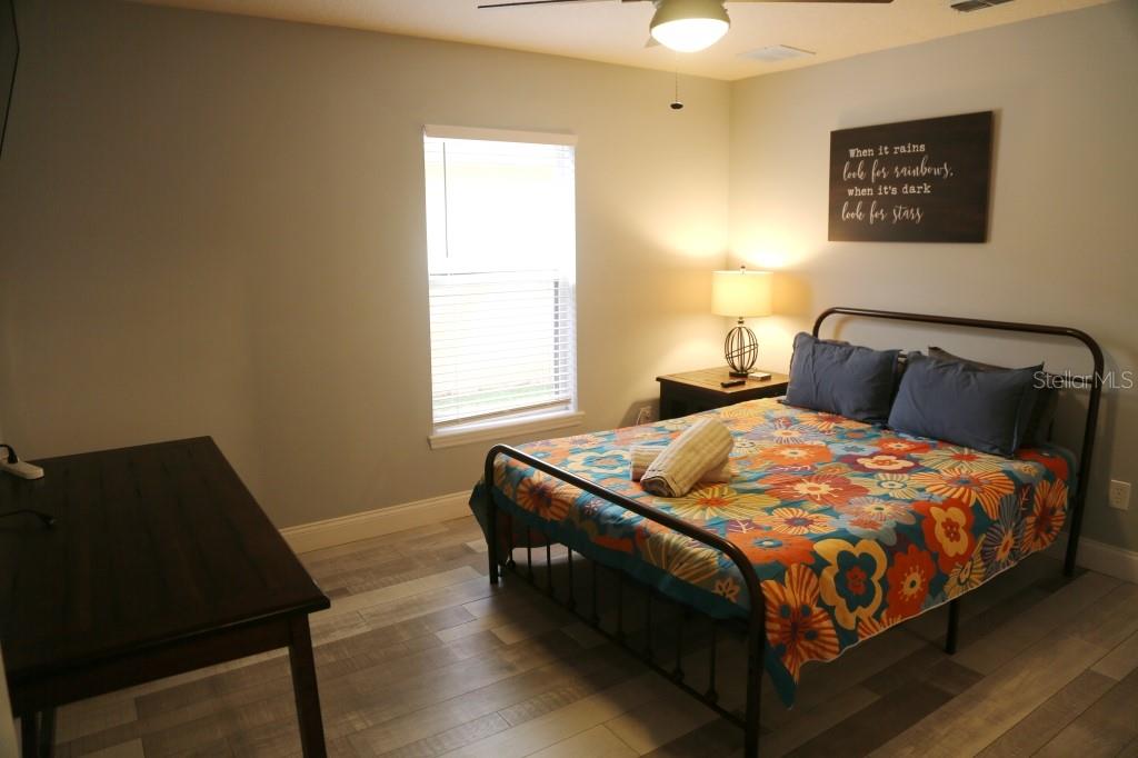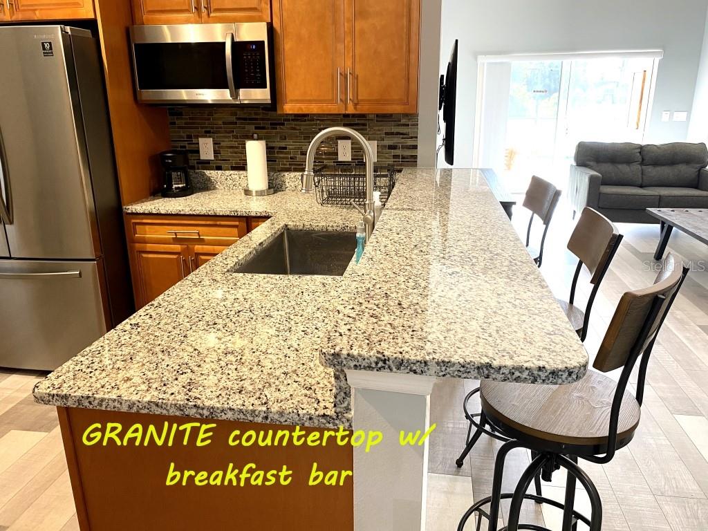 Stunning 5 bed/3 bath POOL house with game room, a truly luxurious interior and a fantastic location just 13 miles from Disney. Property sold as FULLY FURNISHED for a smooth transition to continue operating as a successful vacation rental, or just move in directly as your next full time home! This is a ONE STOREY detached single family house, with NO STEPS to climb. Property has NO REAR NEIGHBORS, backing up to a small pond, very peaceful and quiet. Some highlights: - Entire solar system is fully paid off, easily a $15k value! - Roof less than 5 years old - Pool heater around 3 years old - AC around 5~6 years old - entire pool deck just painted, looking brand new Impressive new vinyl plank floors throughout. Beautiful GRANITE countertops in kitchen and all bathrooms. Kitchen also features 42 inch soft close cabinets, Samsung stainless steel appliances, vent hood, and premium backsplash. Open concept kitchen so you can still interact with everyone in the dining area and living room while cooking. Master bedroom has a King size bed, double sink bathroom, a very large walk in closet with another lockout closet for extra storage, an office desk, and a wall mounted Samsung smart TV. 2nd Master has a Queen size bed, and it also provides an office desk, and a wall mounted Samsung smart TV. All toilets in the house are Kohler soft close toilet seats. Garage can be used as a game room with a foosball table provided. It also has a spacious closet that can store lots of tools and materials.