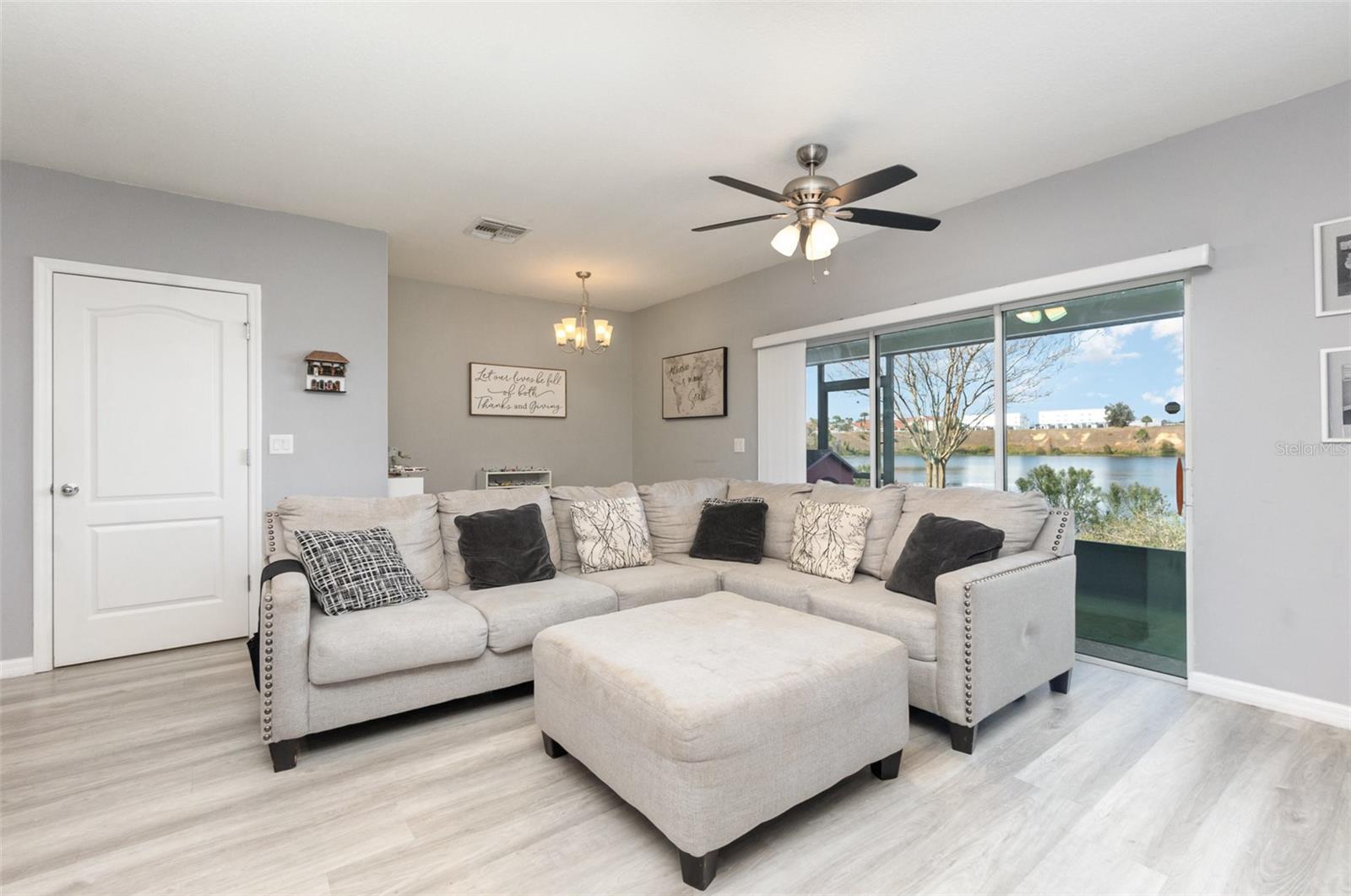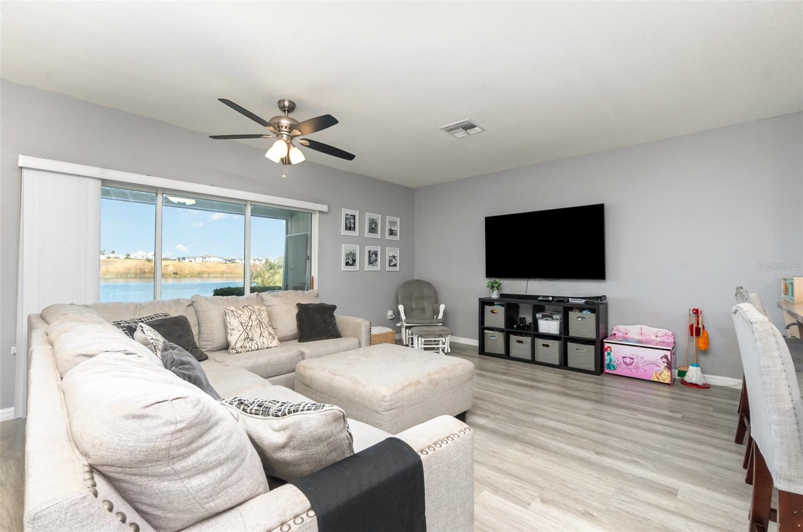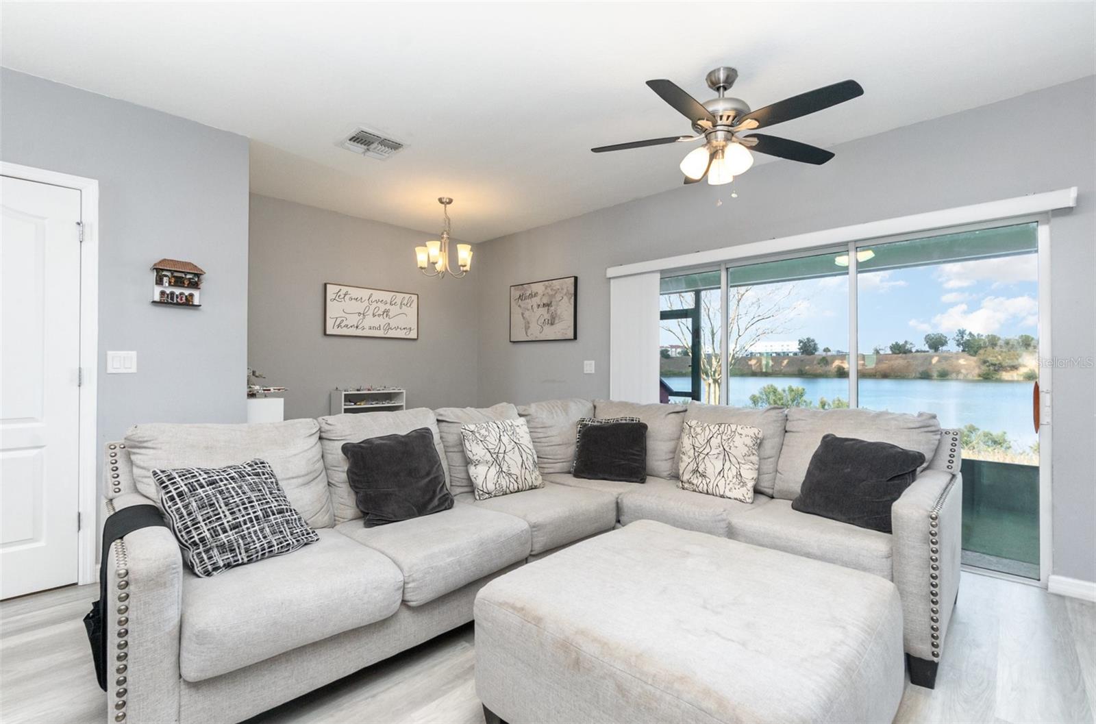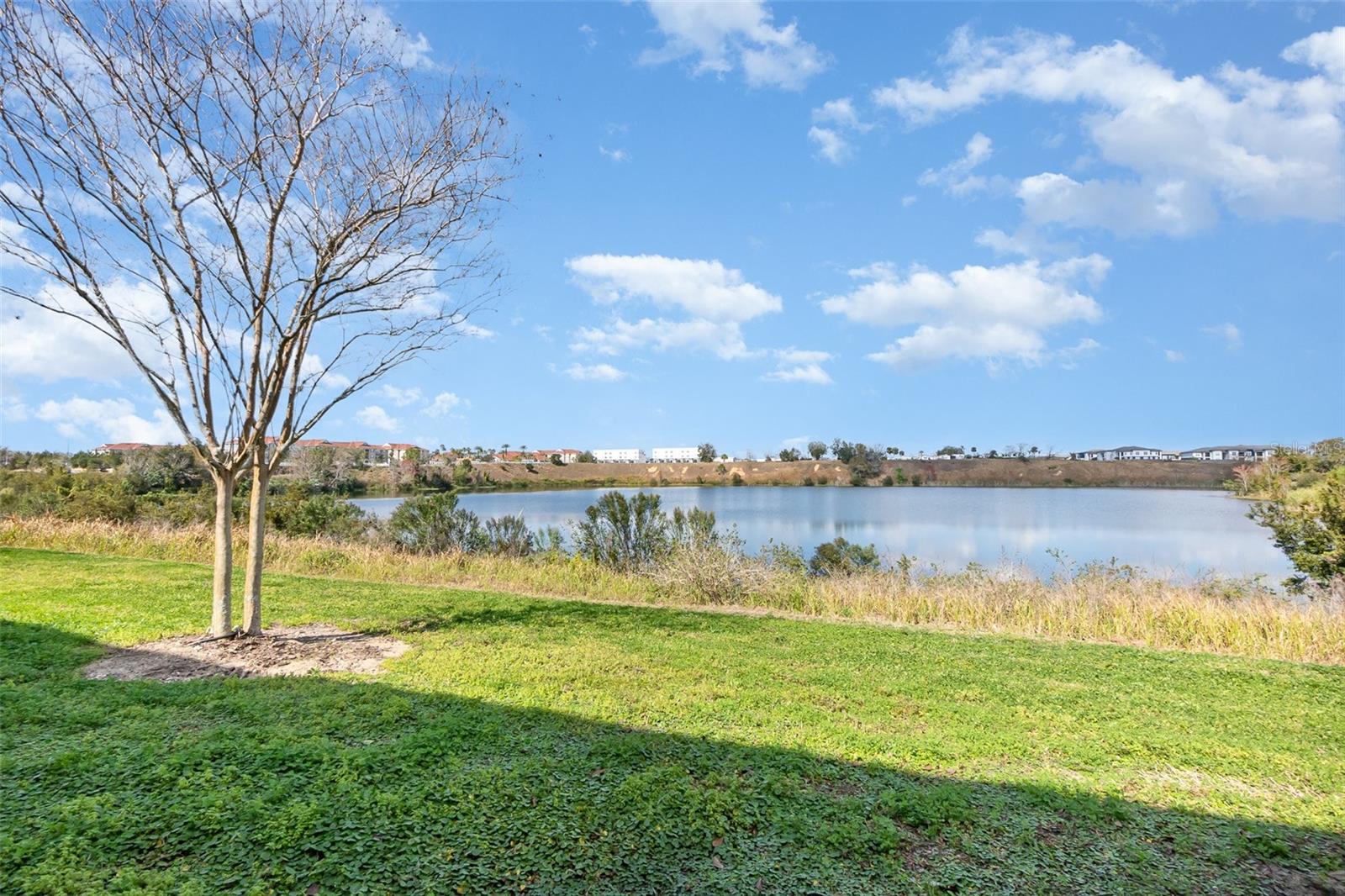 Just minutes from shopping, restaurants, and Disney Lake. Nestled right in front of the lake offering amazing views from the open concept family room and kitchen and even can open the sliding doors to the covered and screened-in lanai (8'x22'!) and soak in the sunsets. This gated townhome community offers a resort style community pool and is fully maintained. This 2 story fully concrete block townhome was just built in 2018, and the original homeowner have meticulously maintained everything and had new luxury vinyl flooring installed in 2022, and have UV filter upgrades on AC system. Fixtures updated and even the glass/or screen combo door added to front door. and new garage door opener, and plywood added to attic space for more storage!