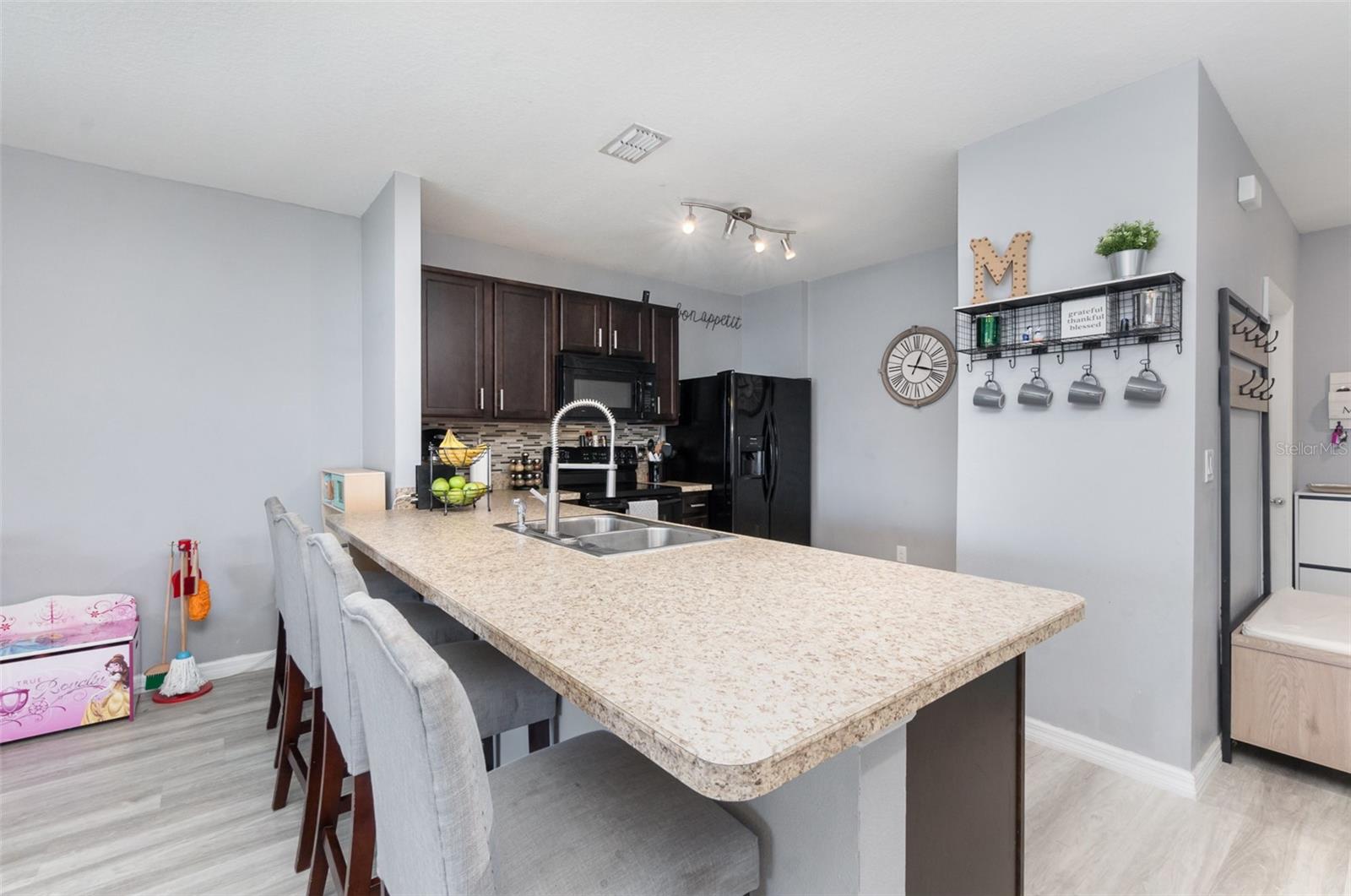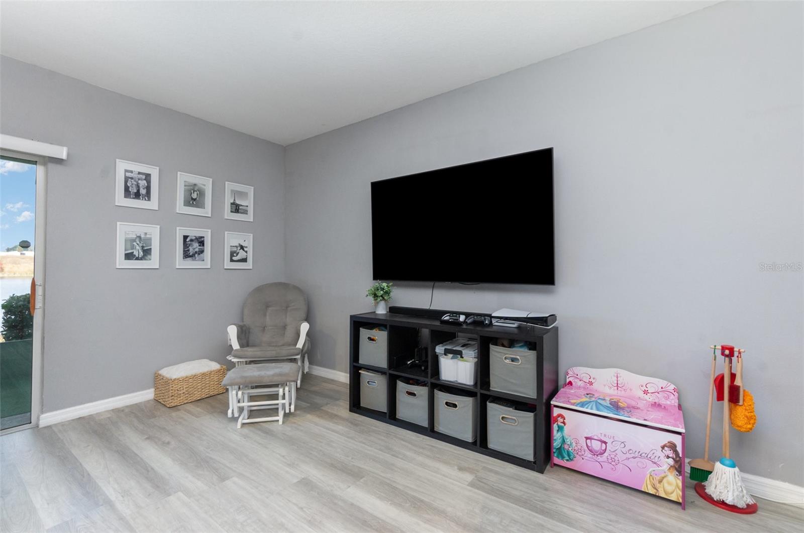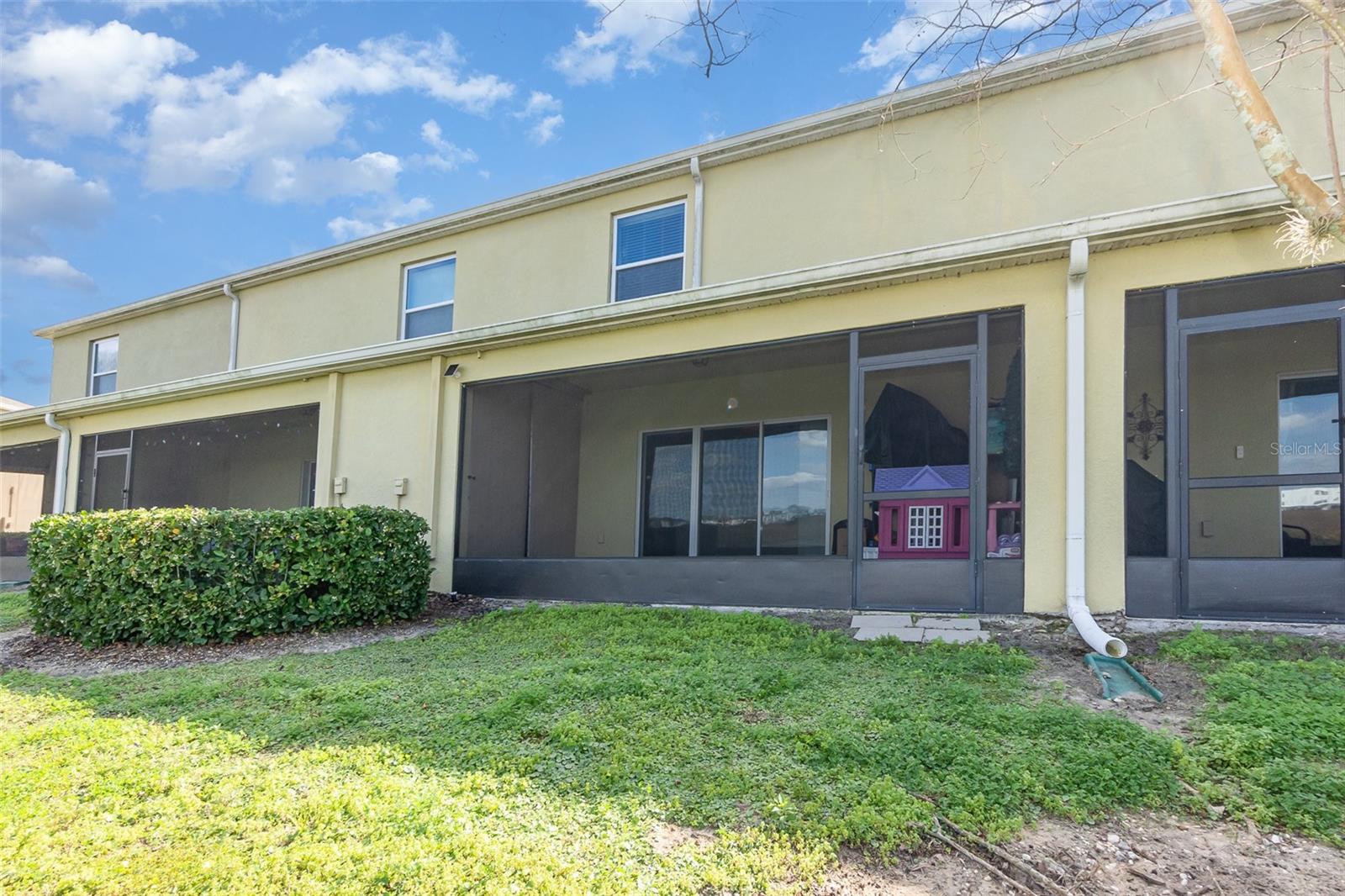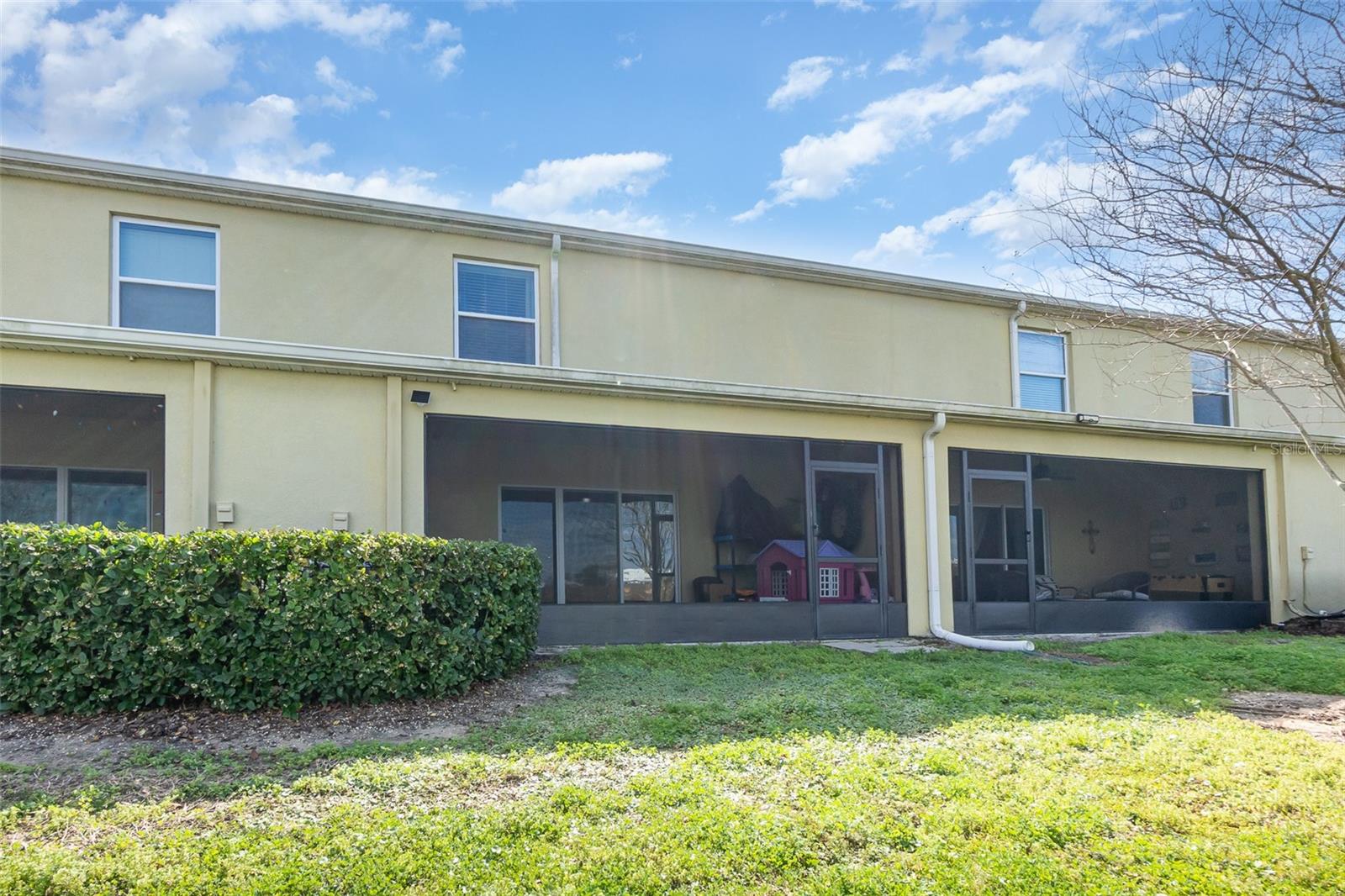 Just minutes from shopping, restaurants, and Disney Lake. Nestled right in front of the lake offering amazing views from the open concept family room and kitchen and even can open the sliding doors to the covered and screened-in lanai (8'x22'!) and soak in the sunsets. This gated townhome community offers a resort style community pool and is fully maintained. This 2 story fully concrete block townhome was just built in 2018, and the original homeowner have meticulously maintained everything and had new luxury vinyl flooring installed in 2022, and have UV filter upgrades on AC system. Fixtures updated and even the glass/or screen combo door added to front door. and new garage door opener, and plywood added to attic space for more storage!