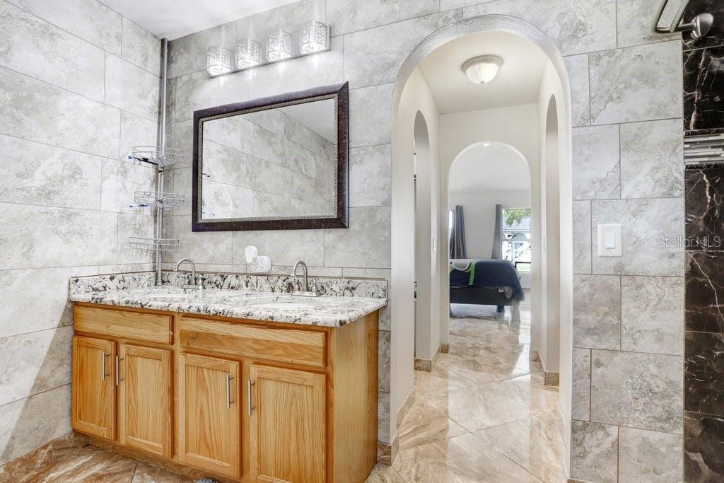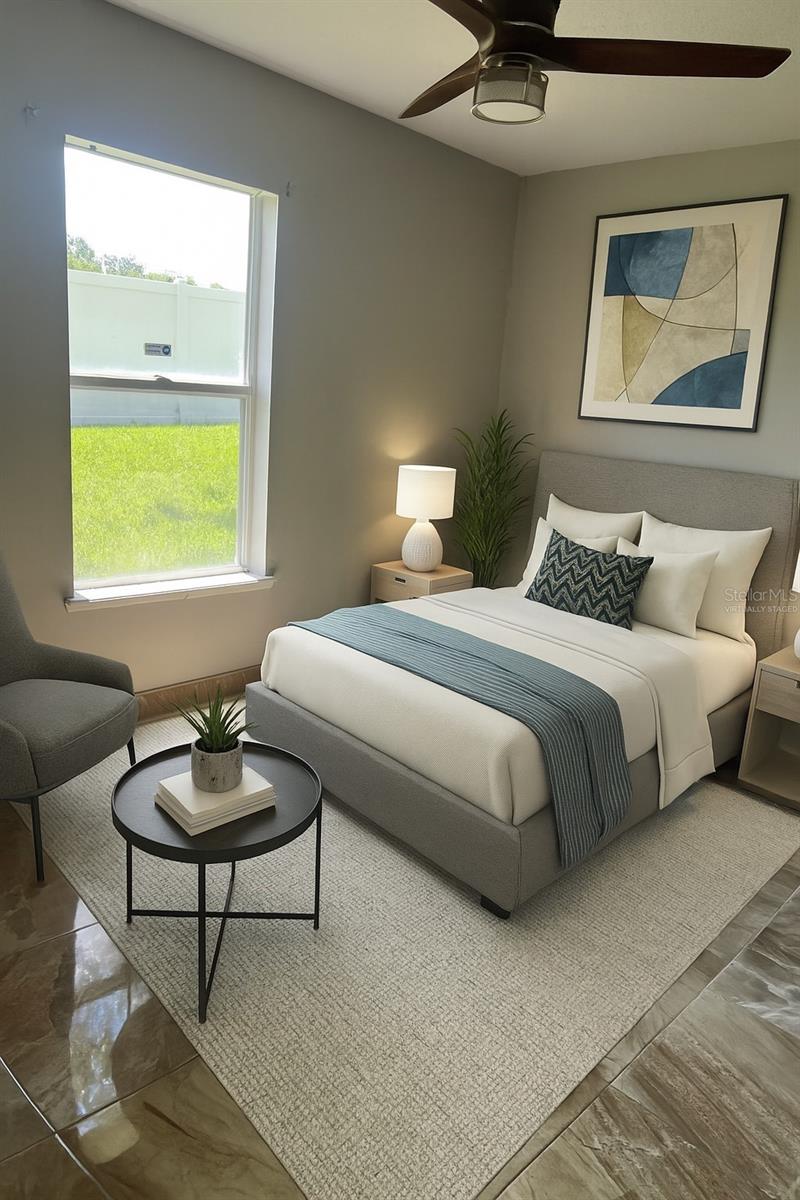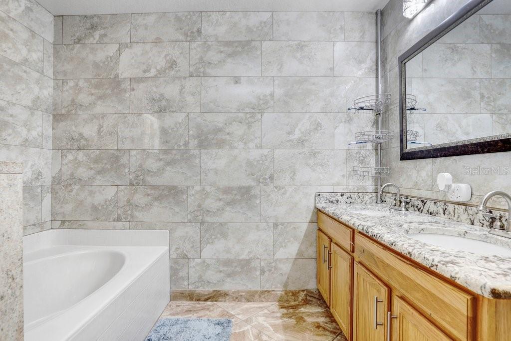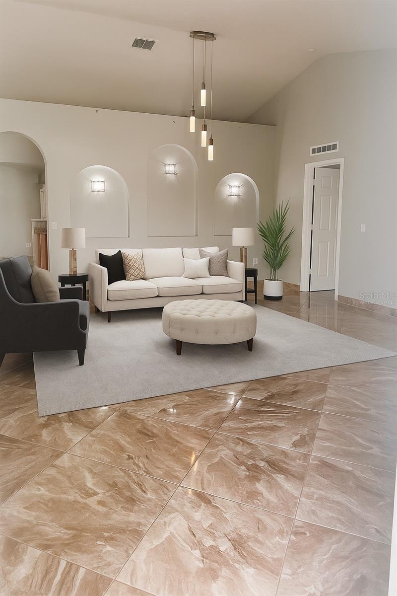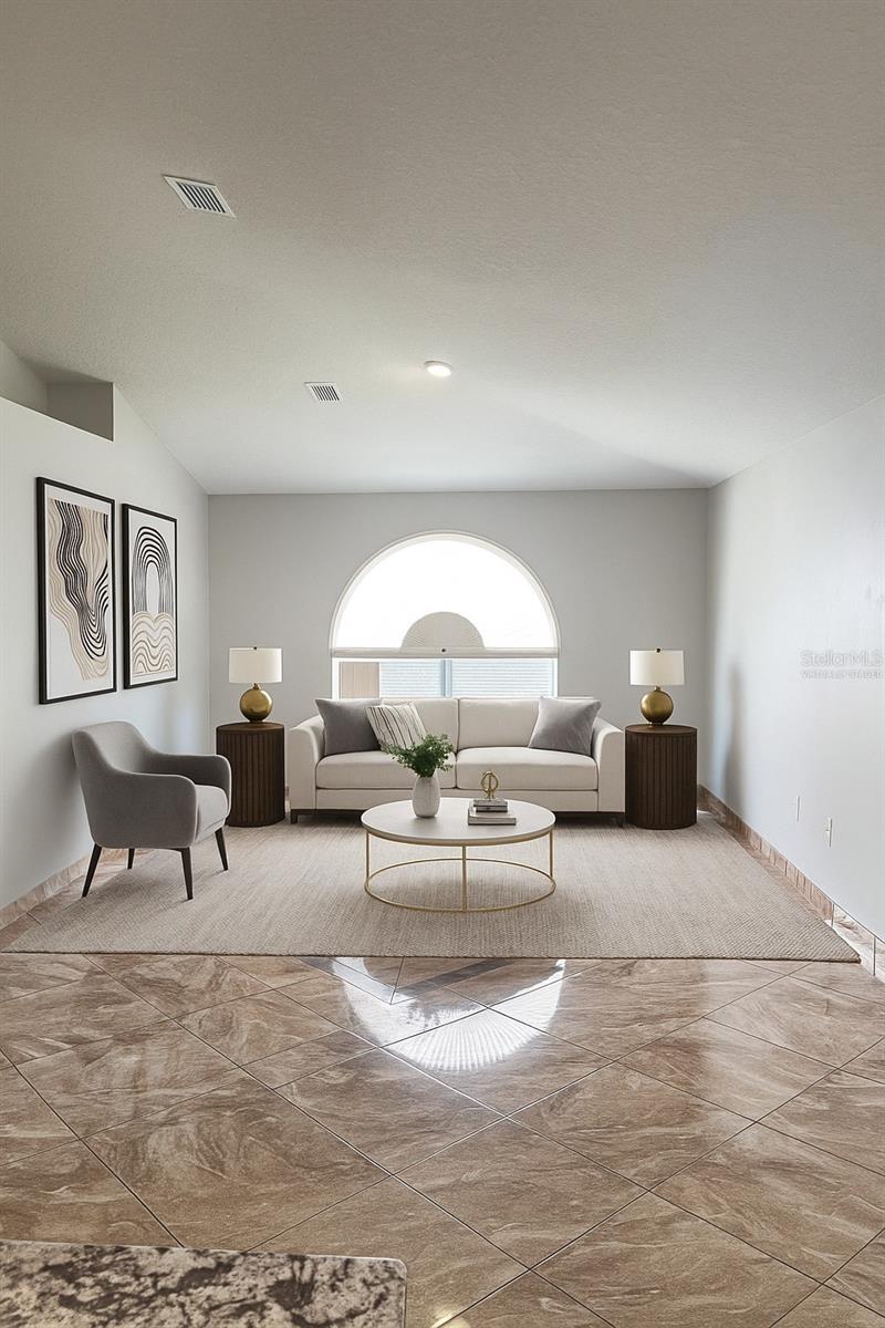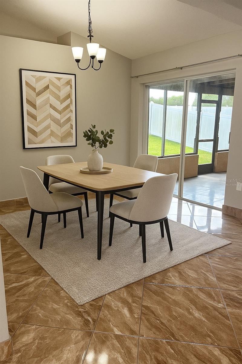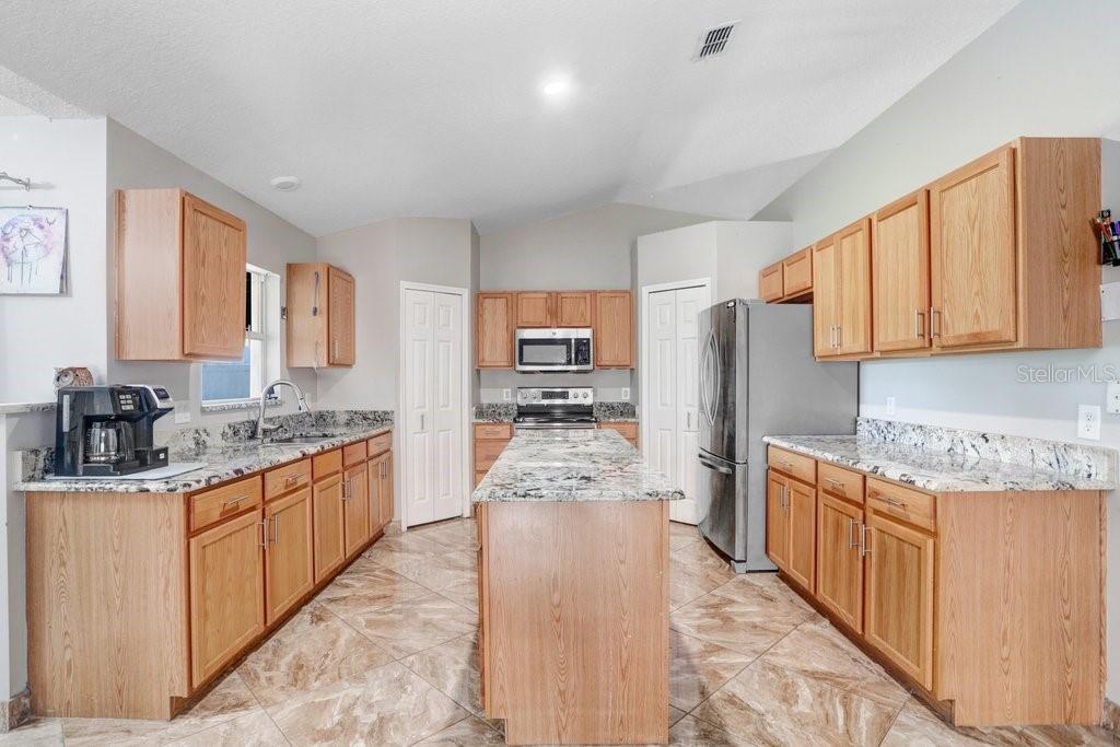 One or more photo(s) has been virtually staged. Step into this gorgeous home and be wowed by the soaring vaulted ceilings that create an open, airy atmosphere throughout. The spacious kitchen is a chef’s dream, featuring an oversized island, abundant counter space, and elegant granite countertops. With not one, but two generously-sized walk-in pantries, you'll have all the storage you need. Just off the kitchen, a sliding glass door opens up to a charming screened-in patio, perfect for relaxing and enjoying the Florida breeze. The expansive backyard is fully fenced, offering privacy and ample space for outdoor activities. The master suite is a true retreat. Indulge in the luxurious walk-in shower, unwind in the garden tub, and enjoy the double sink vanity topped with sleek granite countertops. Every inch of this home is tiled, with beautiful, easy-to-maintain flooring that complements its modern style. This home’s unbeatable location puts you just minutes from Disney, shopping, incredible dining options, and top-rated medical facilities. Whether you're looking to explore the theme parks or enjoy the local amenities, this home is ideally situated for it all. Don’t miss out on this incredible opportunity! Call today to schedule your private showing.