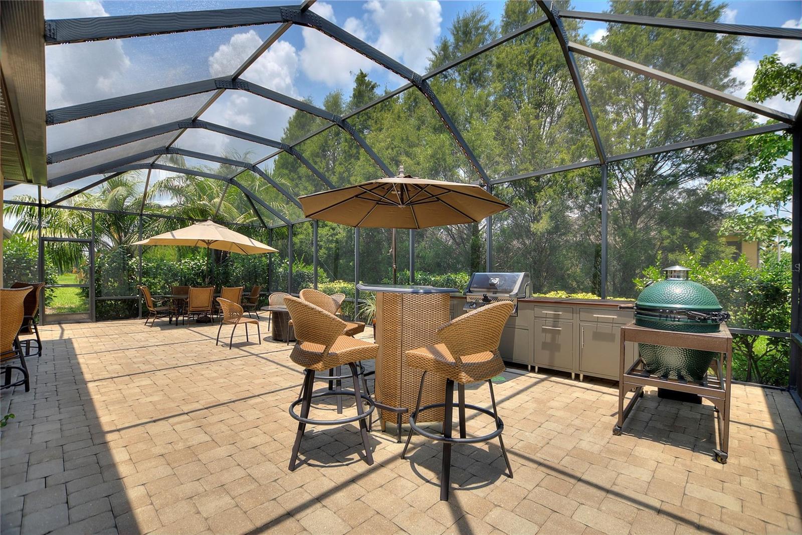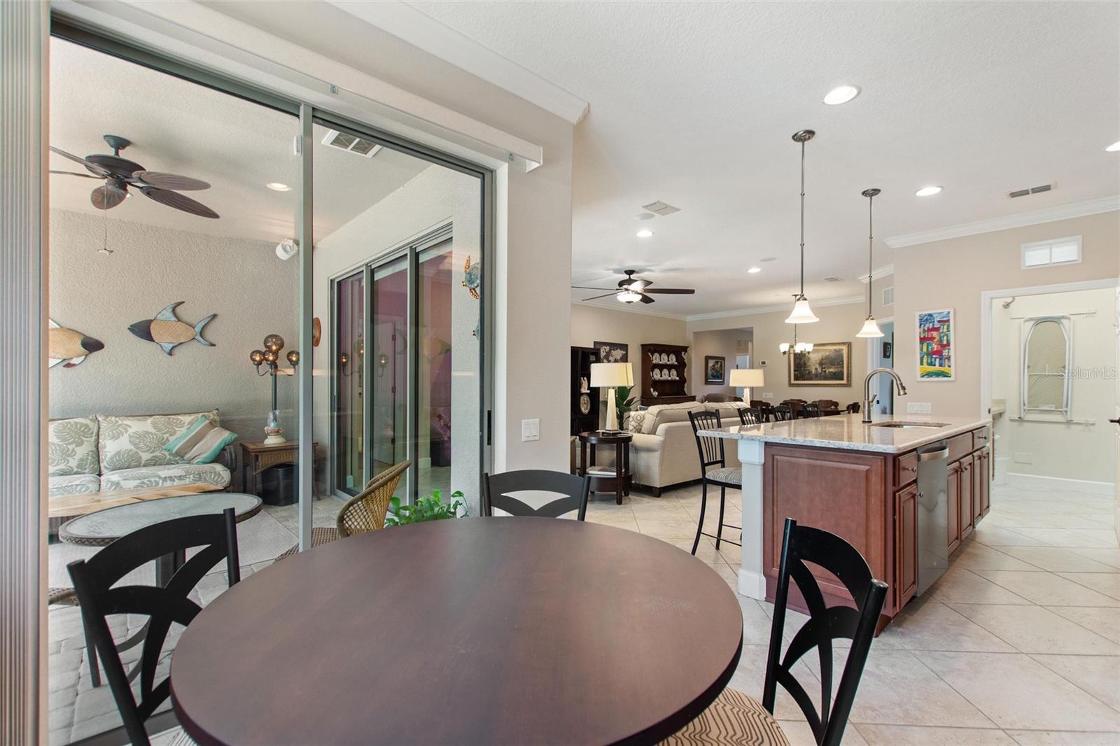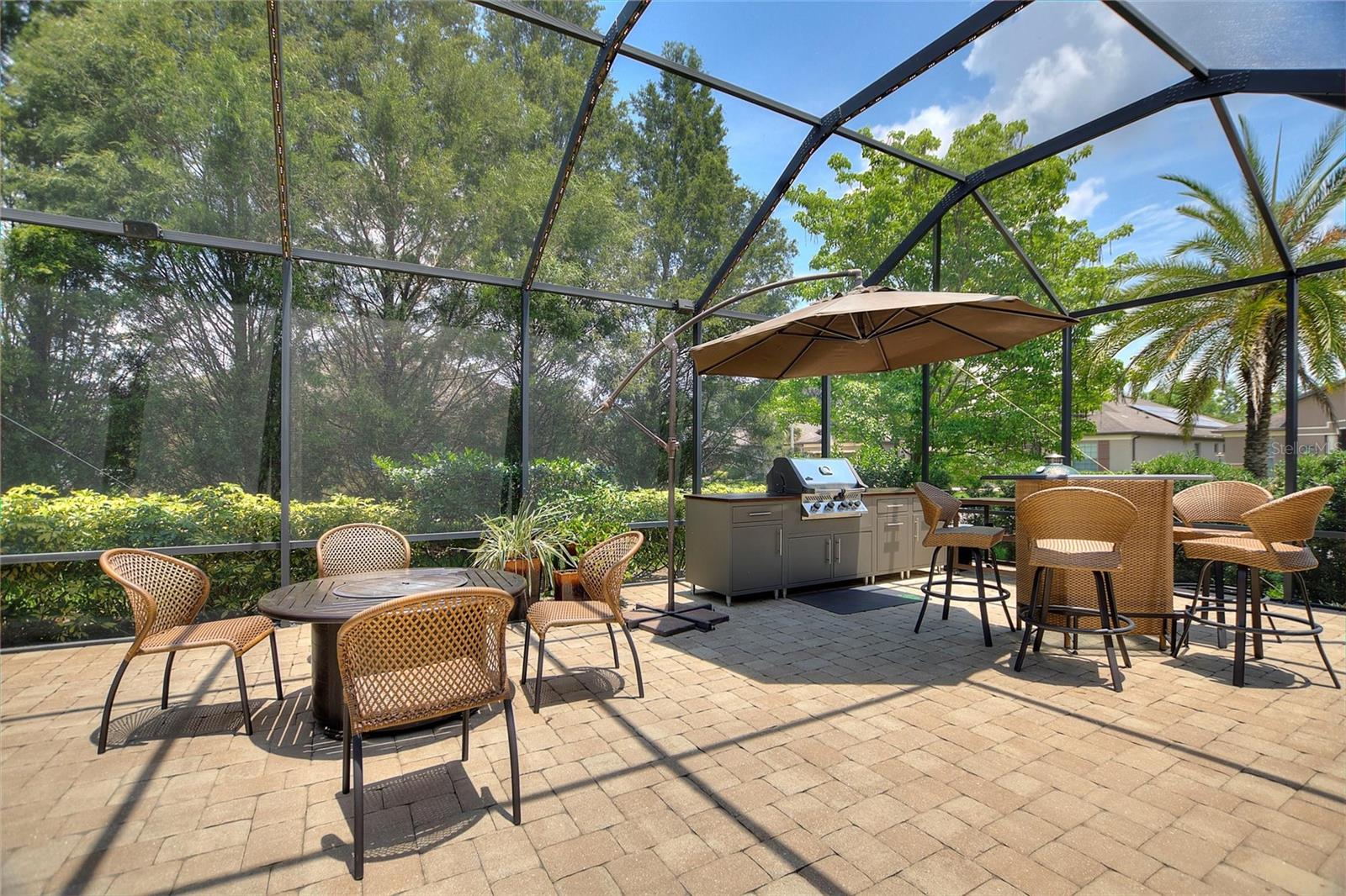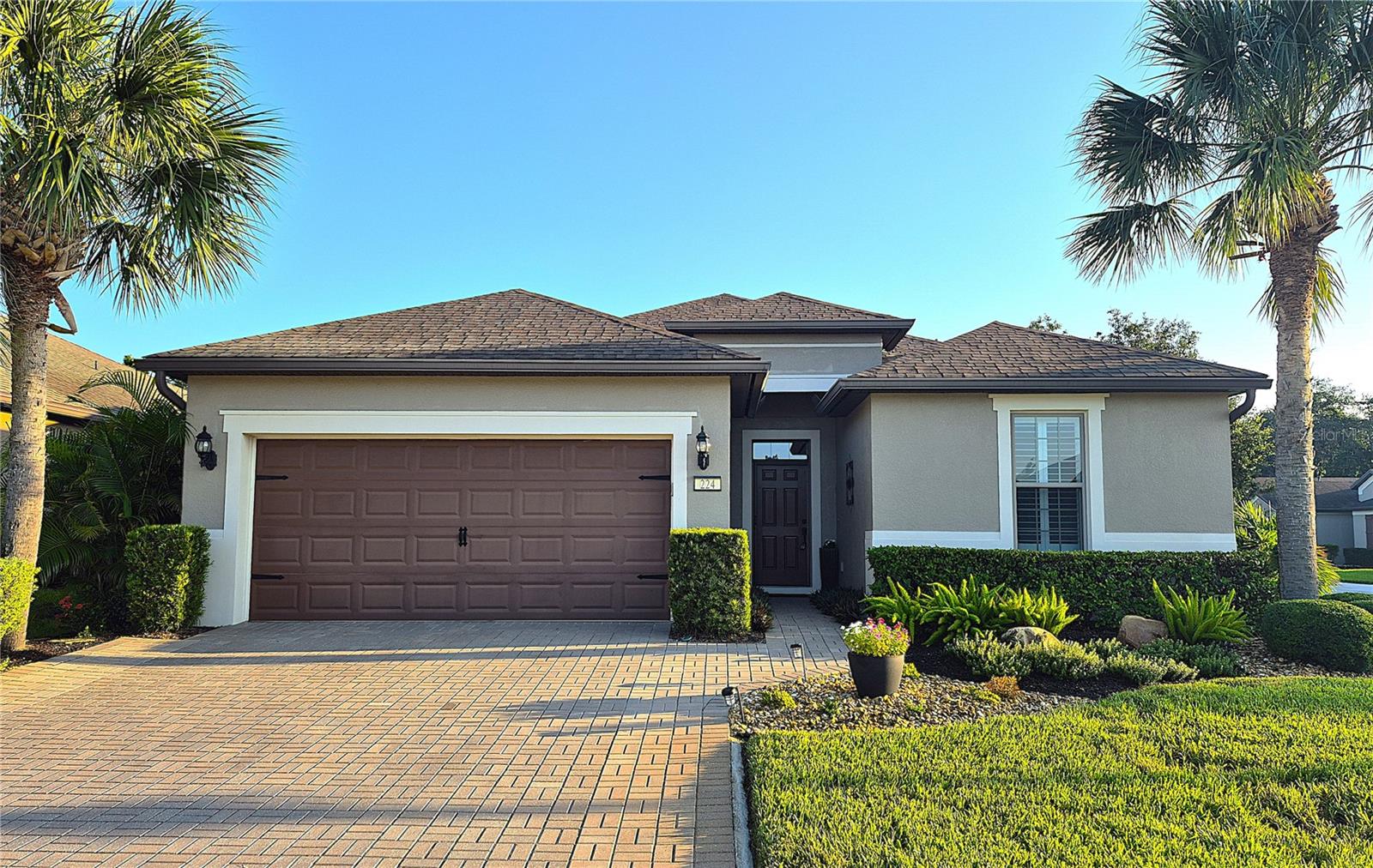 Welcome to 224 Granada Lane, situated in the desirable Del Webb Orlando community. This pristine three-bedroom, two-bath, den(which can be easily converted to a fourth bedroom) residence features a two-car garage that extends an additional four feet and is positioned on a corner lot. As you approach, the beautifully landscaped exterior, complemented by a widened driveway and front walkway, creates an inviting first impression. Inside, the home continues to impress with two front bedrooms sharing a full bath, complete with a tub, vanity sink, and elegant quartz countertops, along with additional towel bars. Both bedrooms are carpeted and equipped with spacious closets. The tiled flooring flows seamlessly from the entryway into the expansive living area, enhanced by crown molding throughout. A tiled den adjacent to the family room offers a versatile space for a home office or a cozy spot to enjoy your favorite shows. The open living area boasts surround sound, a floor electrical outlet, and a stylish ceiling fan, while the dining area is spacious enough for entertaining guests. The well-appointed kitchen, which opens to both the family and dining rooms, features staggered cabinets adorned with rope crown molding, glass front doors, pull-out shelves, and both upper and lower lighting. Stainless steel appliances and attractive quartz countertops complete this culinary space, which also includes a wine cooler, stem glass holder, and wine rack. The generous primary bedroom is carpeted and includes an en-suite bath with an upgraded walk-in shower, dual sinks with quartz countertops, and a large walk-in closet with shelving. The laundry room is equipped with upper and lower cabinets, laminate countertops, a washer and dryer, an ironing board, and a built-in sink. Designer window treatments, including shutters and blinds, add a touch of elegance throughout the home. Finally, the expansive screened lanai 20x40 features pavers, accent lighting, additional electrical outlets, and a convenient 9-foot kitchen with a gas grill, making it an ideal space for outdoor entertaining. The spacious two-car garage features ample storage solutions, including shelving and Rubbermaid tool racks. Additionally, the 100 percent paid solar panels contribute to reducing your electricity expenses. Del Webb Orlando offers its residents a range of exceptional amenities, including an outdoor pool with a jacuzzi, an indoor pool, a fitness center, and both indoor and outdoor tracks. Additionally, residents can enjoy recreational activities such as tennis, bocce, and pickleball, along with a tavern for social gatherings. Conveniently situated near major highways, shopping centers, restaurants, and the attractions of Disney, this property is must-see. Schedule your appointment today to explore this remarkable community.