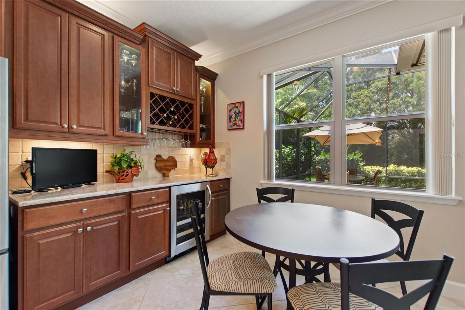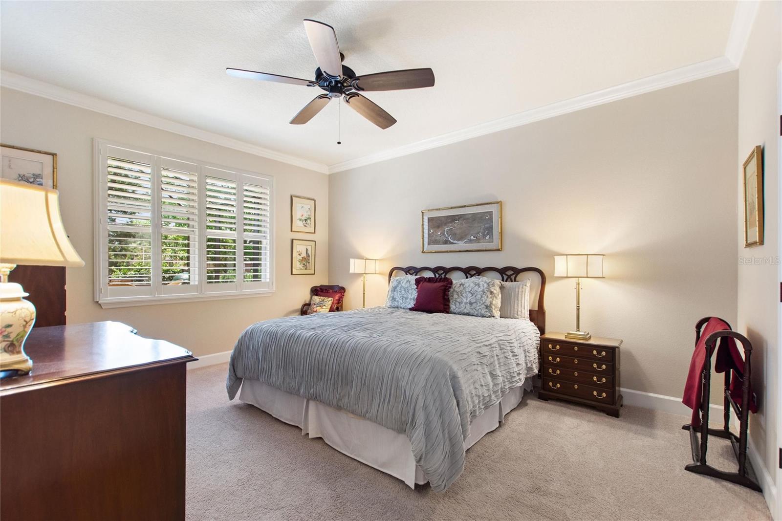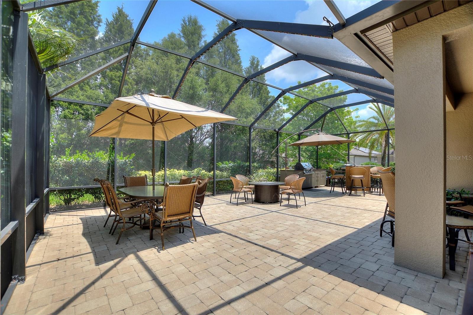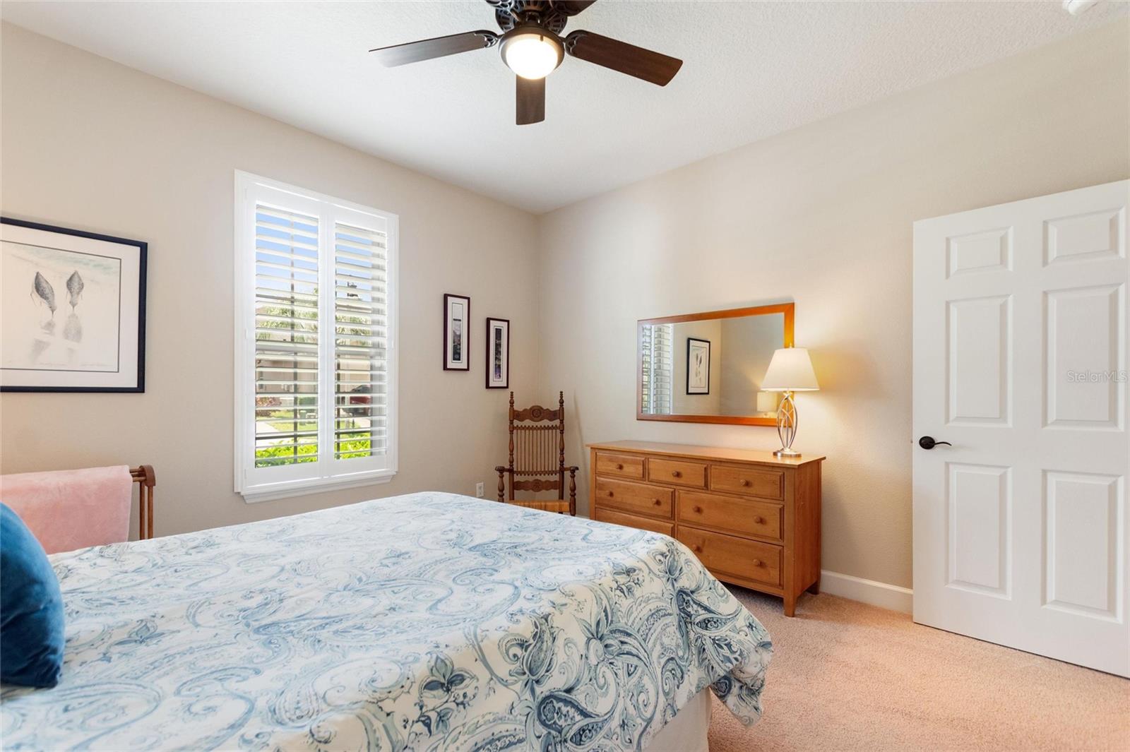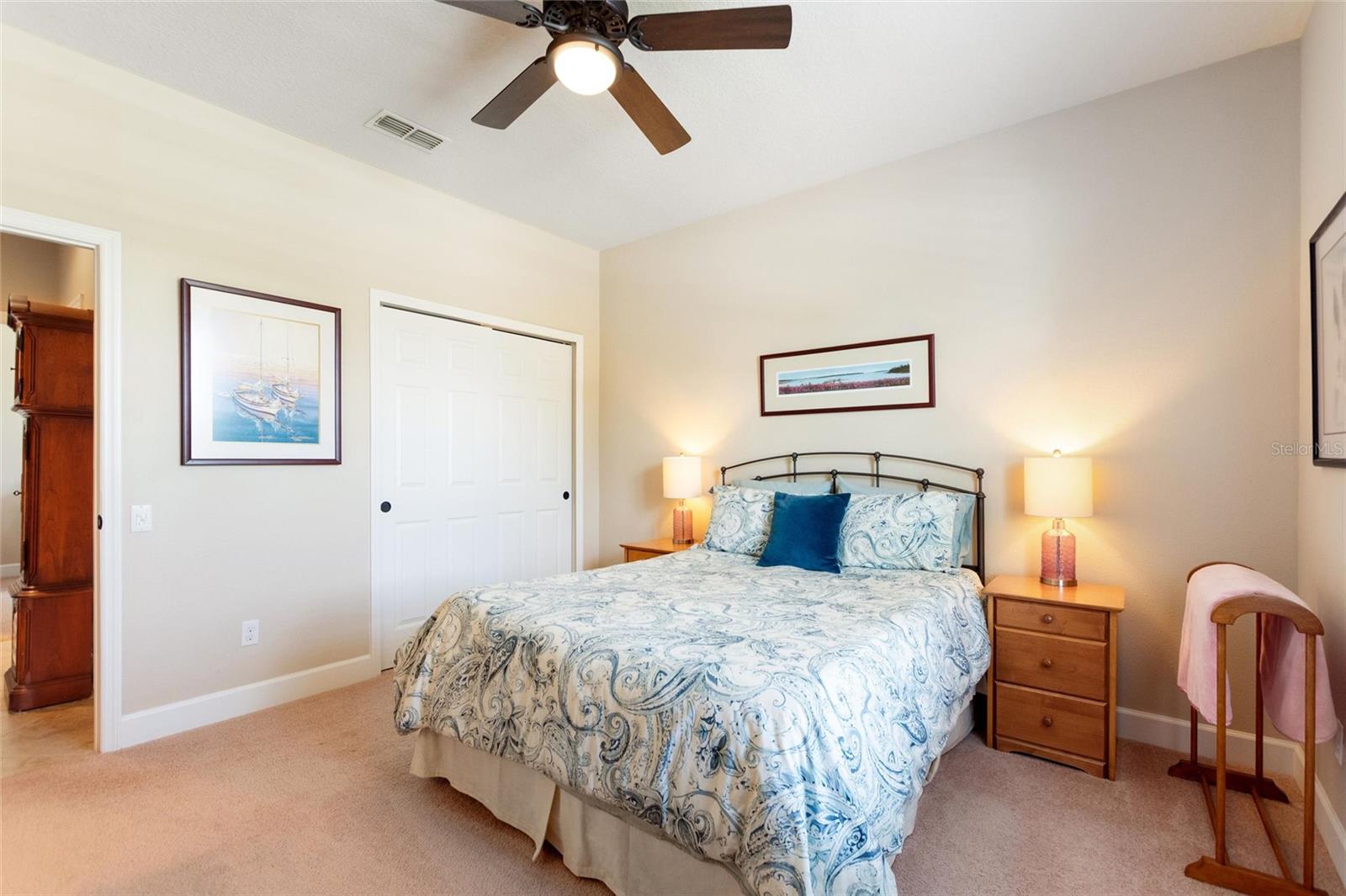 Welcome to 224 Granada Lane, situated in the desirable Del Webb Orlando community. This pristine three-bedroom, two-bath, den(which can be easily converted to a fourth bedroom) residence features a two-car garage that extends an additional four feet and is positioned on a corner lot. As you approach, the beautifully landscaped exterior, complemented by a widened driveway and front walkway, creates an inviting first impression. Inside, the home continues to impress with two front bedrooms sharing a full bath, complete with a tub, vanity sink, and elegant quartz countertops, along with additional towel bars. Both bedrooms are carpeted and equipped with spacious closets. The tiled flooring flows seamlessly from the entryway into the expansive living area, enhanced by crown molding throughout. A tiled den adjacent to the family room offers a versatile space for a home office or a cozy spot to enjoy your favorite shows. The open living area boasts surround sound, a floor electrical outlet, and a stylish ceiling fan, while the dining area is spacious enough for entertaining guests. The well-appointed kitchen, which opens to both the family and dining rooms, features staggered cabinets adorned with rope crown molding, glass front doors, pull-out shelves, and both upper and lower lighting. Stainless steel appliances and attractive quartz countertops complete this culinary space, which also includes a wine cooler, stem glass holder, and wine rack. The generous primary bedroom is carpeted and includes an en-suite bath with an upgraded walk-in shower, dual sinks with quartz countertops, and a large walk-in closet with shelving. The laundry room is equipped with upper and lower cabinets, laminate countertops, a washer and dryer, an ironing board, and a built-in sink. Designer window treatments, including shutters and blinds, add a touch of elegance throughout the home. Finally, the expansive screened lanai 20x40 features pavers, accent lighting, additional electrical outlets, and a convenient 9-foot kitchen with a gas grill, making it an ideal space for outdoor entertaining. The spacious two-car garage features ample storage solutions, including shelving and Rubbermaid tool racks. Additionally, the 100 percent paid solar panels contribute to reducing your electricity expenses. Del Webb Orlando offers its residents a range of exceptional amenities, including an outdoor pool with a jacuzzi, an indoor pool, a fitness center, and both indoor and outdoor tracks. Additionally, residents can enjoy recreational activities such as tennis, bocce, and pickleball, along with a tavern for social gatherings. Conveniently situated near major highways, shopping centers, restaurants, and the attractions of Disney, this property is must-see. Schedule your appointment today to explore this remarkable community.