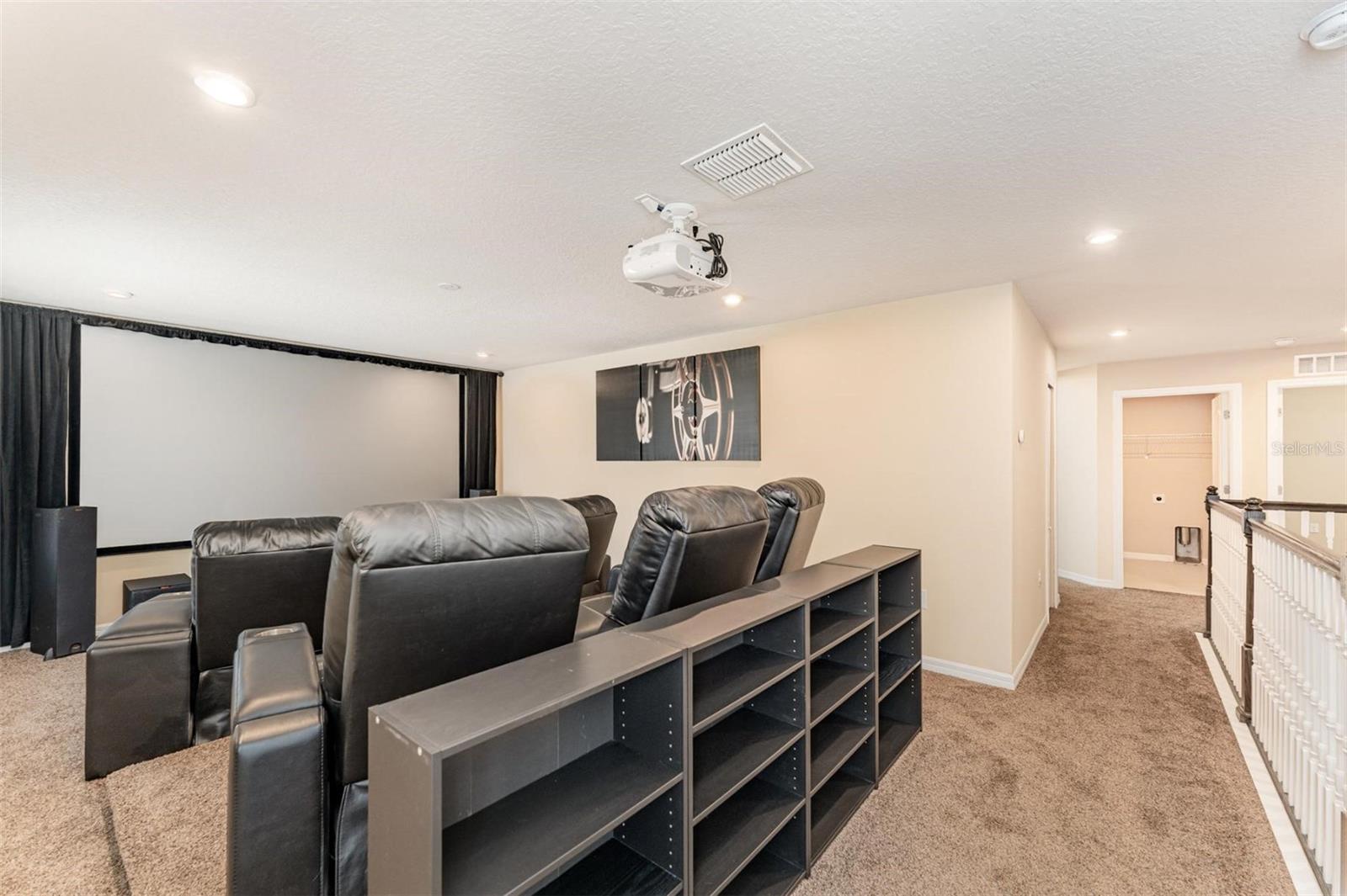 Luxury home featuring a private home theater located near Disney – your dream lifestyle awaits! Prepare to be captivated by this stunning home built by Ryan Homes, where elegance meets innovation in the highly sought-after Champions Reserve community. Perfectly positioned less than 15 minutes from the Walt Disney World theme parks and just minutes away from fine dining, shopping, top-rated hospitals, and world-class golf courses, this home offers the ultimate Florida lifestyle. This single-family home has all the style and comforts you desire, featuring brand new carpet throughout and new exterior paint. The airy foyer is accented by a graceful arch welcoming you inside. A study with French doors and a formal dining room are on the left, while on the right down the hall you can find a home office with a closet (which could be 5th bedroom), and a half bath. Back in the main entry, past the waterfall staircase to the second level, is the large family room which opens to the kitchen featuring wood cabinets, a spacious pantry, beautiful granite countertops with a large island (seating for 4), and an eat-in dinette. This home features 10-foot ceilings on the main level and an abundance of windows providing a bright and spacious environment. Upstairs on the second level are 4 bedrooms, 2 full bathrooms, large laundry room, and an expansive loft boasting a home theater with 10-foot screen, Klipsch 5.2 surround sound speaker system, and two rows of leather recliners with built-in cup holders. The luxurious owner’s suite is truly remarkable with dual walk-in closets, a double bowl vanity, and separate deep soaking tub and shower. Green Energy Efficient appliances can be found throughout the home, including two HVAC systems, lighting/ceiling fans throughout, NEST wi-fi thermostat system, single hung energy efficient windows, and low-flow plumbing fixtures. A 2-car attached garage offers space for two vehicles plus storage and a utility tub for cleaning up outdoor messes. The home is also wired for a security system. There is a 10-foot attached covered lanai, and a large backyard with mature landscaping, Rain Bird sprinkler system, and tall vinyl privacy fence. This home is located in the Champions Reserve subdivision, a gorgeous community with resort-style amenities, including a beach-style swimming pool and children's playground. There are several convenient shopping centers within excellent proximity to Champions Reserve; Champions Gate Village and Champions Gate Downtown Shopping Center, for instance, are just a mile away and offer everything from a Publix Grocery Store to multiple restaurants, banks, and convenience stores. In addition, there are a number of golf courses surrounding the community, including the Reunion Resort golf courses, which are just 4 miles away. Champions Reserve is approximately 6.5 miles away from I-4 and only 10 miles away from the Walt Disney World Resort entrance, making this community an attractive choice for those looking for resort-style features with commuter convenience.