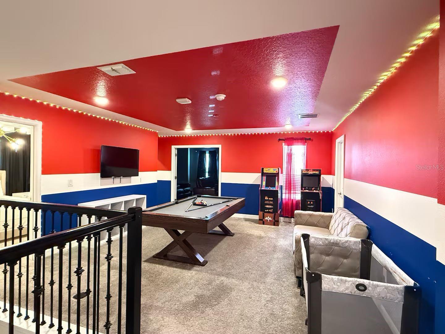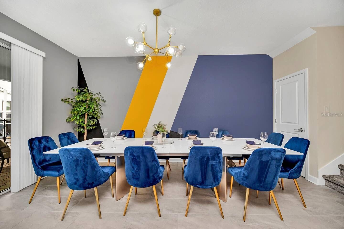 Located in the ChampionsGate community, this fully furnished 8-bedroom, 5-bathroom residence offers approximately 4,788 square feet of living space and is well suited for use as a vacation home or short-term rental property. The home features an open-concept floor plan designed to accommodate larger groups and provide multiple entertainment areas. The main living area includes a spacious great room and dining space with seating for large gatherings. The kitchen is equipped with quartz countertops, stainless steel appliances, a breakfast bar, and a pantry, providing ample preparation and storage space. The primary suite on the main floor includes direct access to the covered lanai and screened pool and spa area. The outdoor space features a private pool, spa, lounge seating, and outdoor dining space with views of the surrounding green space. Upstairs, the home includes a loft media area as well as a dedicated home theater with large-screen viewing and theater-style seating. A game room provides additional recreational space with arcade-style entertainment and table games. The property includes eight bedrooms with a variety of layouts, including multiple suites and themed rooms designed for guests of different ages. Residents and guests have access to the Oasis Club at ChampionsGate, which offers resort-style amenities including a pool complex with lazy river and water slides, splash area, cabanas, restaurant, tiki bar, fitness center, movie theater, and sports courts. Conveniently located near the ChampionsGate town center with dining and shopping options, the property also offers easy access to I-4, major attractions including Walt Disney World Resort, and other Central Florida destinations. This property provides a spacious layout, extensive entertainment features, and access to resort-style community amenities. Schedule your private showing today.