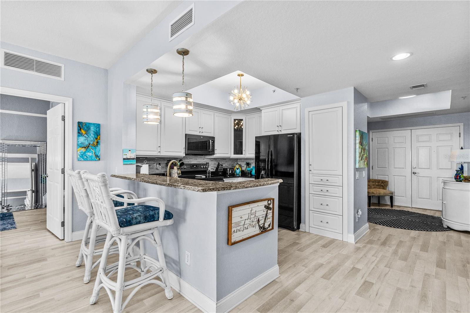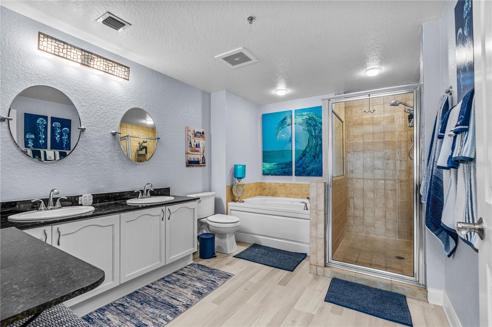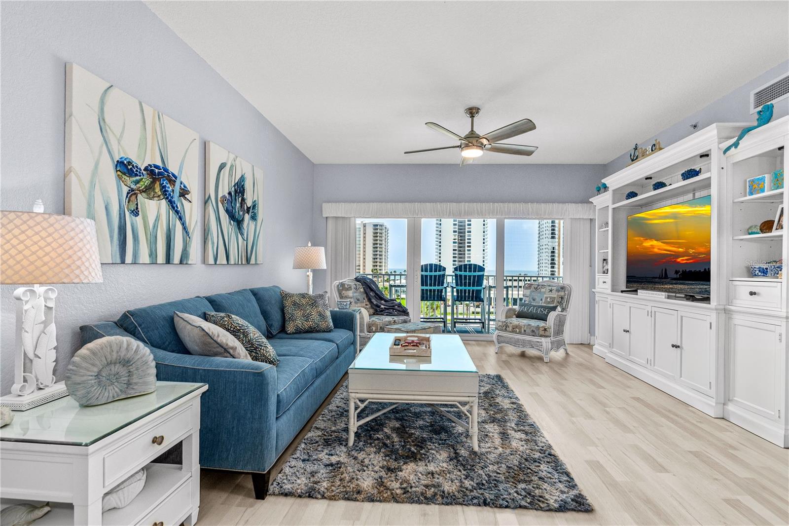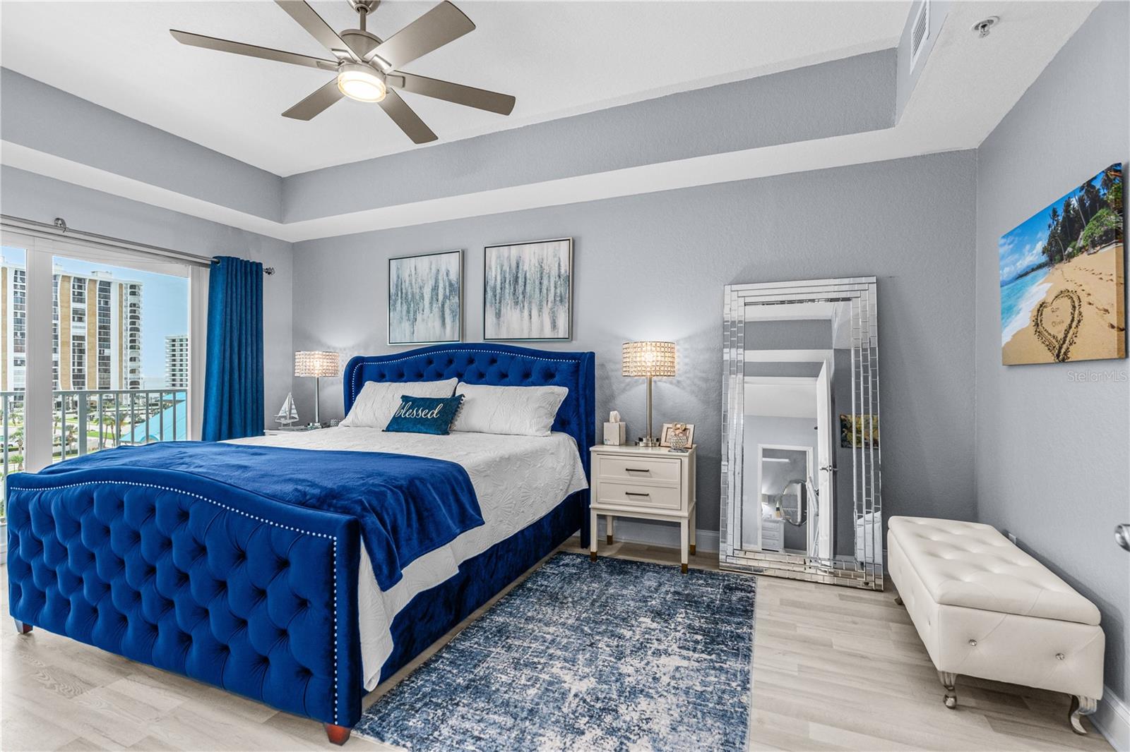 DIRECT OCEAN VIEWS!! The Oceans Grand Condominiums is highly sought after, and is the premier condo for the beachside with their breathtaking views, and vast amenities. This large 2 bedroom condo is a ''center stack'', which means that it faces directly to the ocean... these units do not come available very often! Both bedroom suites have their own balcony with ocean views. So, you can wake up to the sound of waves and watch the sunrise from your own private balcony. This unit is completely ''turn key'' with amazing upgrades throughout. The bonus room/office can very easily be converted into a third bedroom. It comes fully furnished with all high-end, quality furnishings. LVP flooring throughout. Hurricane rated windows and doors. Master bathroom has granite tops, his & her sinks, stand-up shower and jacuzzi tub. Kitchen has granite tops and soft close cabinets. Freshly painted interior. Nine foot ceilings. AC 2024. WH 2019. (2) storage cages. Assigned parking space in garage. This newer complex is structurally and financially strong! It has recently completed a Structural Integrity Reserve Study (SIRS), and it is fully funded, which gives you comfort and peace of mind knowing that it is fiscally responsible.