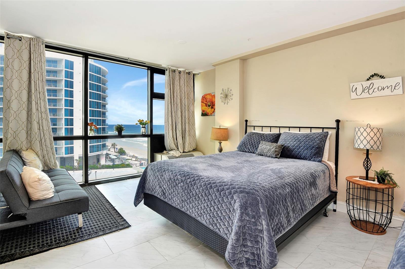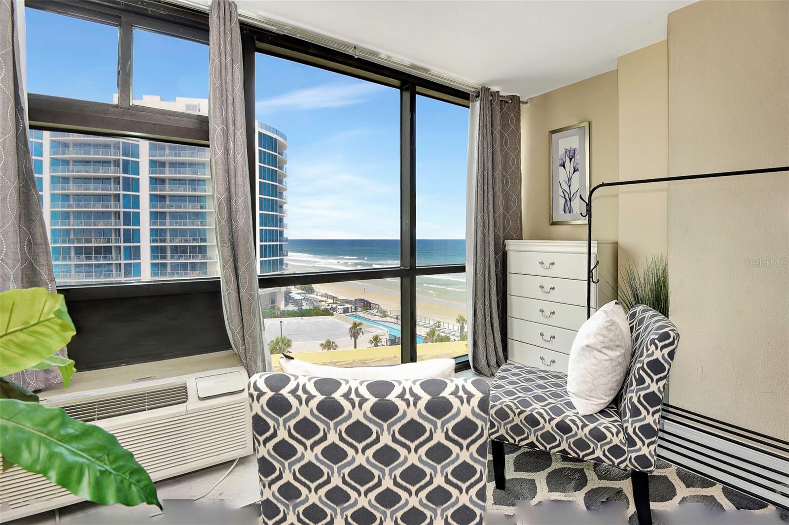Experience the ultimate beach lifestyle in this stunning condo set. With a modern and stylish remodeling, this luxurious 2-unit condo is complete with floor-to-ceiling windows and offers breathtaking views of the Atlantic Ocean. The two units, 620 & 621, combine for 793 square feet of beauty, ensuring ample space for everyone to relax and unwind in comfort. 621 features a brand new stylish king-sized bed, two new sofa chairs, a beautiful bathroom, and porcelain tile floors throughout. The second unit, 620, features two queen sized beds, new stylish futon sofa, a kitchenette, a standing showing in bathroom, porcelain tiles throughout, and this unit can comfortable accommodate up to five guests. Relax and indulge in a range of incredible amenities, including a fully remodeled lobby area, updated hallways with new carpet installed in 2024, a spectacular pool, and a tiki bar. All this comes with an opportunity to join the daily rental program run by the on site management team. You can enjoy extra income with hassle-free for you, with 80/20 profit split. These two units stand out against the competition because these two units have been fully remodeled and have incredible views. A proved track record of rentals as well as any future rentals will transfer with new ownership. The best feature of this condo is the location! Just steps from the sandy beaches of Daytona, you’ll have your own piece of paradise right at your fingertips. Whether you’re looking for a quiet escape or a vibrant beach scene, you’ll find everything you need to unwind as well as recharge in this gorgeous and luxurious condo. Note: Unit 620 comes with a long term renter and lease will transfer to new owners. HOA of $809 monthly fee that covers all amenities is completely covered by this renter. As of November 2024 the assessment fee has ended. There will be additional income coming from all rentals of the 2nd condo 621 with the 80/20 split. If interested the new owners have the option to keep 621 off the rental program, just for personal use.
