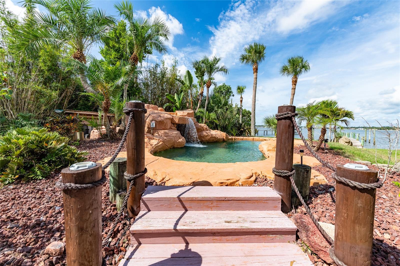 Welcome to your dream waterfront home in Daytona Beach Shores! This magnificent 5-bedroom, 5-bathroom property offers an unparalleled waterside lifestyle and a front-row seat to the amazing sunset every evening, but didn't get flooded in any of the recent storms! With a large open living area, and a spacious 0.34-acre lot with 90 foot of river frontage, this home is designed for comfort and luxury. Relax by the refreshing pool with a waterfall and a hidden grotto as you watch the boats and dolphins cruise by the Halifax River. The main kitchen is a chef's delight, with luxury details and a layout perfect for entertaining, and a bonus entertaining kitchen in the west wing of the home. Most of the home was constructed in 2003 (per permits) You get not one but TWO Owner's Suites in this home, one on the first floor and one on the second, for a total of 3 bedrooms upstairs and 2 downstairs. The enormous upstairs primary suite features spectacular river views, a sitting area, an oversized walk-in closet, an en-suite bath with dual sinks and a huge walk-in shower with multiple spray heads, and a riverfront balcony with 180 degree river views and stairs leading to the yard. A separate 2 bedroom/2 bath suite downstairs (the original 1955 house) provides versatile living space for various family members, in-laws, teens, or guests. Step outside to the pool area, surrounded by lush tropical landscaping, a waterfall, and a cave! The brick paver patio includes a wet bar and offers stunning river views. Wander out onto your private boat dock and you'll find an electric boat lift, a jet ski floating dock, lighting, and several places for visiting boats to tie off. Furniture is available for purchase. Short term rentals allowed, verify with Daytona Beach Shores for details. Imagine hosting friends and family, watching sunset over your dock, and seeing boats passing by – your own tropical oasis!