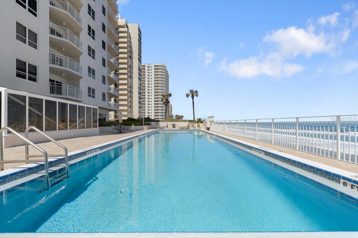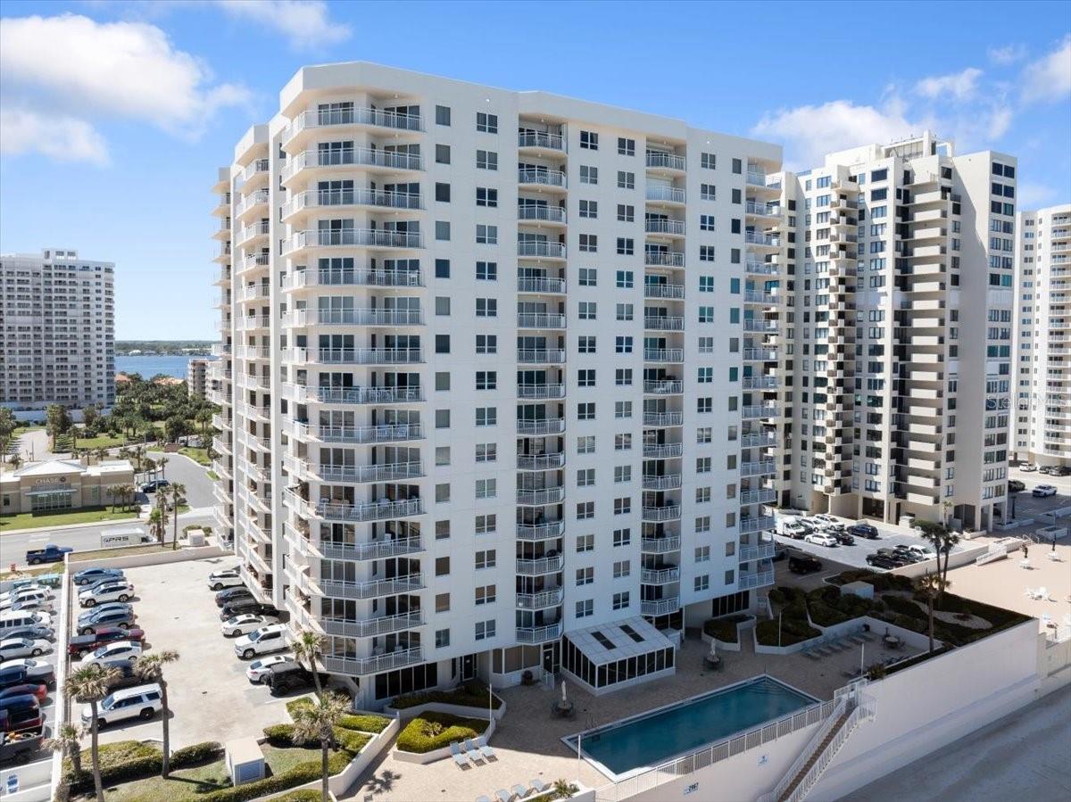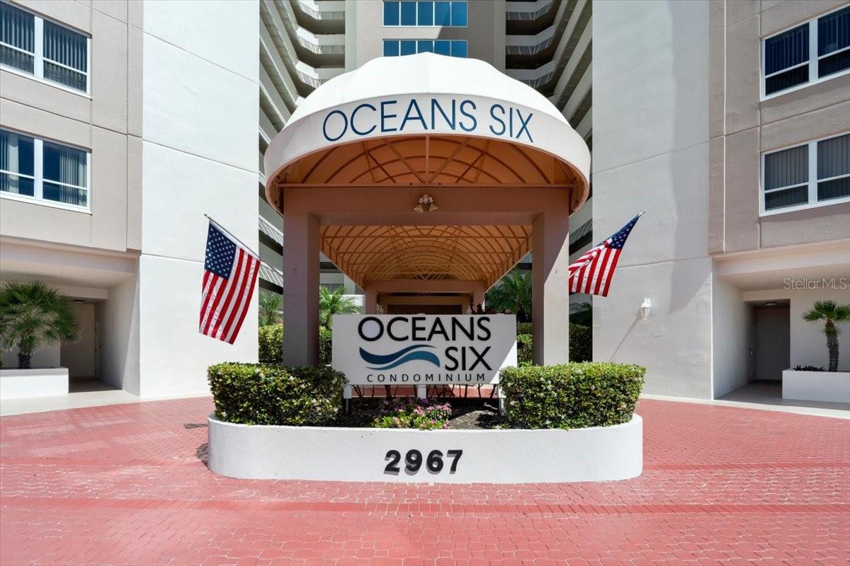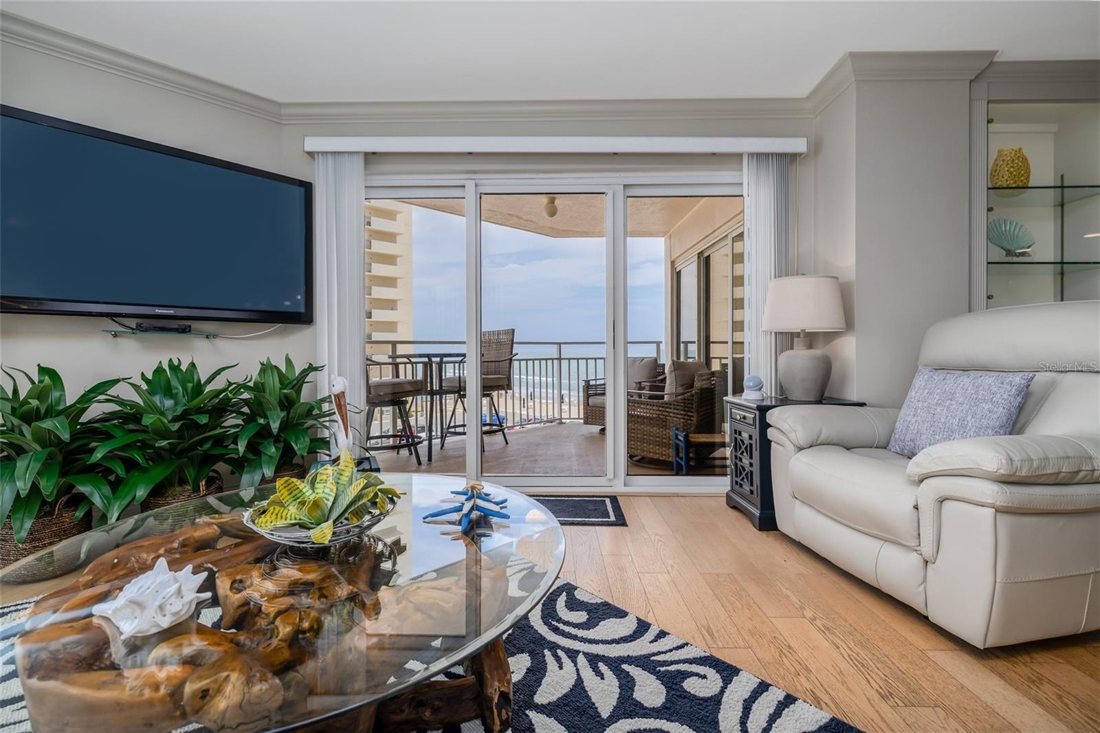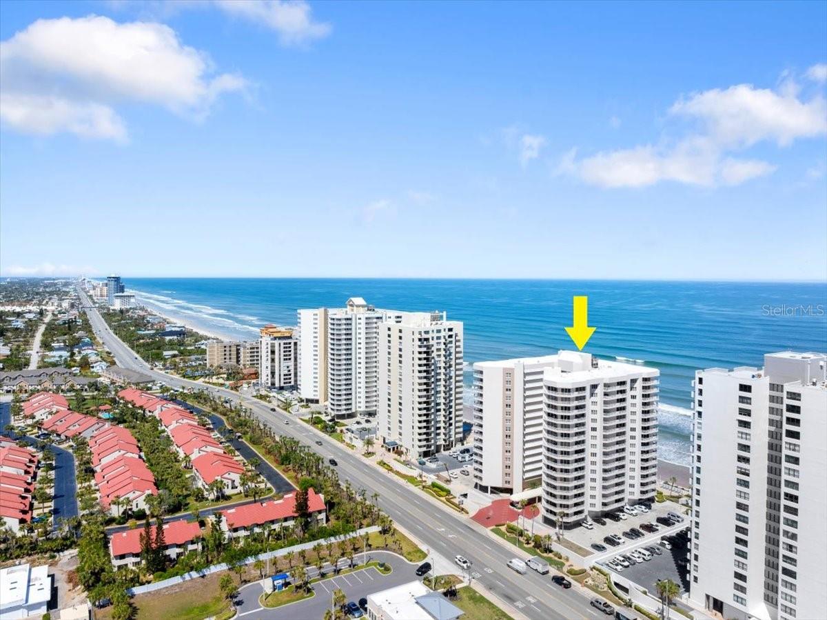 Discover coastal luxury living at its finest in this stunning 3-bedroom, 2-bathroom oasis. Embrace the tranquility of beachside living with breathtaking ocean views and sunsets from an expansive wrap-around balcony. This end unit boasts a wealth of modern upgrades and elegant features, providing an unparalleled living experience in the heart of Daytona Beach Shores. Every detail has been meticulously crafted, from the beautiful hardwood floors that stretch throughout the residence to the crown molding that accents each room. Natural light cascades in through new blinds, while upgraded lighting fixtures and ceiling fans add a touch of sophistication. Custom built-ins are thoughtfully placed around the unit, offering lighted display cabinets, hidden storage, and custom shelving to showcase your treasures. The heart of this home is the beautifully designed kitchen, complete with recessed lighting, rich wood cabinetry highlighted by a lighted display, stainless steel appliances, a tiled backsplash, and open counter seating. Retreat to the spacious primary bedroom, where you can indulge in ocean vistas, direct balcony access, a generous walk-in closet, and an updated en suite with a frameless shower door and custom dual sink vanity. The guest bedrooms are equally impressive, one featuring private balcony access. They share a remodeled bathroom with a thoughtfully tiled design on the floor and shower walls, and a spa-like vanity, complete with unique blue trimmed light-up mirrors that add an air of luxury. An in-unit laundry room with newer washer/dryer provides convenience and practicality to this opulent space. Set in the well-maintained Oceanfront Oceans Six Condominium complex, this unit delivers both the privacy and amenities that discerning buyers desire with 2 pools, spa, saunas, oceanfront fitness center, clubroom, library, workshop in the garage, extra storage, bike room, and 1 assigned secured parking. Furnishings negotiable. AC 2017, Water Heater 2022. This prime location offers easy access just across the street to Publix, Walgreens, banking, pickleball, tennis, a public golf course and dog park. The reserves are fully funded and the SIRS inspection is completed for this building! All information recorded in the MLS intended to be accurate but cannot be guaranteed.
