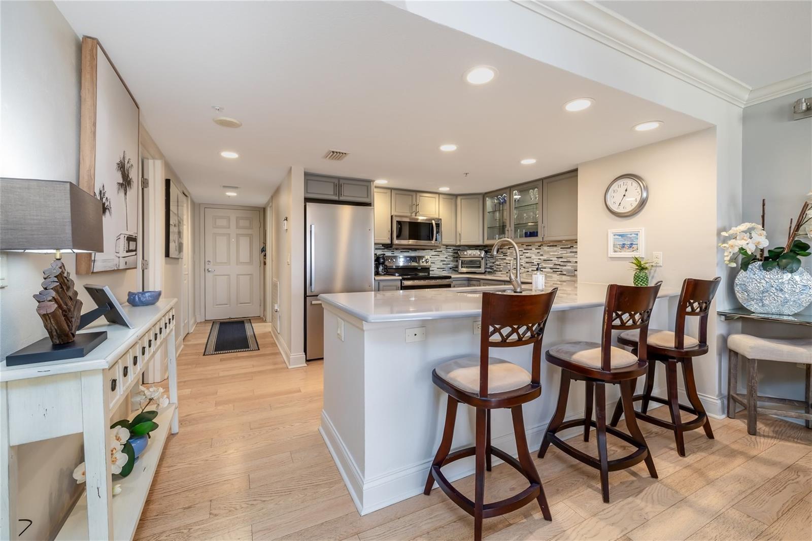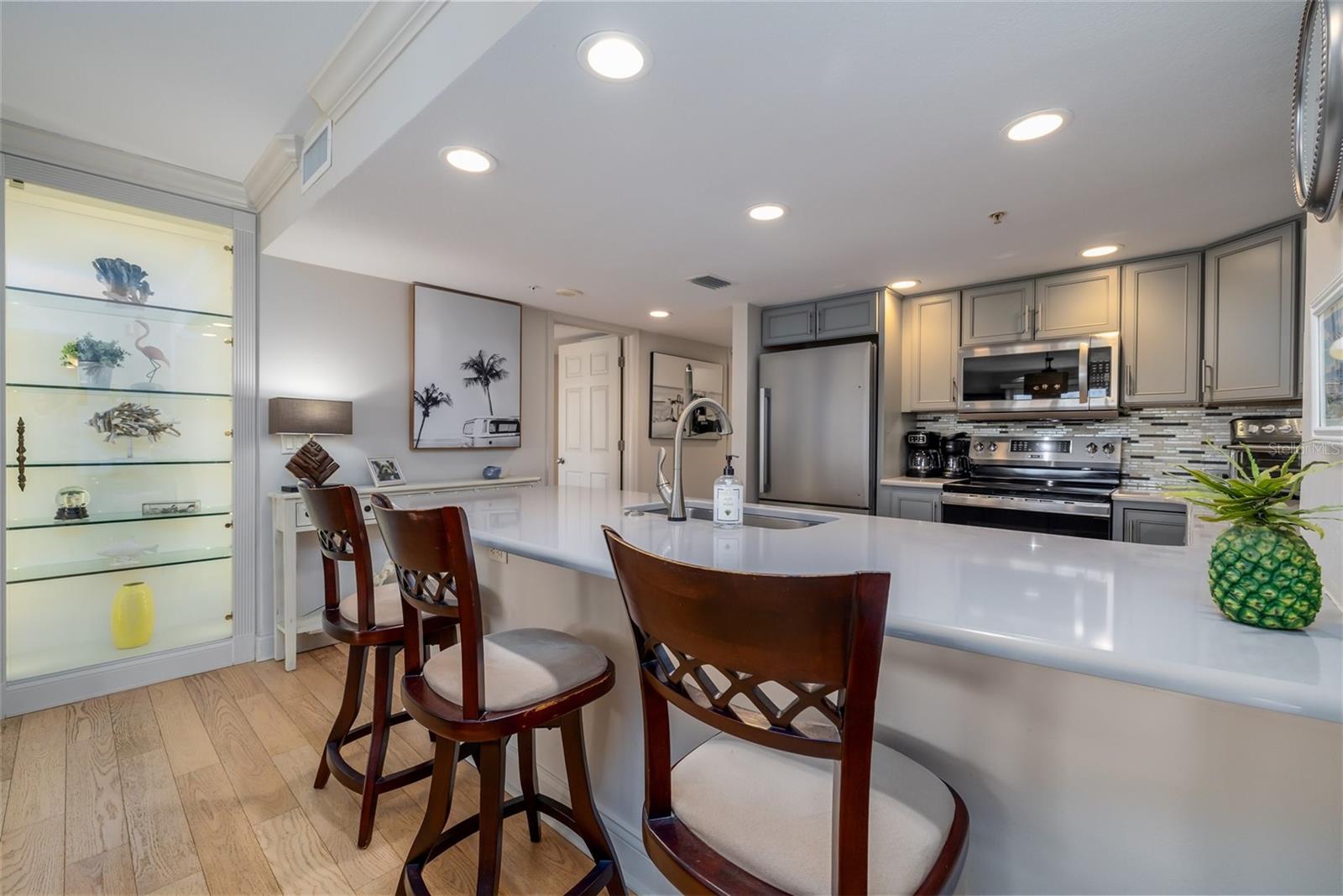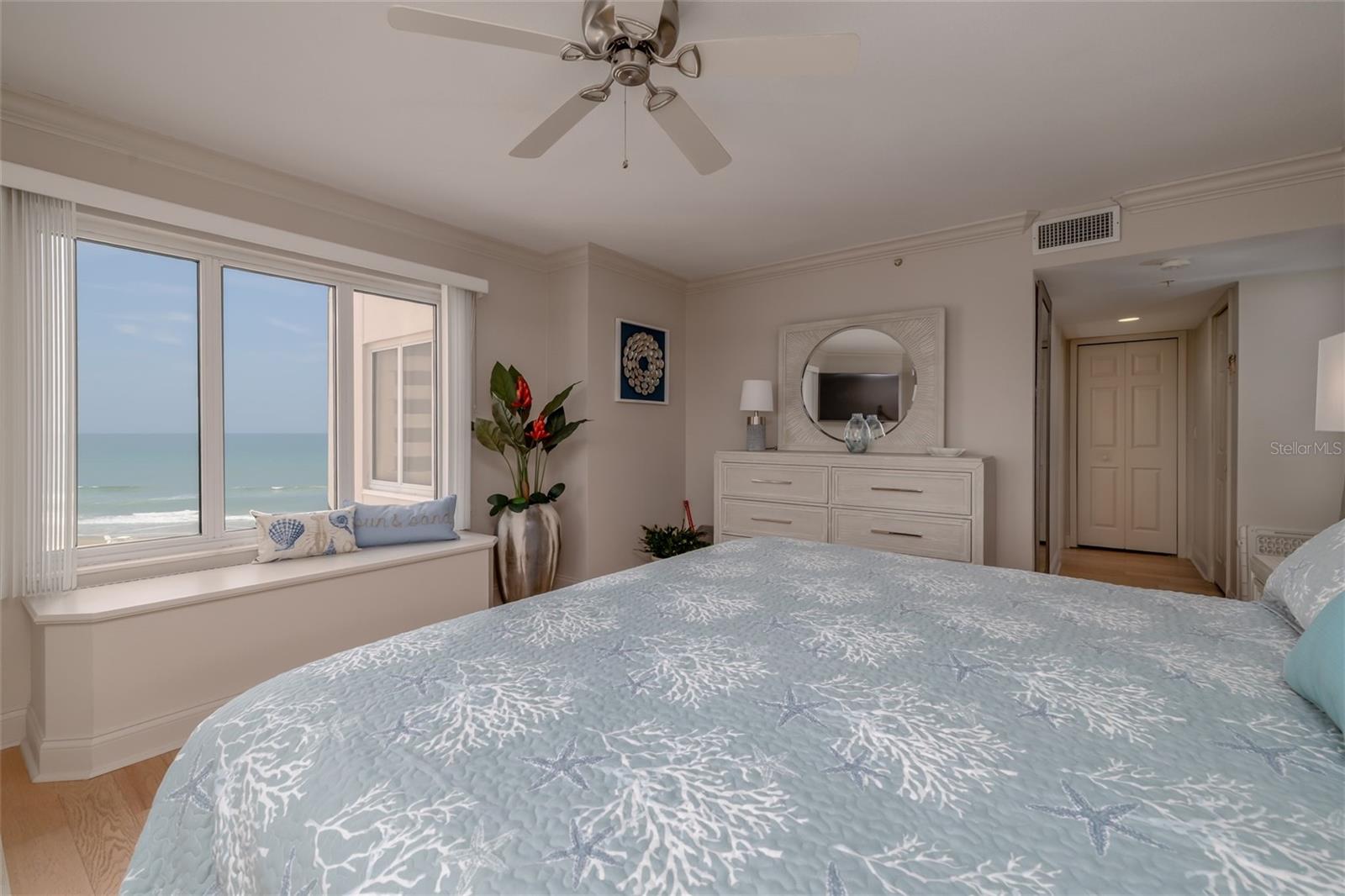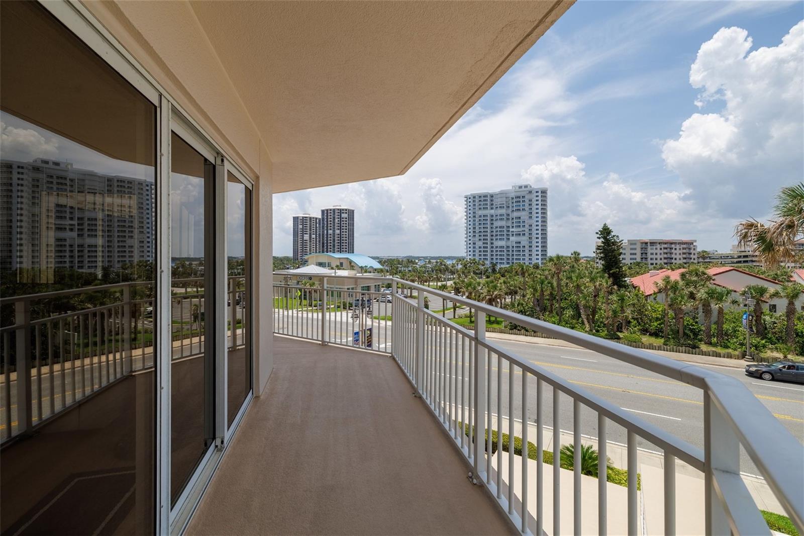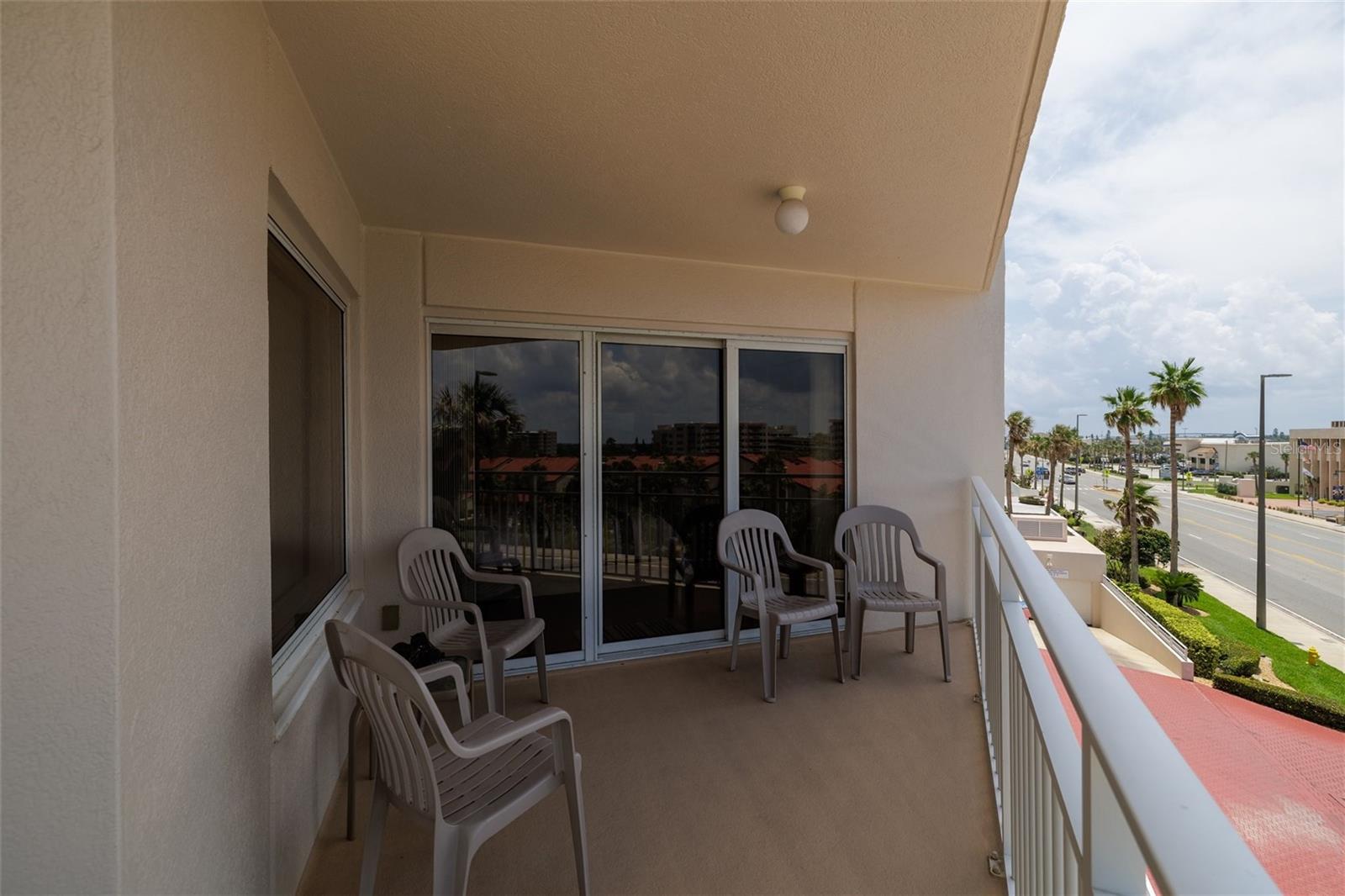 Discover coastal luxury living at its finest in this stunning 3-bedroom, 2-bathroom oasis. Embrace the tranquility of beachside living with breathtaking ocean views and sunsets from an expansive wrap-around balcony. This end unit boasts a wealth of modern upgrades and elegant features, providing an unparalleled living experience in the heart of Daytona Beach Shores. Every detail has been meticulously crafted, from the beautiful hardwood floors that stretch throughout the residence to the crown molding that accents each room. Natural light cascades in through new blinds, while upgraded lighting fixtures and ceiling fans add a touch of sophistication. Custom built-ins are thoughtfully placed around the unit, offering lighted display cabinets, hidden storage, and custom shelving to showcase your treasures. The heart of this home is the beautifully designed kitchen, complete with recessed lighting, rich wood cabinetry highlighted by a lighted display, stainless steel appliances, a tiled backsplash, and open counter seating. Retreat to the spacious primary bedroom, where you can indulge in ocean vistas, direct balcony access, a generous walk-in closet, and an updated en suite with a frameless shower door and custom dual sink vanity. The guest bedrooms are equally impressive, one featuring private balcony access. They share a remodeled bathroom with a thoughtfully tiled design on the floor and shower walls, and a spa-like vanity, complete with unique blue trimmed light-up mirrors that add an air of luxury. An in-unit laundry room with newer washer/dryer provides convenience and practicality to this opulent space. Set in the well-maintained Oceanfront Oceans Six Condominium complex, this unit delivers both the privacy and amenities that discerning buyers desire with 2 pools, spa, saunas, oceanfront fitness center, clubroom, library, workshop in the garage, extra storage, bike room, and 1 assigned secured parking. Furnishings negotiable. AC 2017, Water Heater 2022. This prime location offers easy access just across the street to Publix, Walgreens, banking, pickleball, tennis, a public golf course and dog park. The reserves are fully funded and the SIRS inspection is completed for this building! All information recorded in the MLS intended to be accurate but cannot be guaranteed.