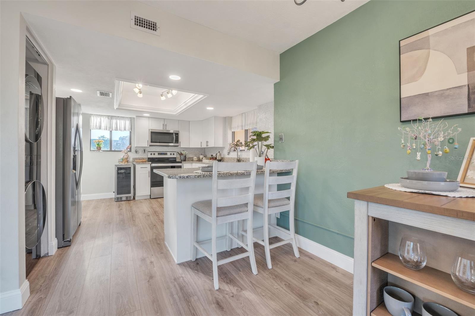 Step into this stunningly updated condominium nestled in the serene Sandpiper Lakes at Pelican Bay, Daytona Beach. This beach lover's paradise boasts a fully renovated two-bedroom, two-bath unit that exudes modern elegance and comfort. Prepare to be impressed by the luxurious upgrades that this home offers. The kitchen shines with stainless steel appliances and sleek granite countertops, perfect for whipping up gourmet meals. Marble countertops in the bathrooms add a touch of sophistication, while the porcelain-tiled bathrooms and entryways provide durability and style. The waterproof laminate flooring throughout the rest of the home ensures easy maintenance and a cohesive look. The airy great room, with its soaring vaulted ceilings accented by wood beams and lighting fixtures, creates a spacious and inviting atmosphere. Enjoy tranquil views of the lush conservation area from every room, or step out onto your private balcony for an even closer connection to nature. Parking is a breeze with one designated space directly in front of the unit, plus additional spaces for guests. Residents of this exclusive golf course community enjoy amenities such as an 18-hole golf course and a cozy pub. And when the call of the waves beckons, you're just a short drive away from Daytona's beautiful beaches, the iconic Daytona Speedway, and the historic Ponce Inlet Lighthouse. Experience the ultimate coastal lifestyle where luxury meets the laid-back charm of beachside living.