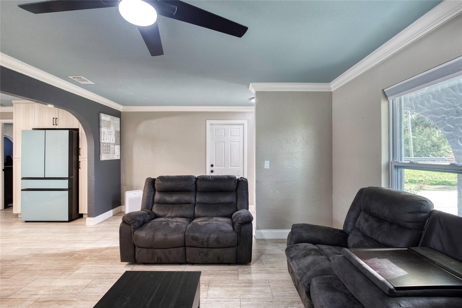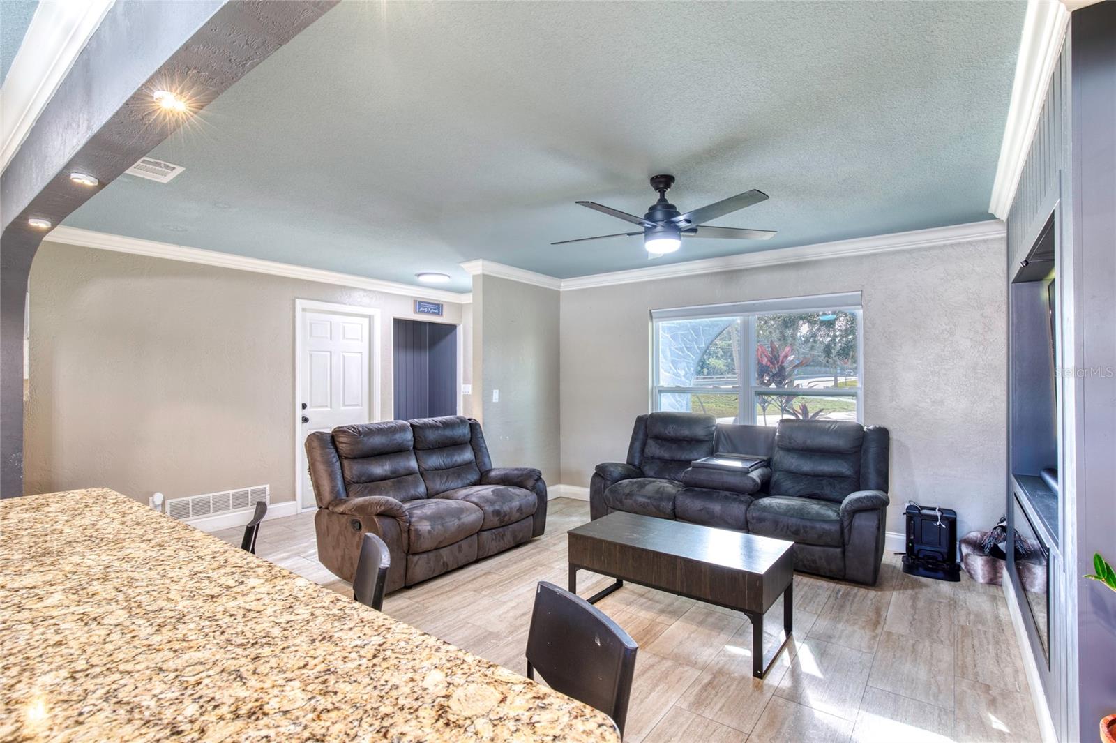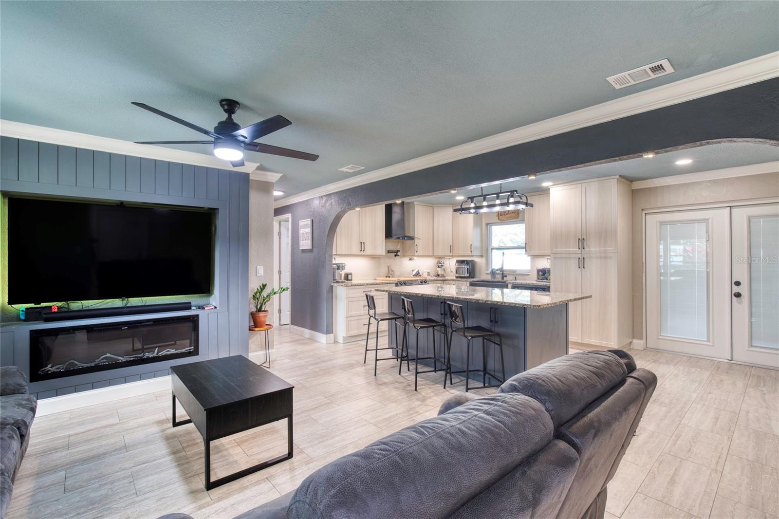 Assumable Mortgage. Step into this beautifully renovated 3-bedroom, 2-bath gem on a spacious corner lot. Enjoy the freedom of no homeowners association (HOA) fees! Inviting open floor plan with modern updates. The interior boasts elegant tile flooring that extends throughout the home, complemented by crown molding and a cozy electric fireplace in the living room, enhanced by new windows that bring in natural light. The remodeled kitchen is a chef's delight, featuring stunning granite countertops and a large island for meal prep and casual dining. Outfitted with under cabinet storage, a wine cooler, stainless steel appliances, a farmhouse sink, and a convenient pot filler by the stove, this space is both functional and stylish. French doors open to a private fenced in backyard, complete with a screened-in patio—perfect for outdoor gatherings or peaceful evenings under the stars. Whether you're starting out, retiring, or looking for an investment, this is the perfect fit! Location? Just moments from the beach, schools, shopping, and dining! Call me for a private showing.
