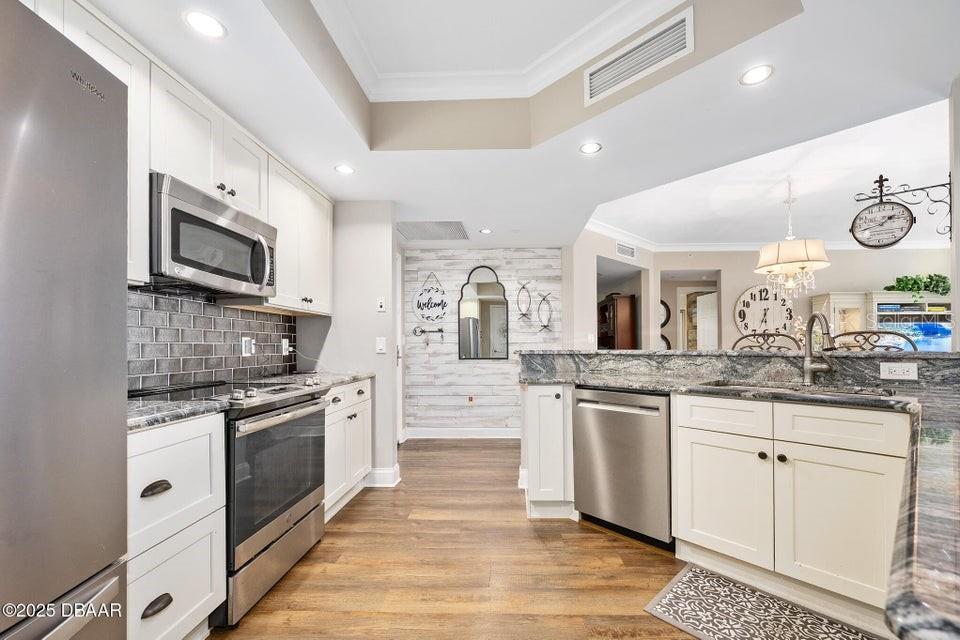 Welcome to your dream river views on the 15th floor! This beautifully renovated 2-bedroom plus office, 2-bath condo offers a perfect blend of modern elegance and serene waterfront living. Step inside a fully furnished layout with luxury vinyl plank flooring, crown molding, and expansive sliders framing breathtaking views of the Intracoastal and three iconic bridges. The gourmet kitchen features granite countertops, stainless steel appliances, and 42-inch cabinets flowing seamlessly into the dining area with a grand chandelier. The spacious family room opens to an oversized balcony ideal for morning coffee or evening sunsets. The primary suite boasts balcony access, a custom walk-in closet, and a spa-like bath with dual vanities, jetted tub, and walk-in tile shower. The second bedroom offers river views, plush carpet, and an updated full bath. A private office/den, in-unit laundry, and pristine condition throughout complete the home. Enjoy maintenance free waterfront living at the fabulous MG on the Halifax and you almost never have to leave the condo! The Marina Grande is an active community, the residents are offered Yoga Classes, Poker Night, Monday Night Football, Coffee Time, Movie Night, Mahjong, Thursday's Food Truck Night, and Grill & Chill with your neighbors. This is More Than a Home; It's the Embodiment of the Florida Lifestyle. Pet-Friendly and Just Minutes from Downtown Daytona Beach, The World's Most Famous Beach, NASCAR Races, and Endless Outdoor Activities. Don't Miss Out on This Incredible Opportunity!