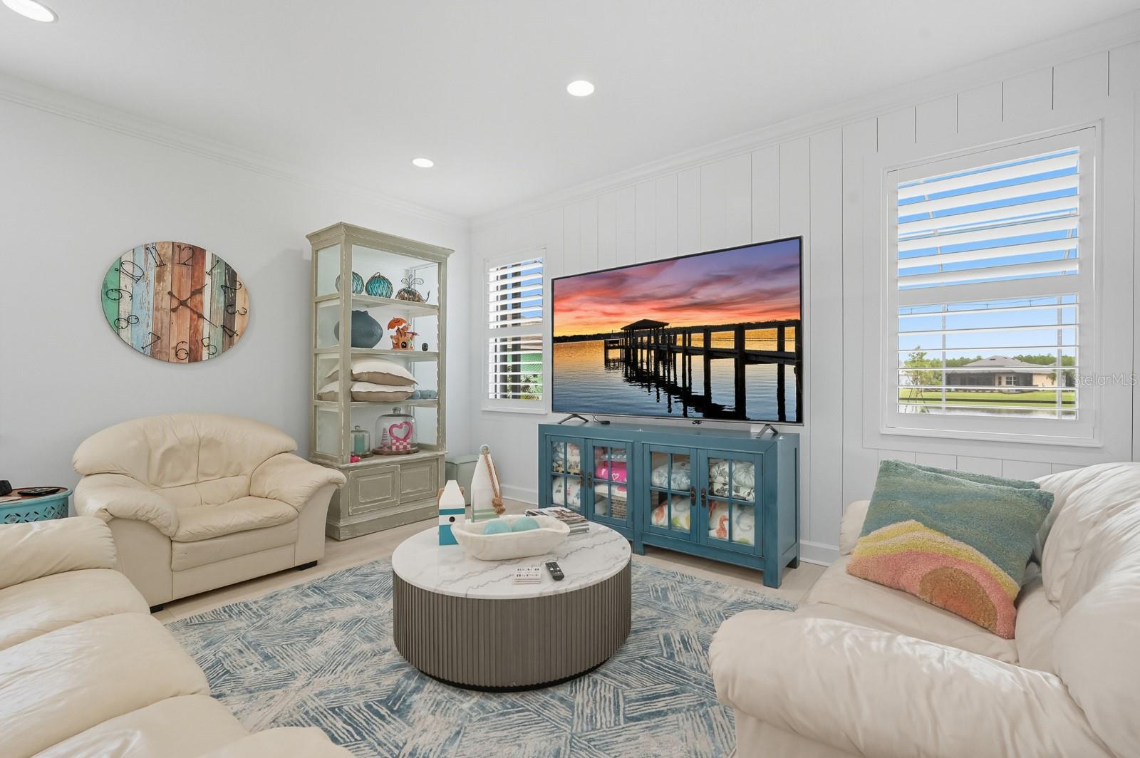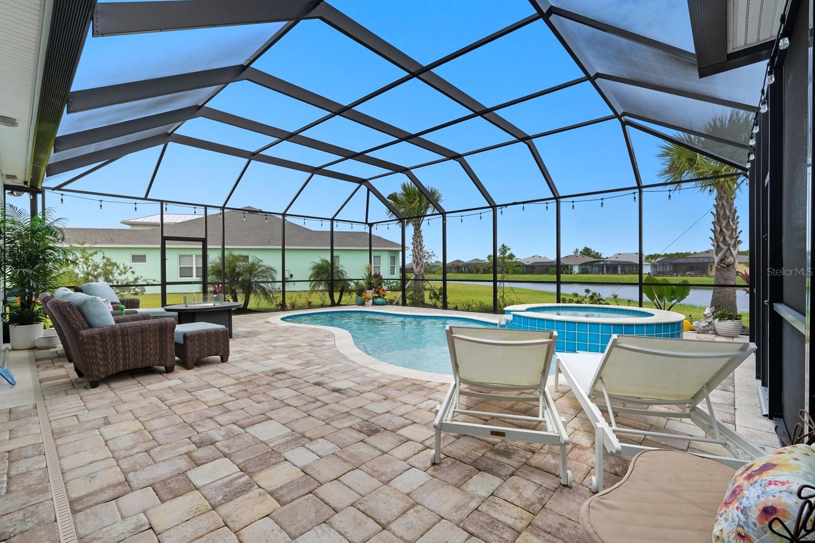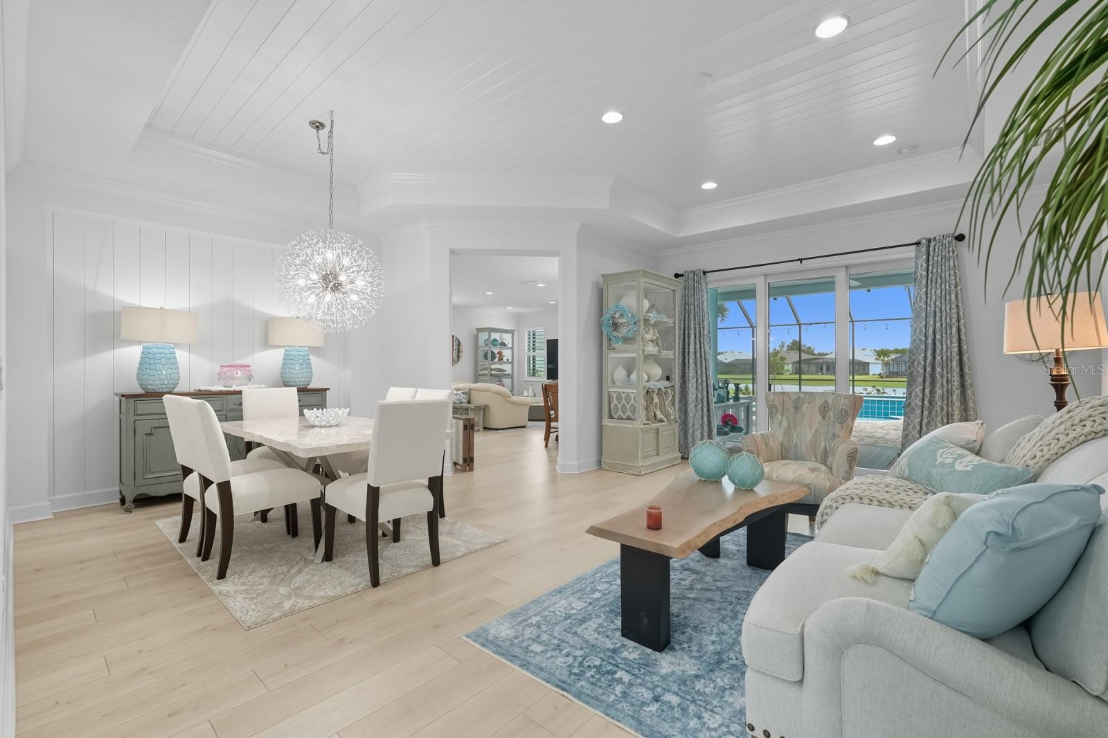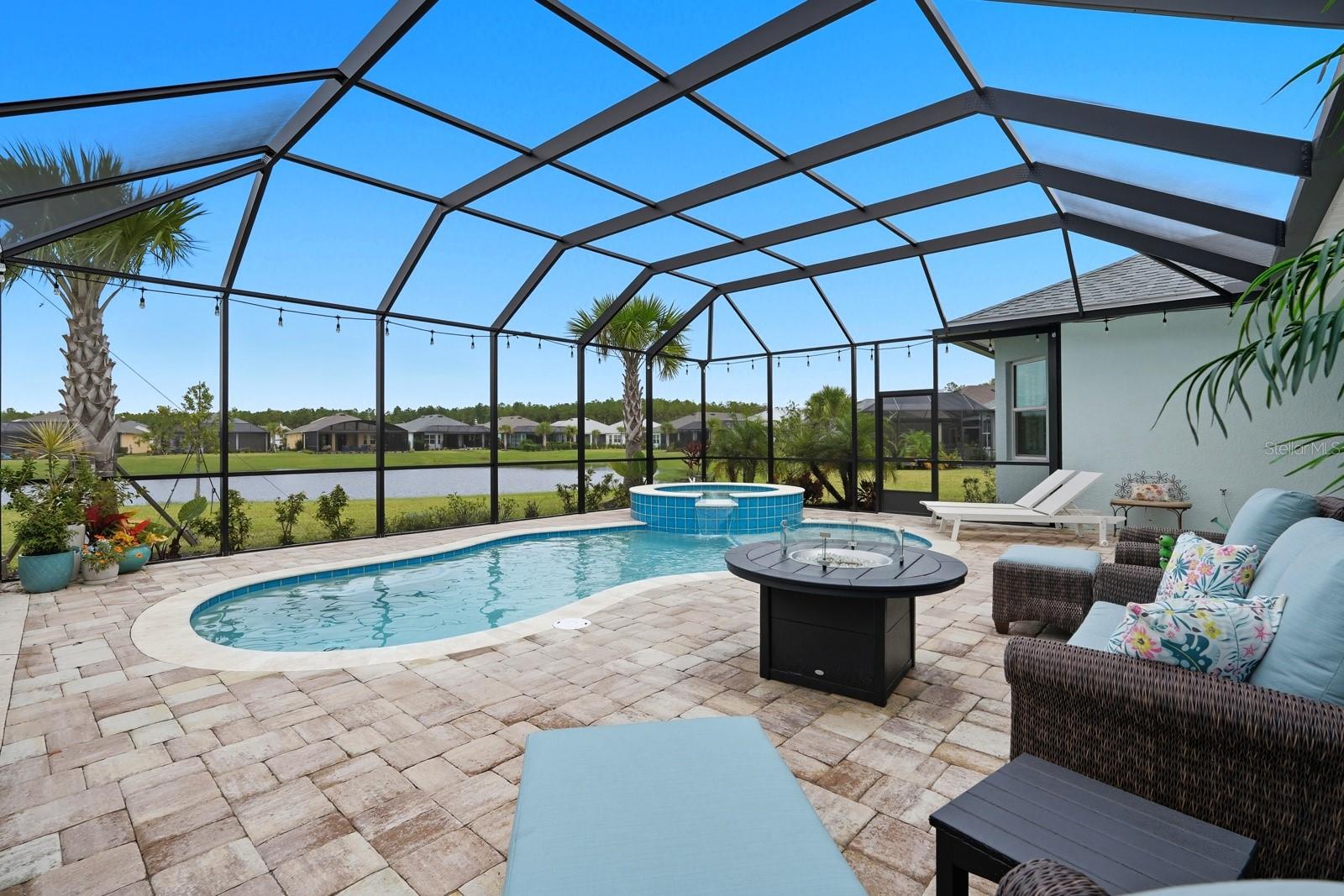 Welcome to this stunning coastal designed Trinidad model in Margaritaville Daytona Beach. Thoughtfully upgraded inside and out, this home blends beach area coastal living with luxurious finishes throughout. Perfectly positioned on an oversized lot near the cul-de-sac on a pond. Inside, enjoy 9 ft doors, LVP floors(tile in the bathrooms) insulated block walls, white custom shutters, crown molding and recessed lighting in all rooms. The foyer includes a coastal chandelier, crown molding and Shiplap creating a beautiful entryway. The office/flex room has elegant glass French doors making it perfect for the remote office. Complete with a dry bar, custom cabinets and quartz countertop. The chef’s kitchen features a massive quartz island to match the white level 5 soft close cabinets. Including crown molding, pull out shelving, under cabinet lighting and kitchen aid appliances. A double trash pullout, custom vented hood and upgrade Moen faucet complete the space. The living room/ dining room space includes crown molding and Shiplap on the ceiling and accent wall. Top it off with a stunning Arhaus chandelier. The primary suite is a showstopper with crown molding, accent beams, recessed lighting with reading lights, pocket doors and a gorgeous pond view. The spa like bathroom is outfitted with frameless glass, zero entry rain head shower, pebble flooring, quartz counters, Level 5 soft close cabinetry and upgraded fixtures. The guest suites and laundry room are fully upgraded with crown molding, quartz countertops, level 5 soft close cabinets for storage and deep sinks. The 3 car garage has insulated block walls, epoxy flooring, smart openers with cameras and plywood in the insulated attic space for storage. Outback, the 24 x 15 ft Salt water pool and hot tub includes a heater/chiller, hot tub with waterfall, sun shelf, bubbler and LED lighting pool and hot tub. Covered lanai with entry doors on both sides of pool and Gorgeous landscaping for privacy including robellini and palm trees and flowering shrubs. With 3 bedrooms, 3.5 plus an office/flex space this home boasts 2,564 soft of living space( 3,407 total). Schedule your private showing today.
