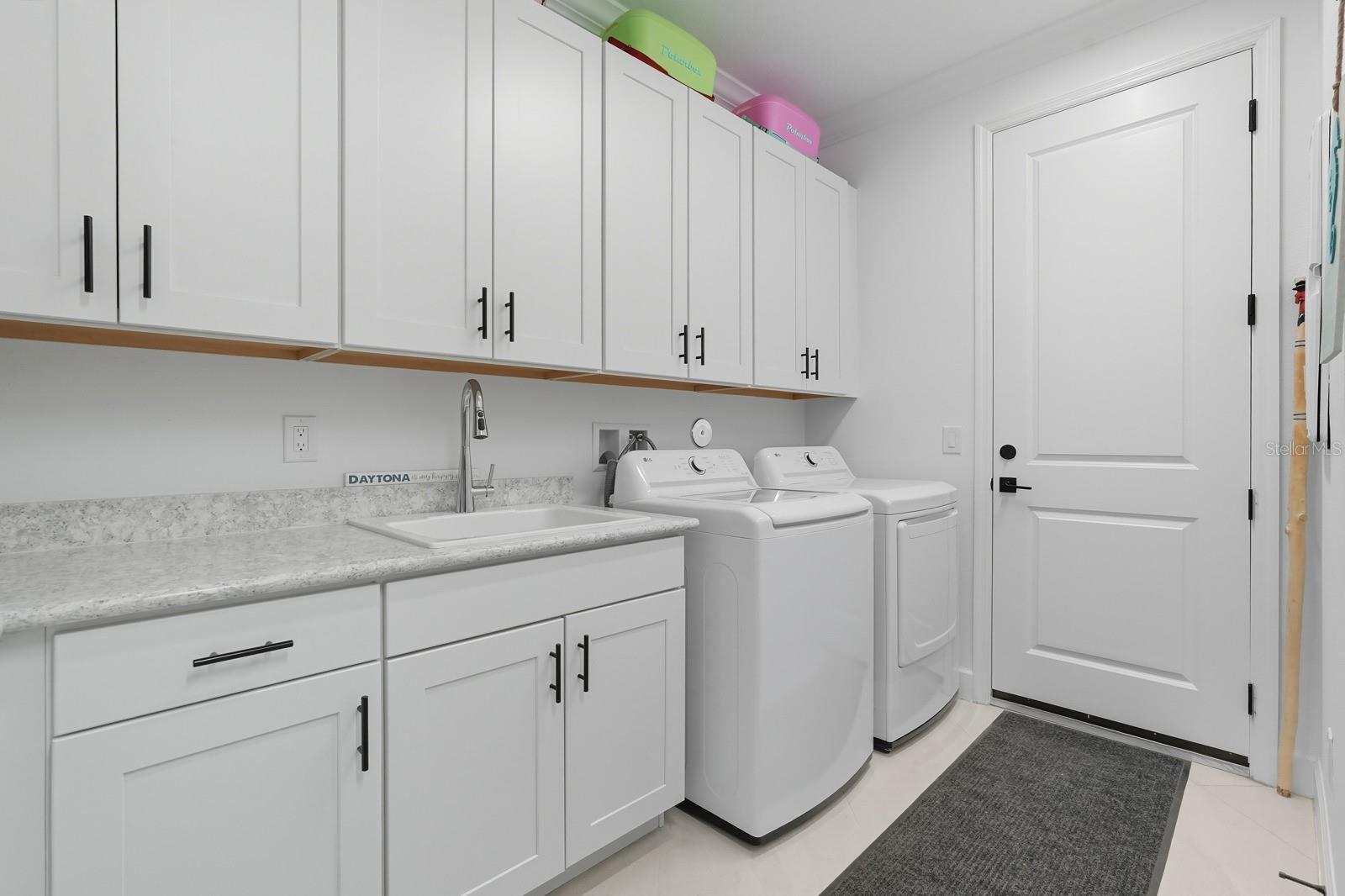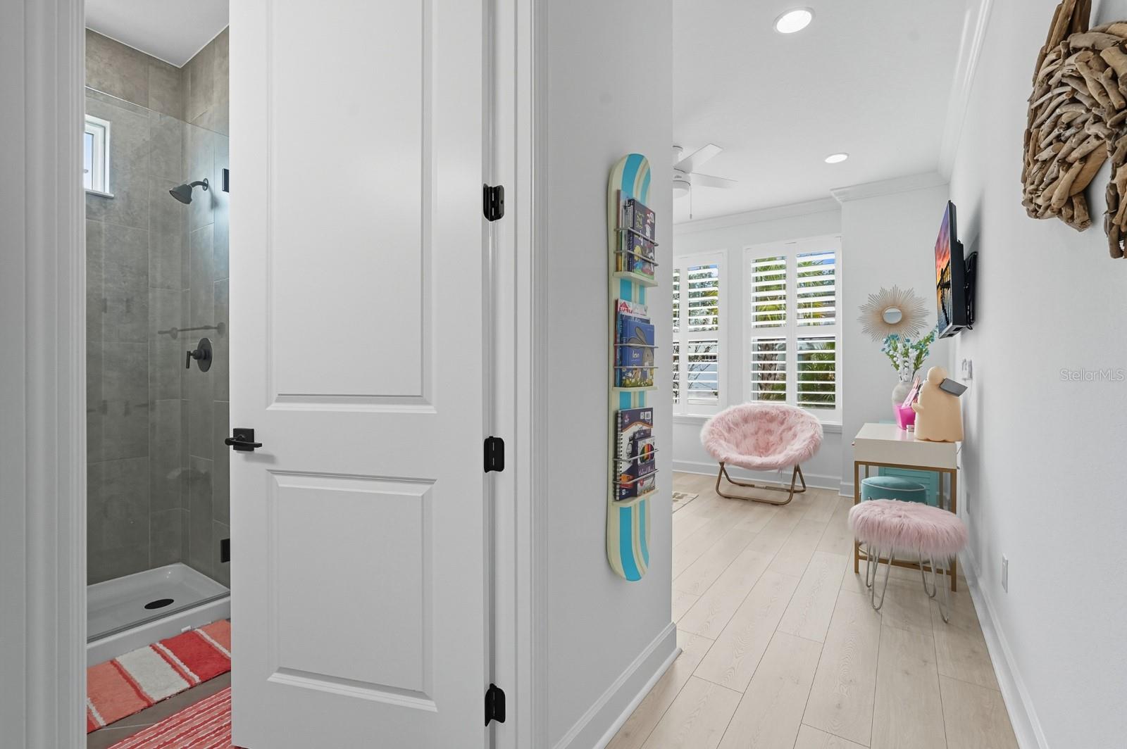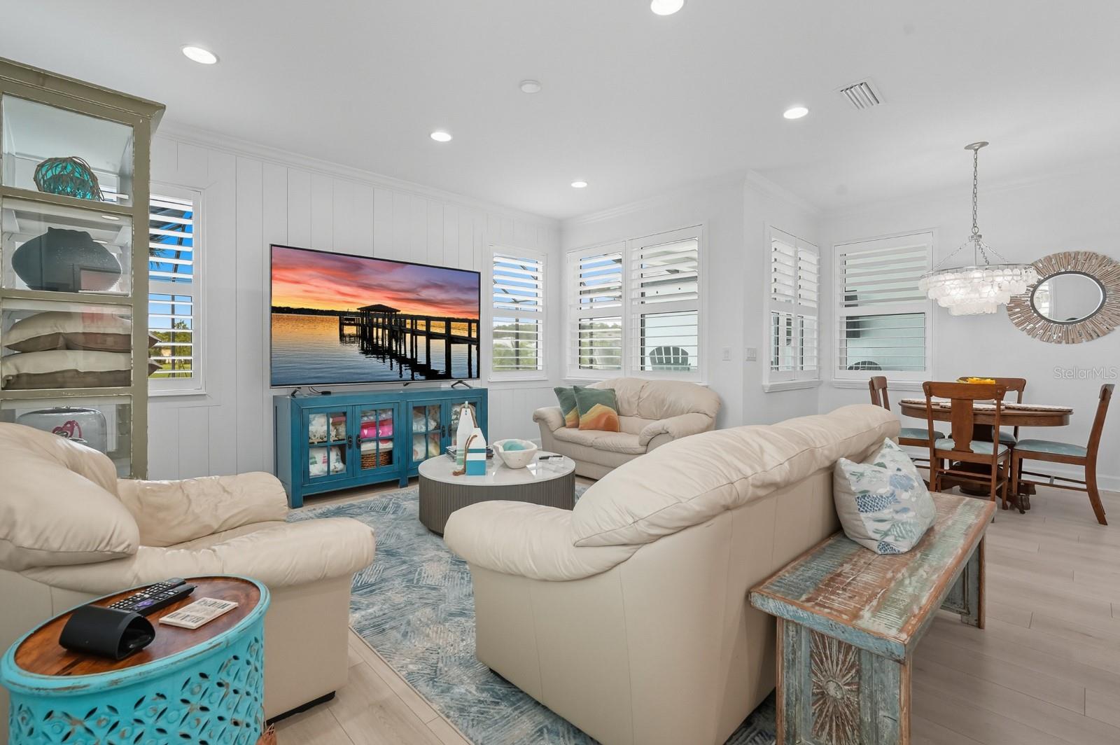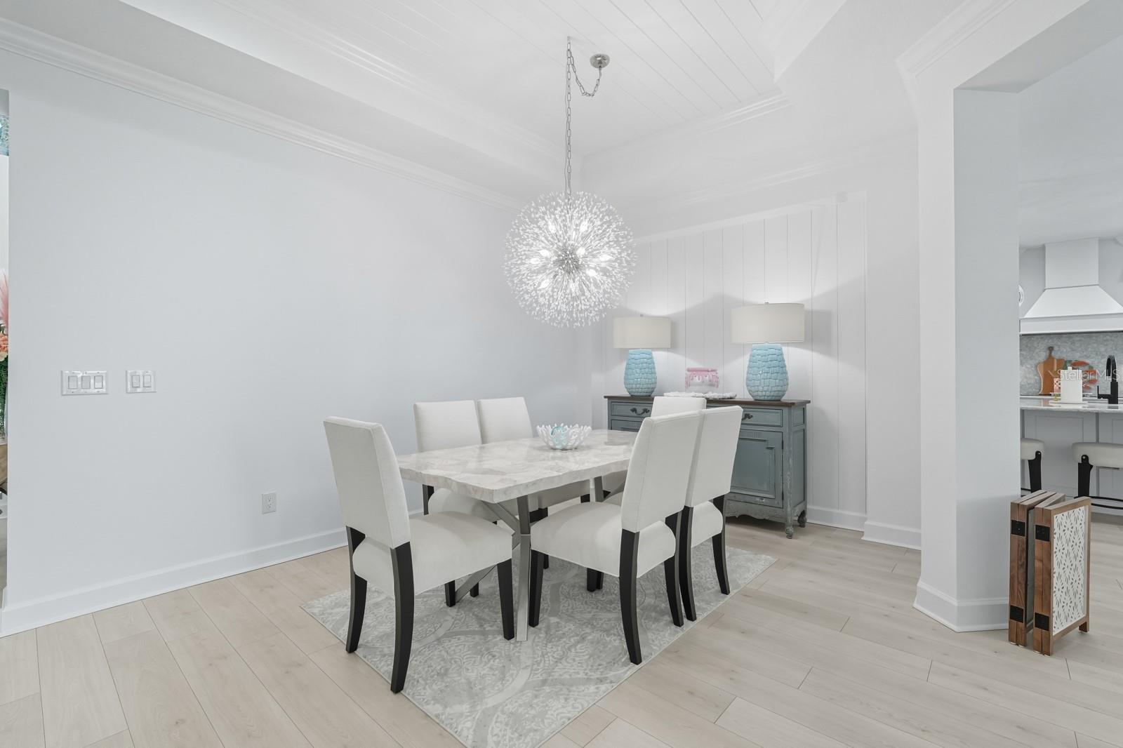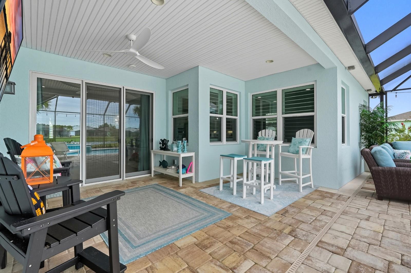 Welcome to this stunning coastal designed Trinidad model in Margaritaville Daytona Beach. Thoughtfully upgraded inside and out, this home blends beach area coastal living with luxurious finishes throughout. Perfectly positioned on an oversized lot near the cul-de-sac on a pond. Inside, enjoy 9 ft doors, LVP floors(tile in the bathrooms) insulated block walls, white custom shutters, crown molding and recessed lighting in all rooms. The foyer includes a coastal chandelier, crown molding and Shiplap creating a beautiful entryway. The office/flex room has elegant glass French doors making it perfect for the remote office. Complete with a dry bar, custom cabinets and quartz countertop. The chef’s kitchen features a massive quartz island to match the white level 5 soft close cabinets. Including crown molding, pull out shelving, under cabinet lighting and kitchen aid appliances. A double trash pullout, custom vented hood and upgrade Moen faucet complete the space. The living room/ dining room space includes crown molding and Shiplap on the ceiling and accent wall. Top it off with a stunning Arhaus chandelier. The primary suite is a showstopper with crown molding, accent beams, recessed lighting with reading lights, pocket doors and a gorgeous pond view. The spa like bathroom is outfitted with frameless glass, zero entry rain head shower, pebble flooring, quartz counters, Level 5 soft close cabinetry and upgraded fixtures. The guest suites and laundry room are fully upgraded with crown molding, quartz countertops, level 5 soft close cabinets for storage and deep sinks. The 3 car garage has insulated block walls, epoxy flooring, smart openers with cameras and plywood in the insulated attic space for storage. Outback, the 24 x 15 ft Salt water pool and hot tub includes a heater/chiller, hot tub with waterfall, sun shelf, bubbler and LED lighting pool and hot tub. Covered lanai with entry doors on both sides of pool and Gorgeous landscaping for privacy including robellini and palm trees and flowering shrubs. With 3 bedrooms, 3.5 plus an office/flex space this home boasts 2,564 soft of living space( 3,407 total). Schedule your private showing today.