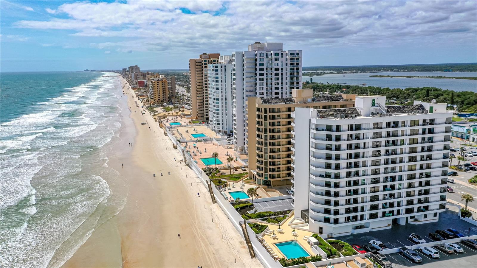 Welcome to paradise! Enjoy beachfront living at its finest in this beautifully remodeled two-bedroom, two-bath condo perfectly situated in the heart of Daytona Beach Shores. Located on the fourth floor with stunning ocean views, this fully furnished unit is move-in ready. Just bring your friends or family and start enjoying the beach lifestyle you've been dreaming of! The entry greets you with updated LVP flooring and an open floorplan. The spacious master suite features a large walk-in closet, while the additional bedroom and bathroom provide plenty of comfort for guests. Enjoy the convenience of in-unit laundry, making coastal living as easy as it is beautiful! Start your day with morning coffee and unwind with evening cocktails on your private balcony, all while taking in the serene ocean views! The condo building offers a spectacular oceanfront pool with a generous lanai, perfect for soaking up the sun, as well as an indoor pool and spa for those occasional chilly days. Exercise room and community room as well! Whether you are looking for a primary residence, vacation getaway, or income producing property, this condo offers the perfect blend of comfort, convenience, and coastal charm. Walking distance to shopping, family fun activities, and restaurants. A must see!