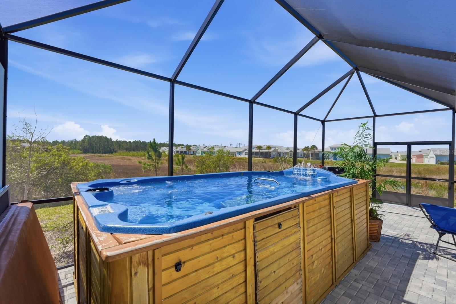 Rare premium corner lot home in Latitude Margaritaville with preserve views, no neighbors on three sides, and nightly sunset exposure. This beautifully upgraded Antigua model offering 1,563 square feet is perfectly positioned on the amenity side of the community, just moments from world class resort-style living. Located near the 24/7 gated entrance with manned security, you’ll enjoy both convenience and peace of mind. Inside, the home showcases upgraded flooring throughout, 8 foot doors, tray ceilings, and designer chandeliers that elevate the open-concept layout. The kitchen and bathrooms feature quartz countertops, upgraded cabinetry, and plantation shutters for a clean, modern finish. The flexible den with double doors is ideal for a home office or guest space. Step outside to the expanded lanai, one of the home’s standout features, complete with a remote-controlled retractable sunshade, double access doors for golf cart storage, and an energy efficient swim spa. It’s the perfect private setting to relax, entertain, and take in stunning sunset views. All of this just minutes from pools, fitness center, dining, and live entertainment, making this one of the most desirable homes in Latitude Margaritaville.