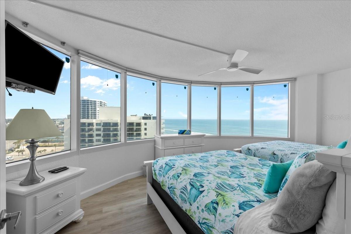 Beautiful Ocean views will greet you each morning from this Peck Plaza condo or reminisce during the evenings watching the array of color during the sun set on the balcony. Unforgettable views are visible from living room and bedrooms. Entire unit is tastefully decorated with a peaceful palette. Living room has wall mounted flatscreen tv, pullout couch dining table and ceiling fan. Primary Bedroom is spacious with a private bathroom, king size bed, ceiling fan and walk in closet. The guest bedroom boasts of two queen beds, ceiling fan and ocean view. This unit sleeps 8 and has the perfect setup to use as a vacation rental allowing weekly rentals. The Amenities abound at Peck Plaza offering ocean front pool, spa, tennis courts, fitness center, social room and Top of Daytona restaurant on the top floor. This 11th floor condo has been renovated and is fully furnished and just waiting for your arrival.
