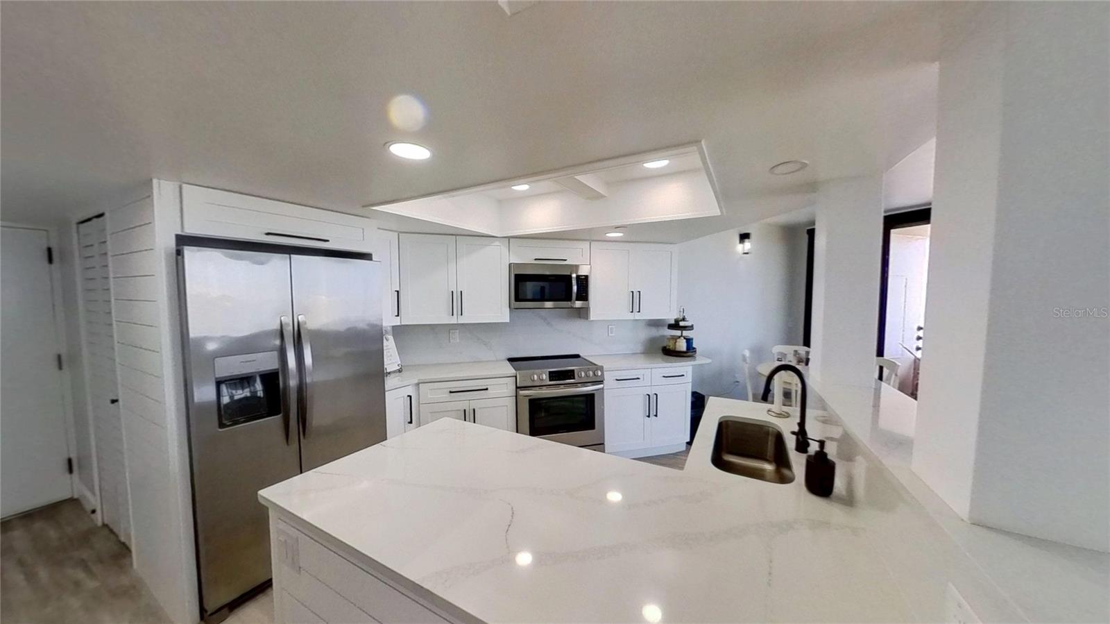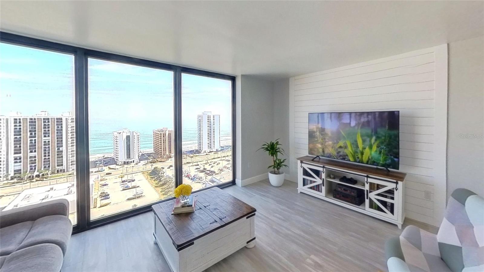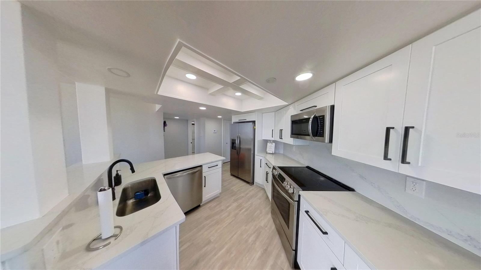 Luxury condo. This top floor fully remodeled unit. Top floor Amazing panoramic views of the sunrise from 2 private balconies, or from the open concept kitchen and living room. High quality waterproof flooring throughout. Soft close kitchen cabinets and drawers with quartz countertop and backsplash. All new lighting and fixtures throughout. Bathroom is right out of a design magazine with the perfect blend of colors and a shiplap wall. Shower features a frameless glass sliding door. Walking distance to the beach, Publix grocery store, Multiple Banks, Walgreens, and an Urgent Care. Building backs up to a golf course and overlooks tennis courts. Building also offers on site management, social meeting rooms, library, Ping pong course, Tennis course heated pool, sauna, and fitness center. New appliances. Washer and Dryer in every floor. Unloading area, Bicycle and Motorcycle area. Note: MLS information is considered accurate but not guaranteed. Buyers should independently verify all details.