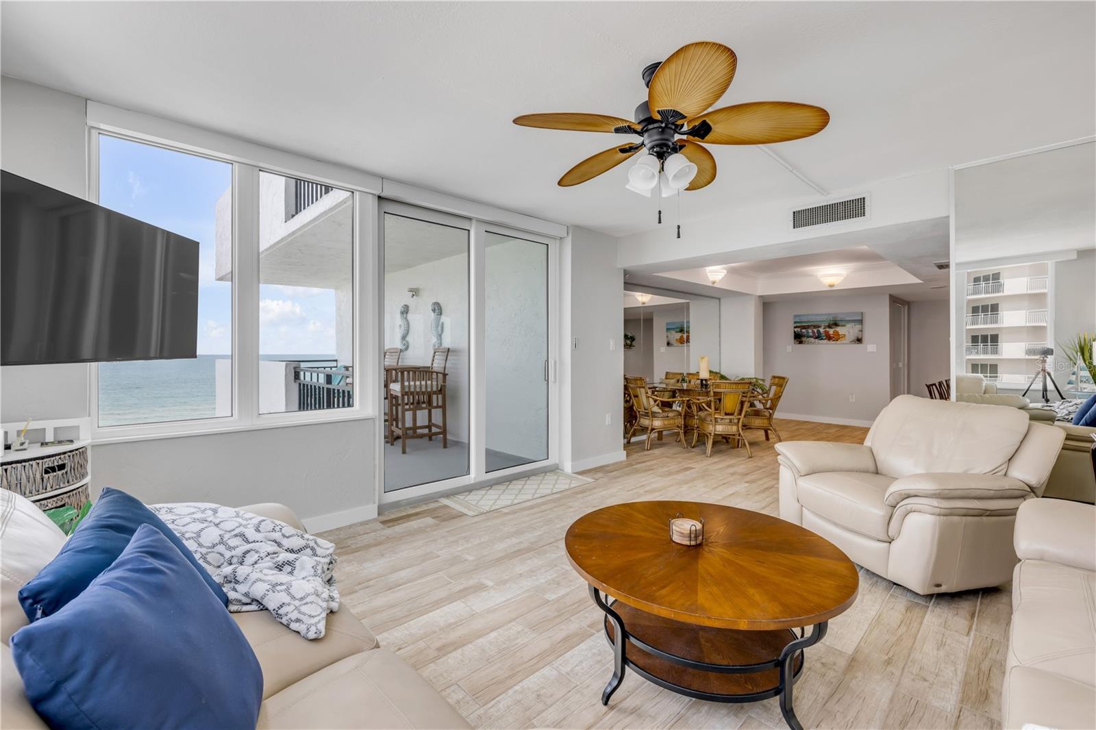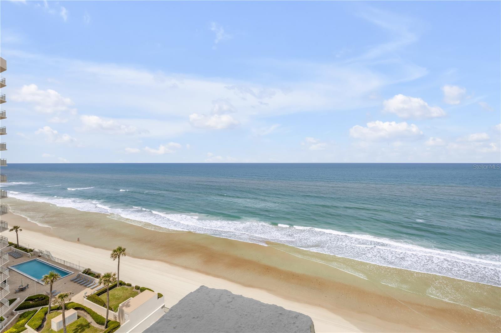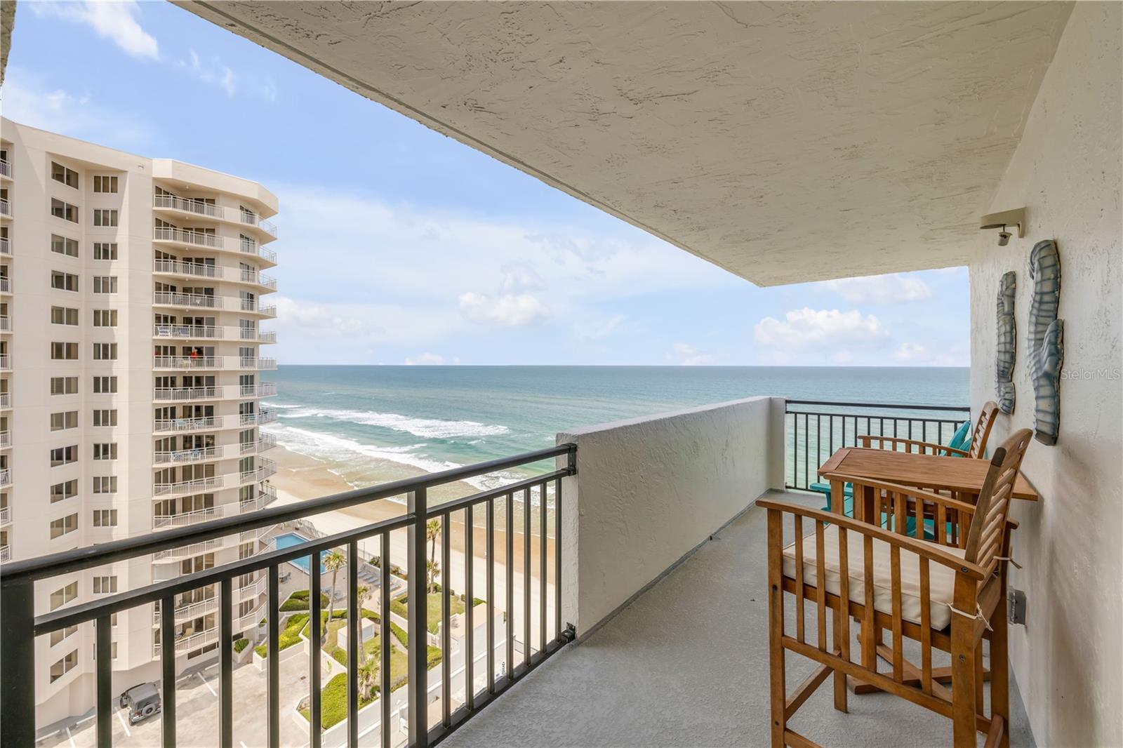 Direct oceanfront condo home with breathtaking ocean views can be yours! This fully furnished, upgraded home on the 11th-floor sits on the pristine white sands of Daytona Beach Shores. This showstopping 2-bedroom, 2-bathroom residence spans 1,200 square feet and comes fully furnished with high-end finishes throughout. Recent updates include kitchen and bathrooms, $40,000 worth of hurricane-rated windows and sliders in 2023, remote-control blinds, 2021 hot water heater, and luxury vinyl flooring throughout - every detail carefully designed to enhance both style and comfort. The gourmet kitchen is a true centerpiece, featuring cabinetry with elegant rope detailing, granite countertops, stainless steel appliances, a gooseneck faucet, recessed lighting, and a spacious island that opens to the living area making it perfect for entertaining or family gatherings. Both bedrooms offer uninterrupted ocean views, while the master suite includes a fully tiled bathroom with wood cabinetry, granite counters, and a sleek glass-enclosed shower. This pet-friendly condo (1 pet up to 25 lbs) is part of the highly desirable Oceans Five community, offering premium amenities such as a heated outdoor pool with an expansive sun deck, BBQ area, shuffleboard courts, saunas, social room, fitness center, beautifully appointed library, pool table lounge, private storage, underground parking, and direct beach access. Ideally located near shopping and restaurants and within minutes from the iconic Ponce Inlet Lighthouse, this is coastal living at its finest. This rare opportunity will not last long, schedule your showing today!